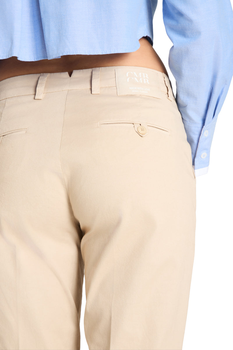 Deze stijlvolle chino is een perfecte mix van comfort en klasse. De broek heeft een slanke, rechte pasvorm en valt tot op de enkel, wat zorgt voor een moderne en vrouwelijke uitstraling. De neutrale beige tint maakt dit model eindeloos combineerbaar, van een casual look met sneakers tot een meer geklede outfit met loafers of hakken.