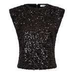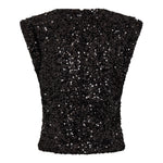Roslyn is een zwarte sequin mouwloze top met schoudervullingen. De top is leuk voor de feestdagen, maar ook casual te dragen met bijvoorbeeld een jeans en een blazer.