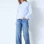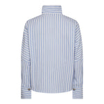 Gestreepte blouse van Co´Couture in lichtblauw, blauw en wit met een asymmetrisch knoopdetail langs de linkerschouder.