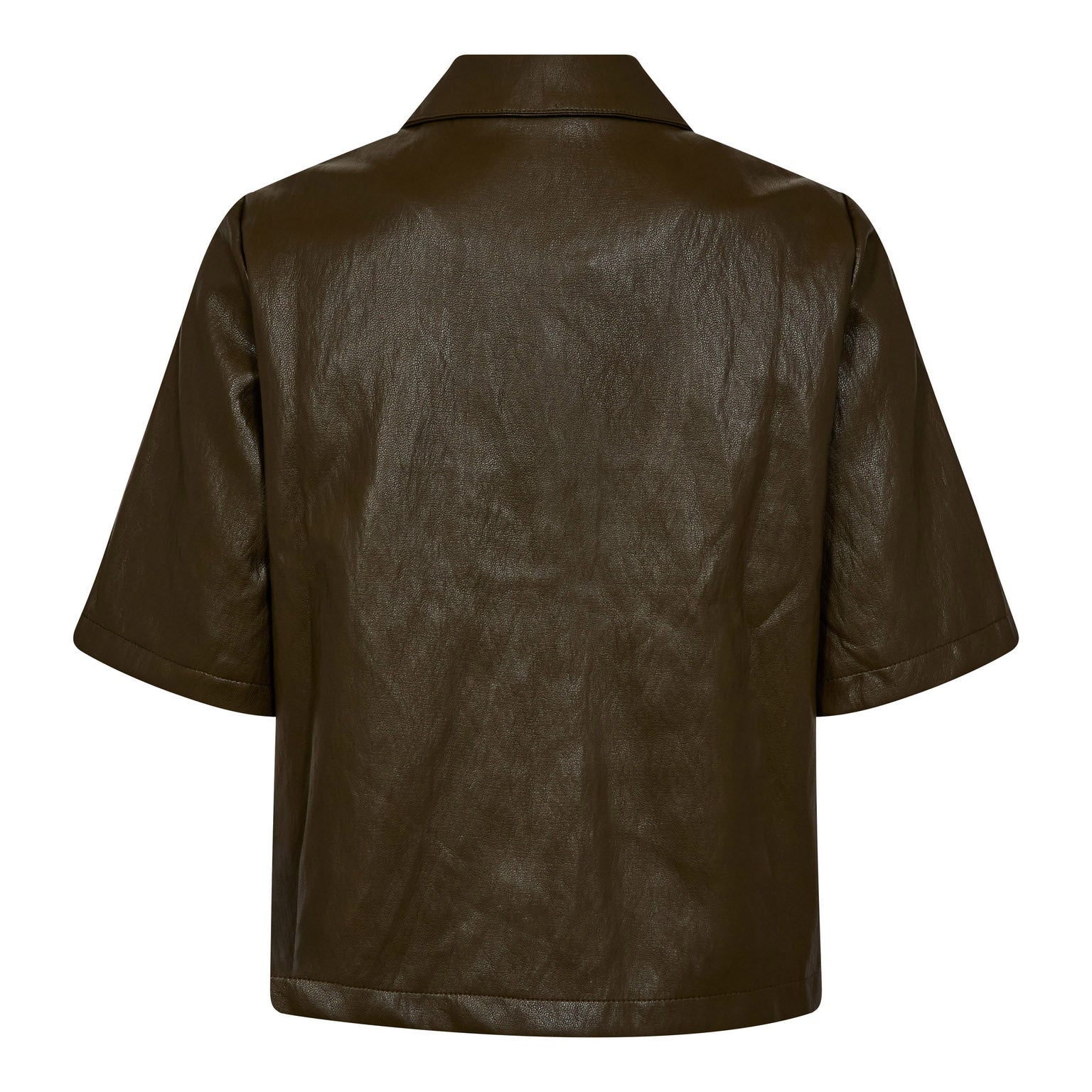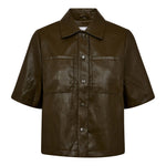 Deze donkerbruine faux leather blouse van Co’Couture heeft een stoere, maar vrouwelijke uitstraling. Het model met korte mouwen, klassieke kraag en drukknopen geeft een moderne twist aan een tijdloos design. Perfect om los te dragen op een jeans of als statement piece in een layered look.