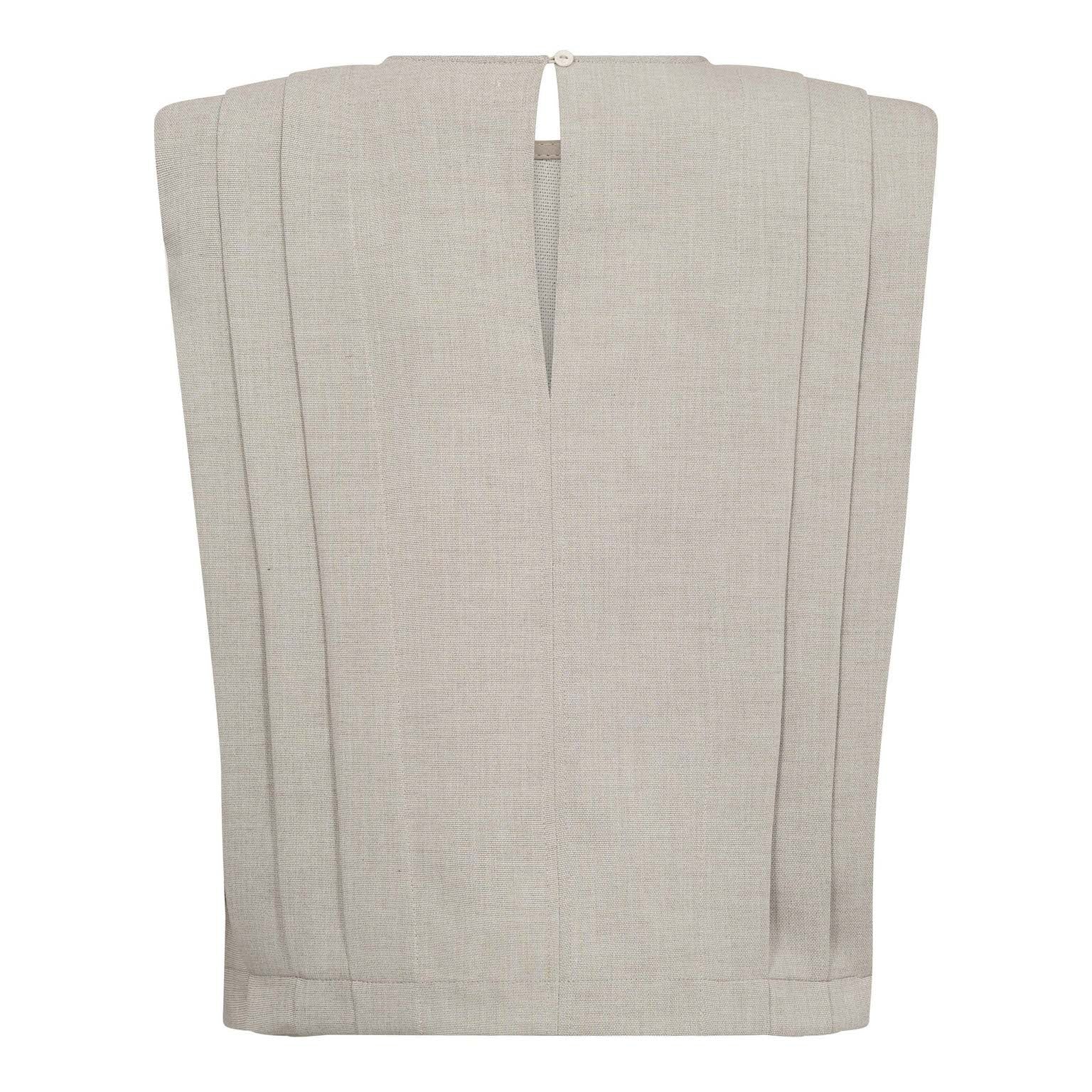 Deze elegante top in een natuurlijke zandtint straalt pure eenvoud en klasse uit. Het mouwloze model is voorzien van subtiele schoudervullingen die zorgen voor een krachtig, modern silhouet. De rechte pasvorm en minimalistische afwerking maken dit item een tijdloze toevoeging aan je garderobe.