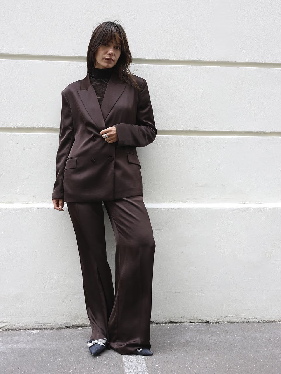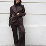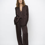 De Jules broek in Espresso Brown is een tijdloze essential. Deze flatterende stijl is gemaakt van 100% gerecycled polyestersatijn met mechanische stretch. De subtiele kreukeffecten in de stof geven diepte en karakter aan je look. De broek heeft een hoge taille met plooien aan de voorkant en een elastische tailleband achter voor extra draagcomfort. Het model op de foto is 1,78 m lang en draagt onze maat 36