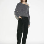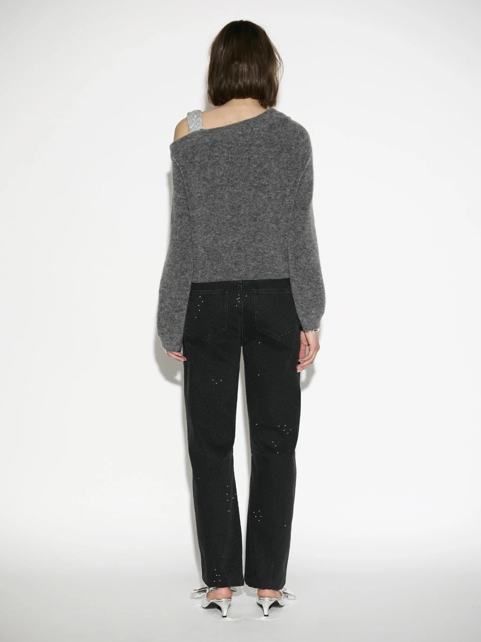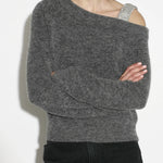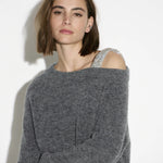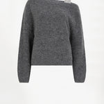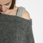 Voeg de Yonka Glam trui in Dark Heather Grey toe aan je garderobe dit seizoen. Gemaakt van een supersofte alpaca-merino wolblend. De off-shoulder halslijn met één bandje vol fonkelende steentjes maakt deze knit extra bijzonder. Een vrouwelijke en comfortabele trui met feestelijke glamour.