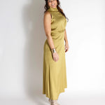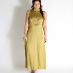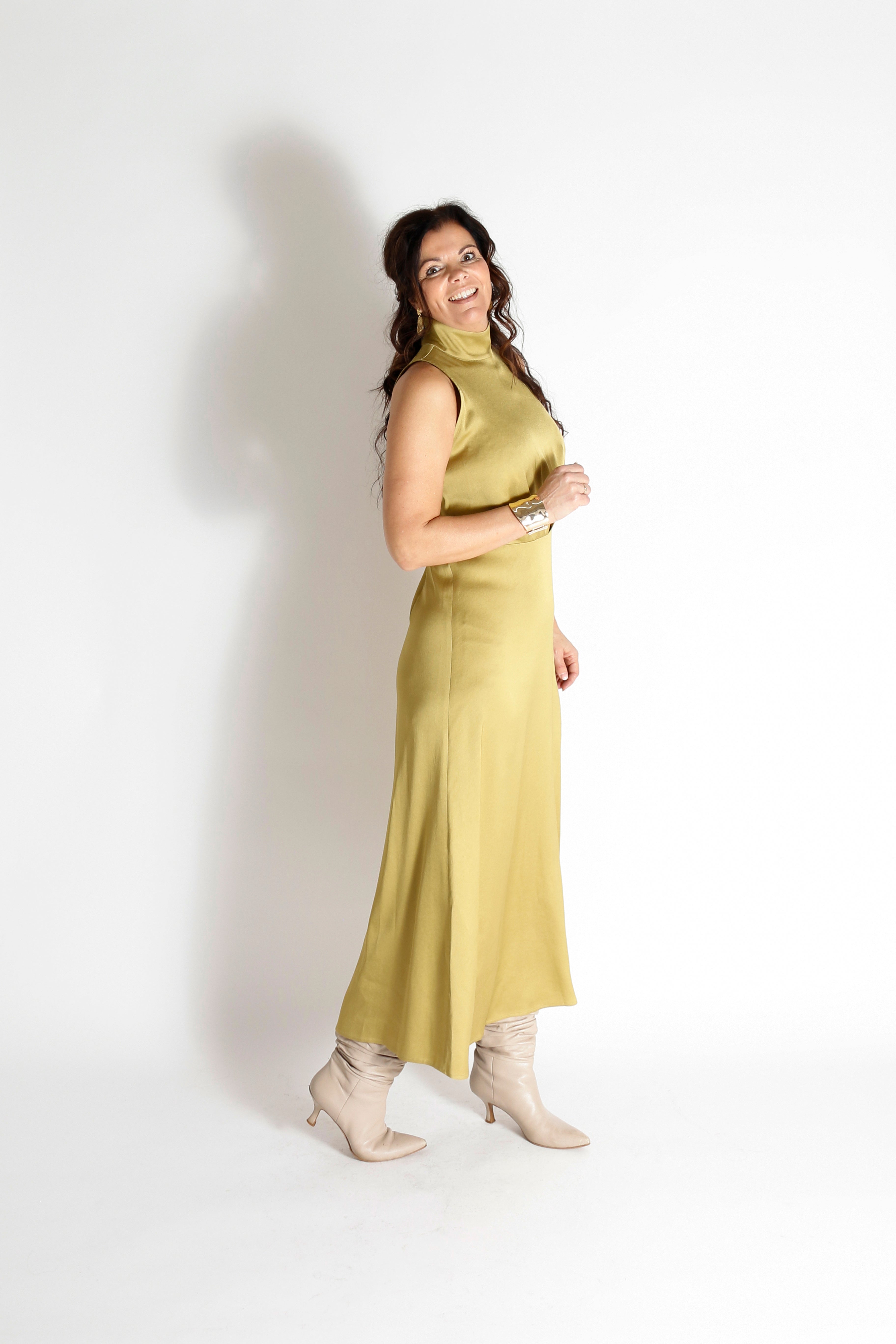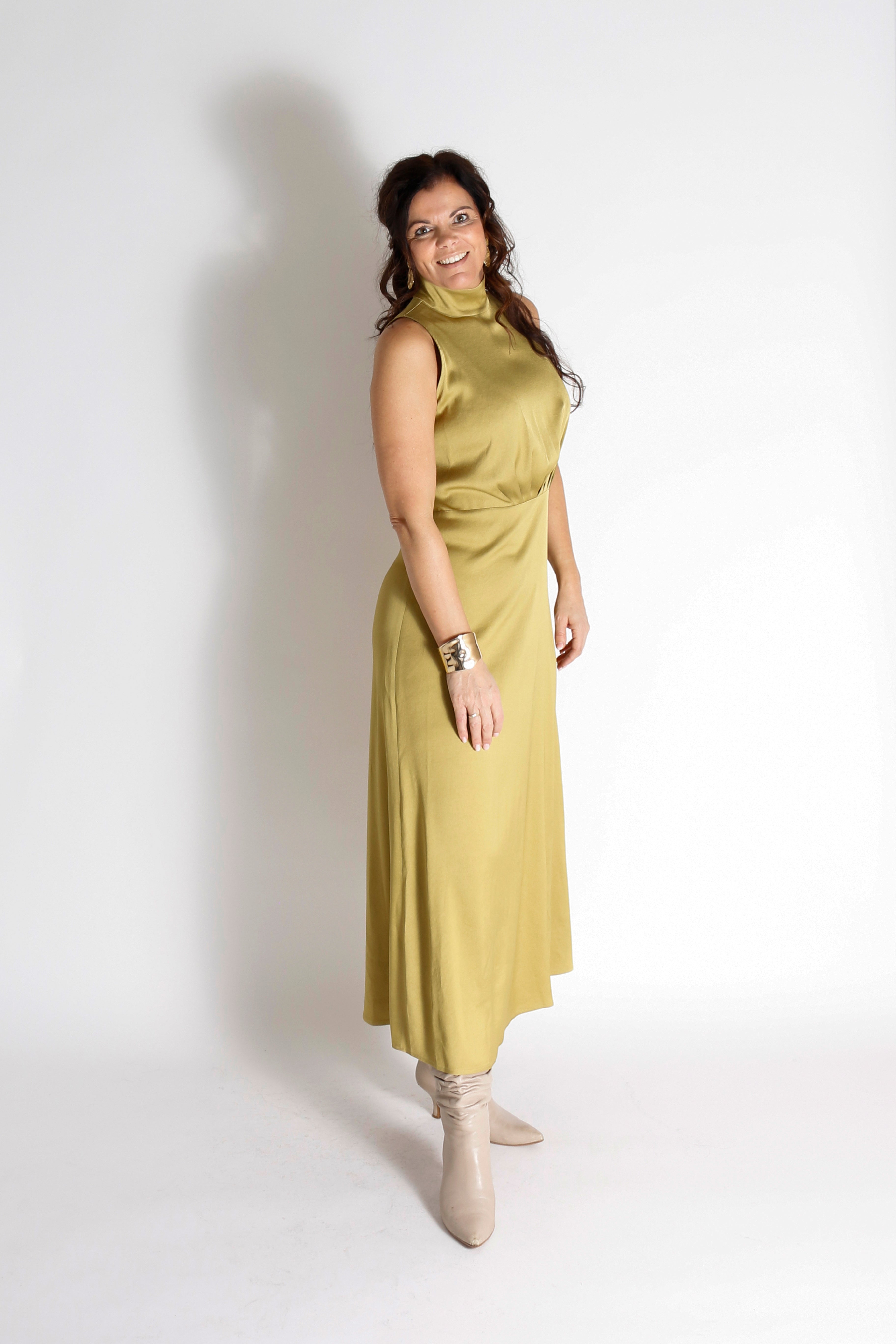 De AMABEL Maxi Jurk is een mouwloos ontwerp met een klassieke pasvorm, in de taille geaccentueerd door een horizontale naad en voorzien van subtiele plooien bij de buste. De hoge, opstaande kraag en de licht uitlopende rok geven de jurk een elegante uitstraling. Gemaakt van acetaat en elastaan, heeft de stof een luxueuze glans en een soepel, vloeiend draaggevoel.