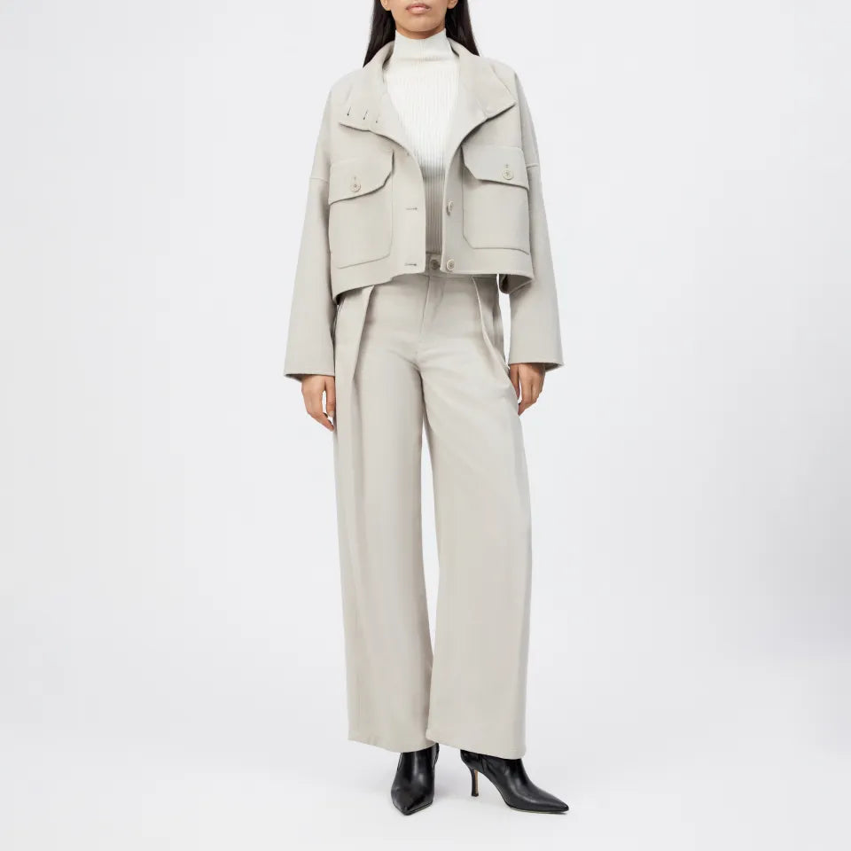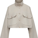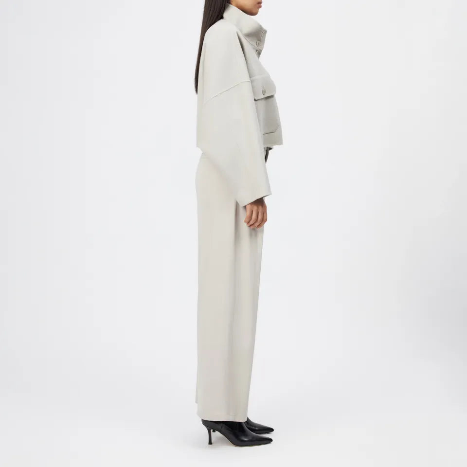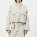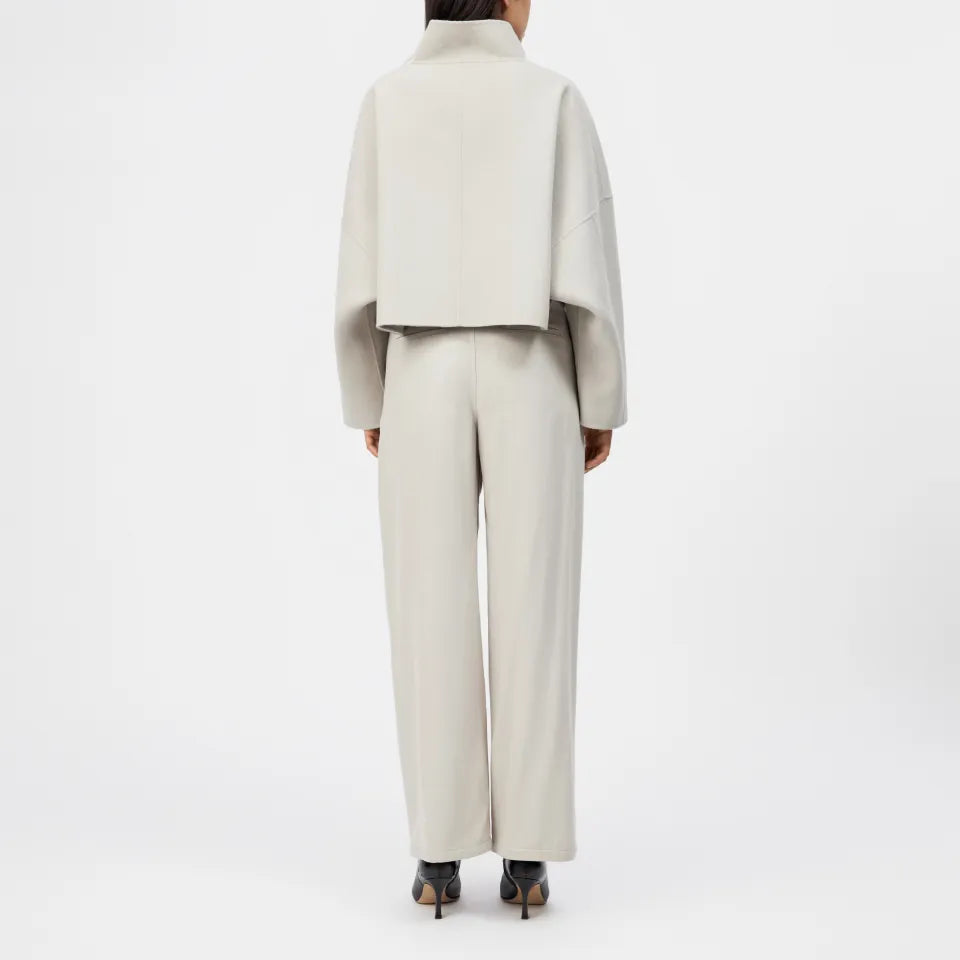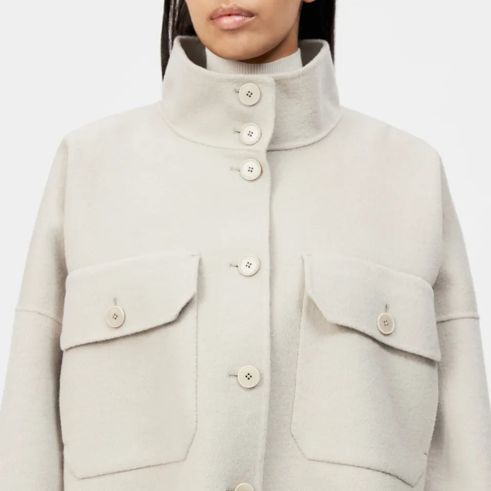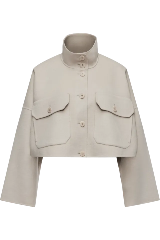 ARKLOW is een ongevoerd, kort jasje met een oversized boxy silhouet. De opstaande kraag, wijde vleermuismouwen en grote borstzakken bepalen de moderne look. De normale mouwlengte zorgt voor evenwichtige proporties. De luxe doubleface is gemaakt van een hoogwaardige wolmix en voelt warm en aangenaam aan. Het model is 178cm lang en draagt maat 2.