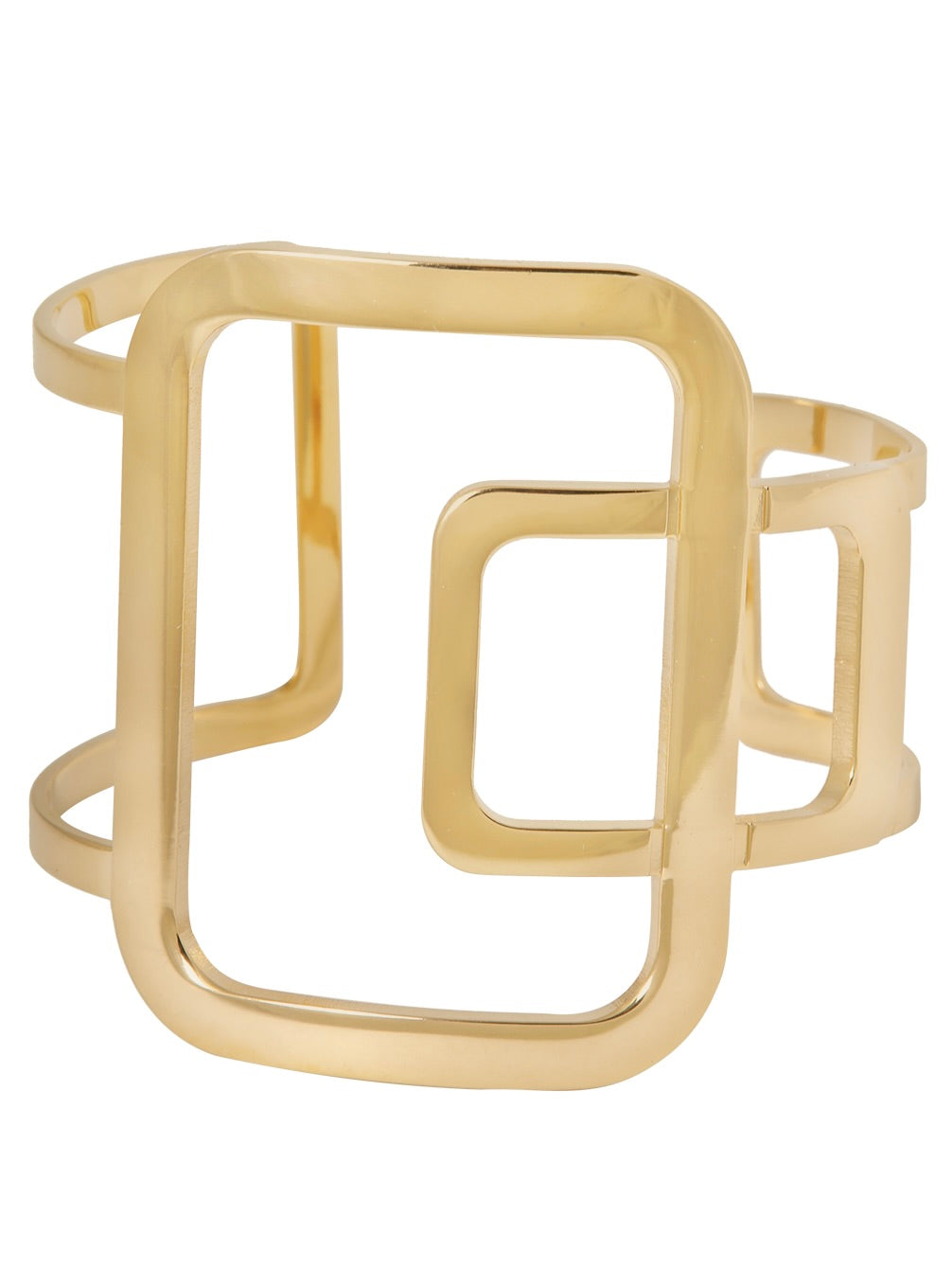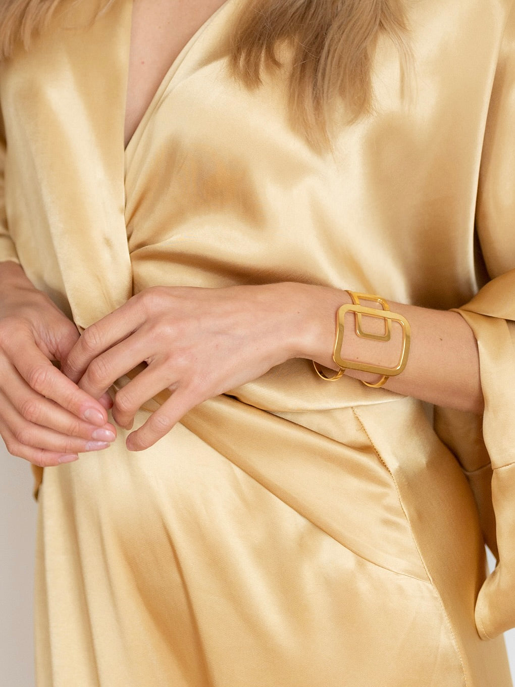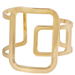 Vergulde bangle in maat verstelbaar. Goldplating op longlasting stainless steel. De breedte van de armband is 5.5cm.