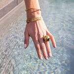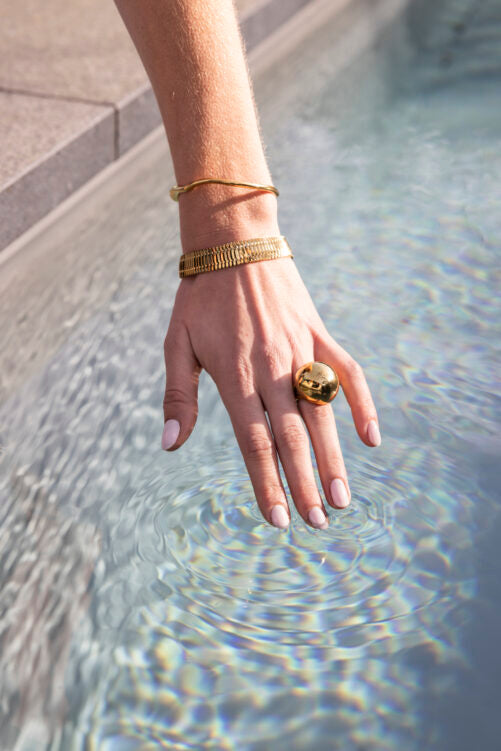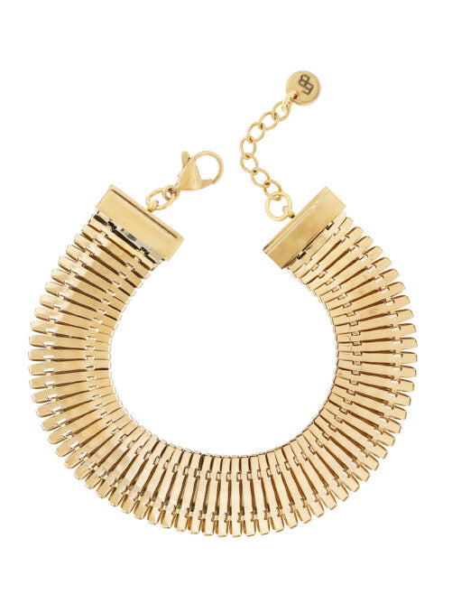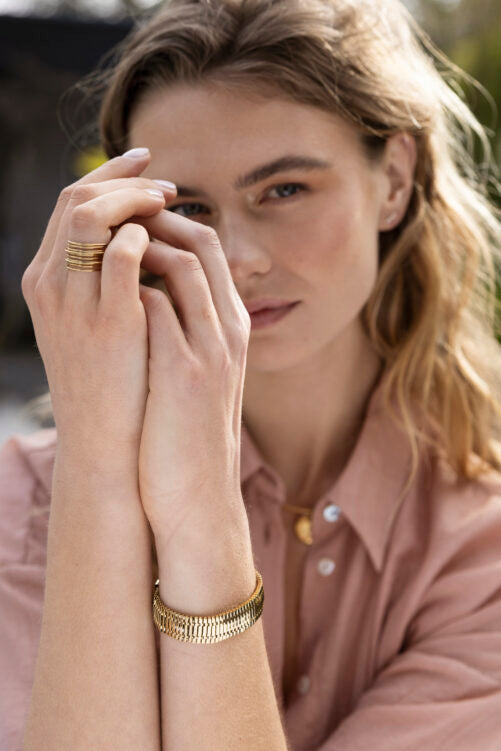 Prachtige brede gouden armband met een soepel en vloeiend ontwerp zodat deze elegant om de pols valt. Dankzij het verlengkettinkje kun je de lengte van de armband gemakkelijk aanpassen zodat deze altijd past .De armband heeft een breedte van 1.4 cm. Verguld op long-lasting stainless steel.