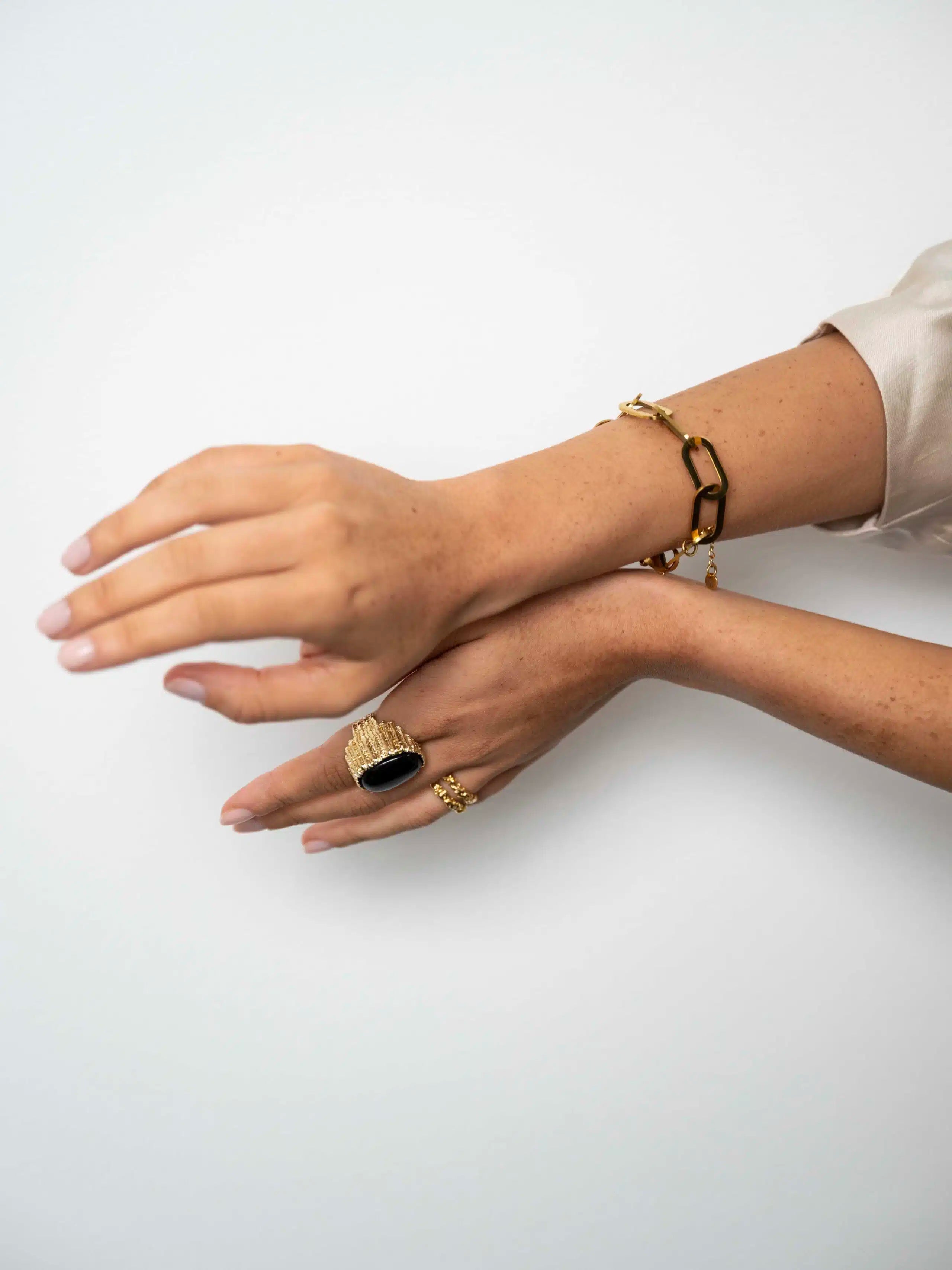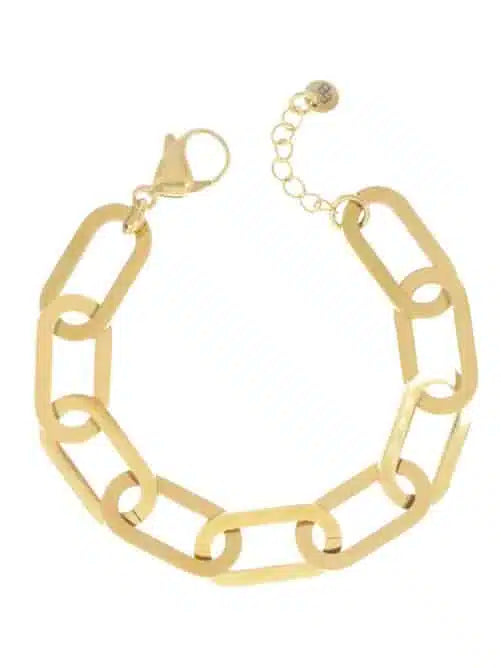 Grote schakelarmband met platte ovale schakels. De schakels zijn 2.5 x 1.3 cm. De armband heeft van een verlengkettinkje van 2.5 cm zodat hij altijd past.  Verguld op longlasting stainless steel.