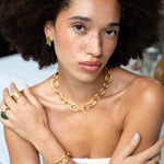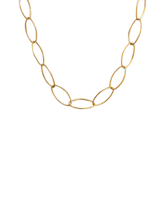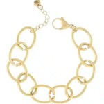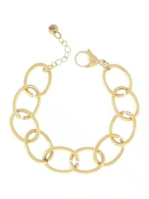 Statement schakelarmband met XL ovale schakels in een afwisselend patroon: één gladde schakel en één met verfijnde textuur. De schakels zijn 2 x 1 cm. De armband heeft van een verlengkettinkje van 2.5 cm zodat hij altijd past.  Verguld op longlasting stainless steel.