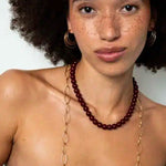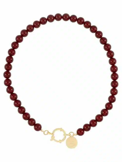 Voeg een subtiel maar opvallend accent toe aan je outfit met deze prachtige ketting met ronde bordeaux gemstones. Elke gemstone heeft een diameter van 0,9 cm en geeft een diepe, luxueuze kleur die perfect past bij zowel casual als chique looks. De ketting heeft een lengte van 40cm en wordt geleverd met een verlengkettinkje van 5 cm, zodat je de pasvorm eenvoudig kunt aanpassen aan jouw stijl en voorkeur. Het slot en het verlengkettinkje zijn verguld op duurzaam roestvrij staal, wat zorgt voor een langdurige glans en kwaliteit.