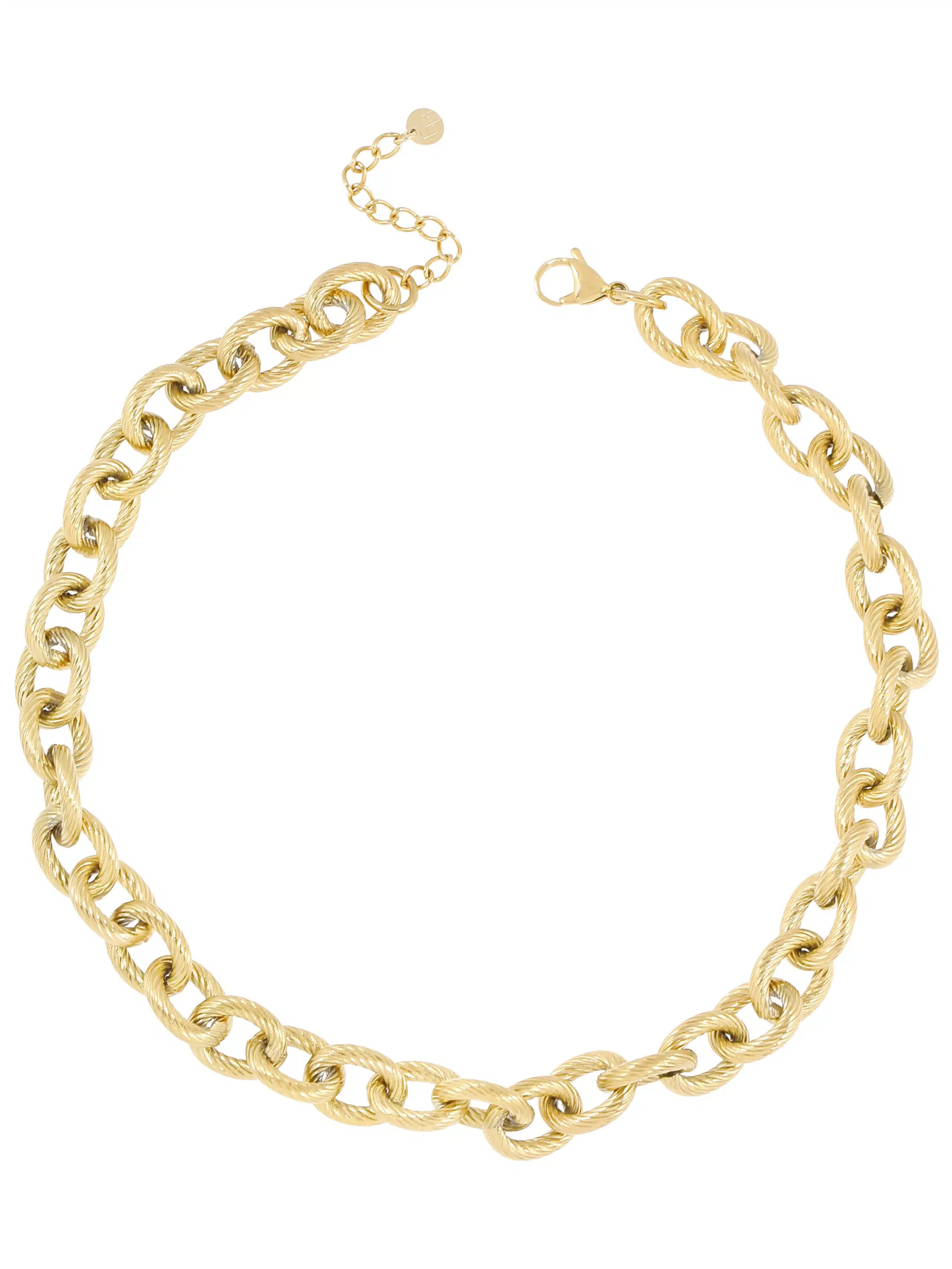 Stoere ketting met grove ronde schakels met subtiele textuur. De grotere schakel meet 1.5 x 1.2 cm voor een opvallende, stijlvolle look. De ketting is 45cm lang en wordt geleverd met een verlengkettinkje van 5 cm voor de perfecte pasvorm. Een echte eyecatcher die elke outfit naar een hoger niveau tilt.