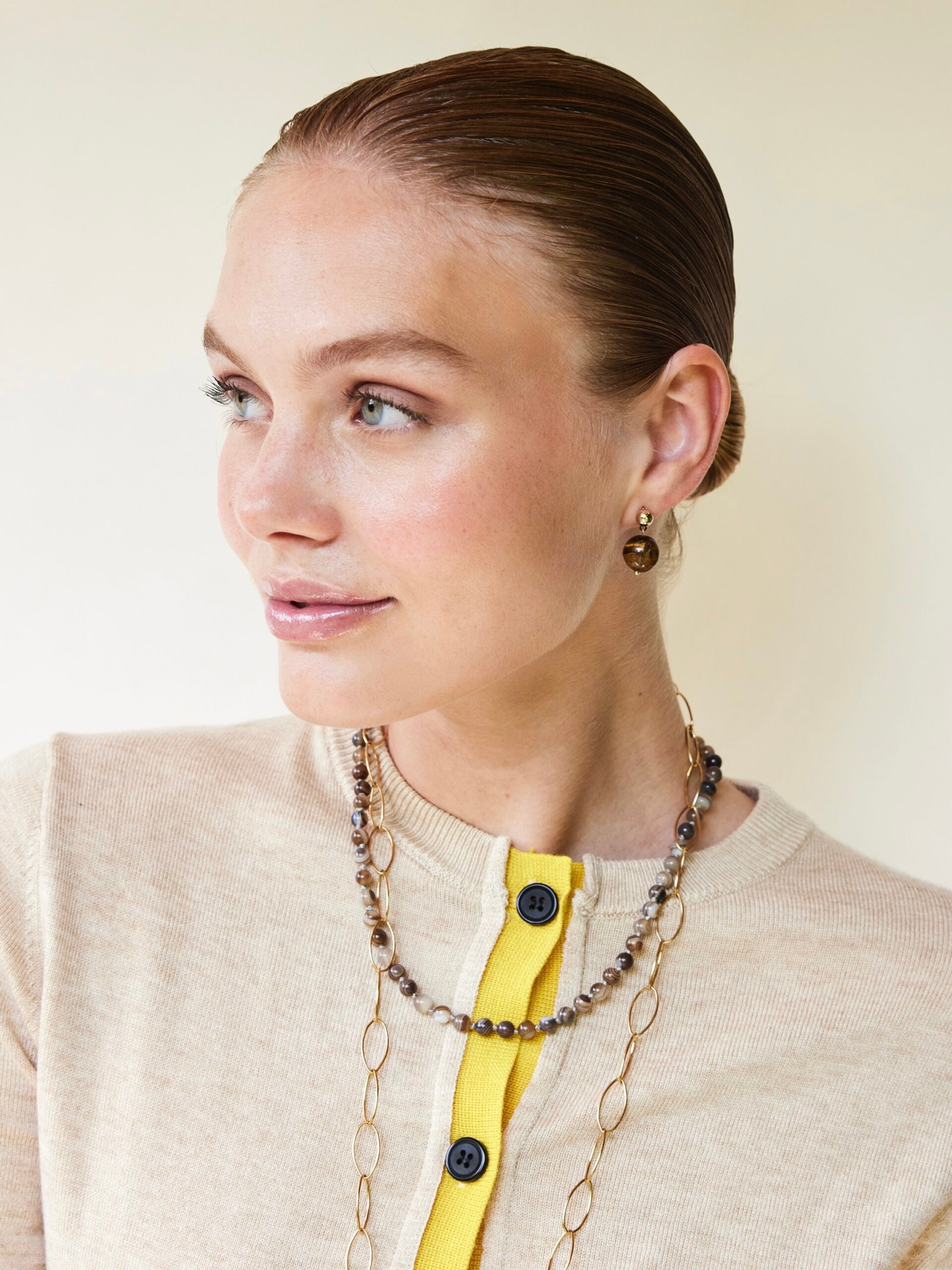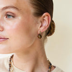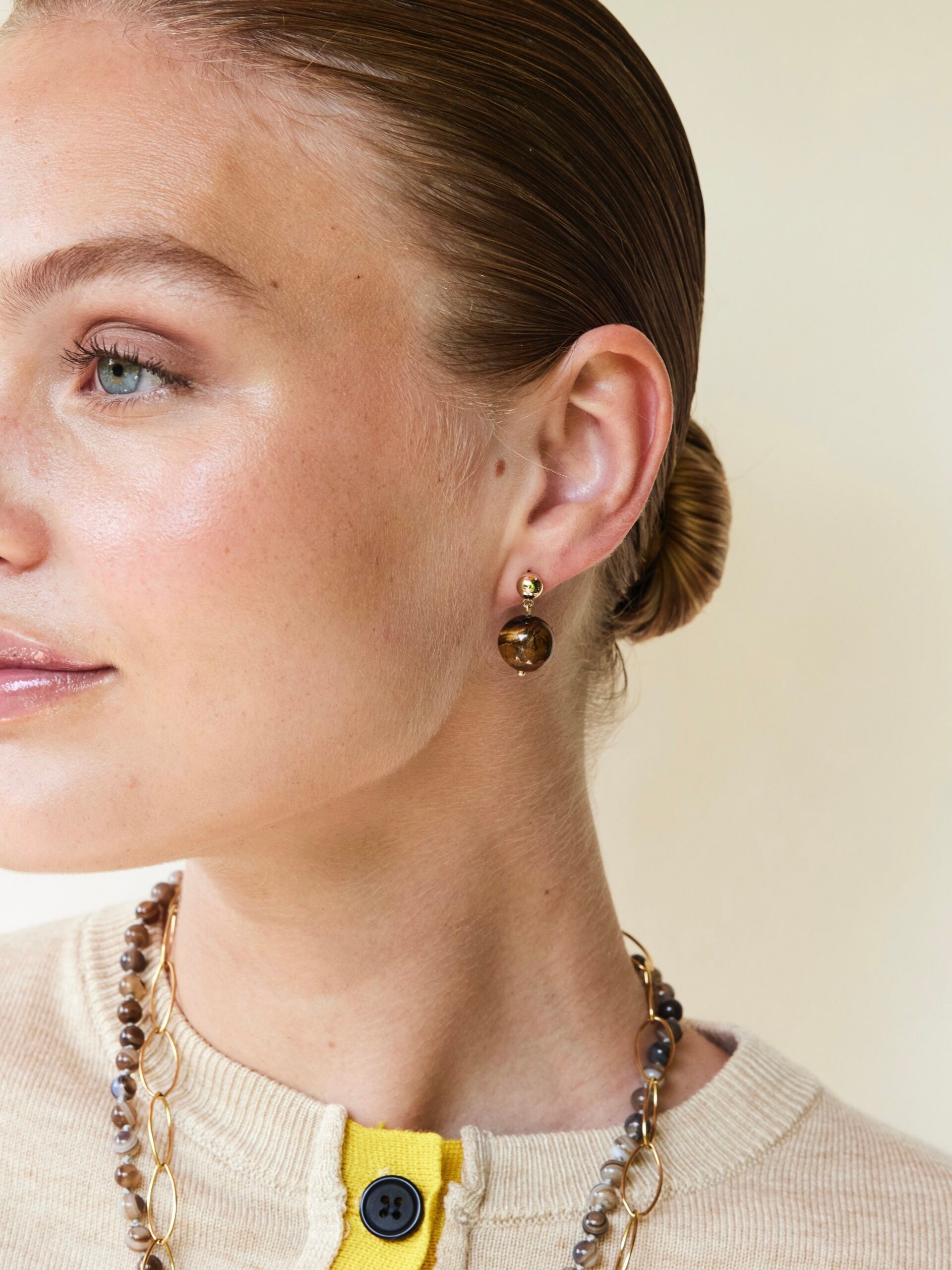 Elegante vergulde oorstekers met ronde gemstones van tijgeroog. De lengte van deze oorstekers is 2 cm. De diameter van de gemstone is 1 cm.
