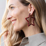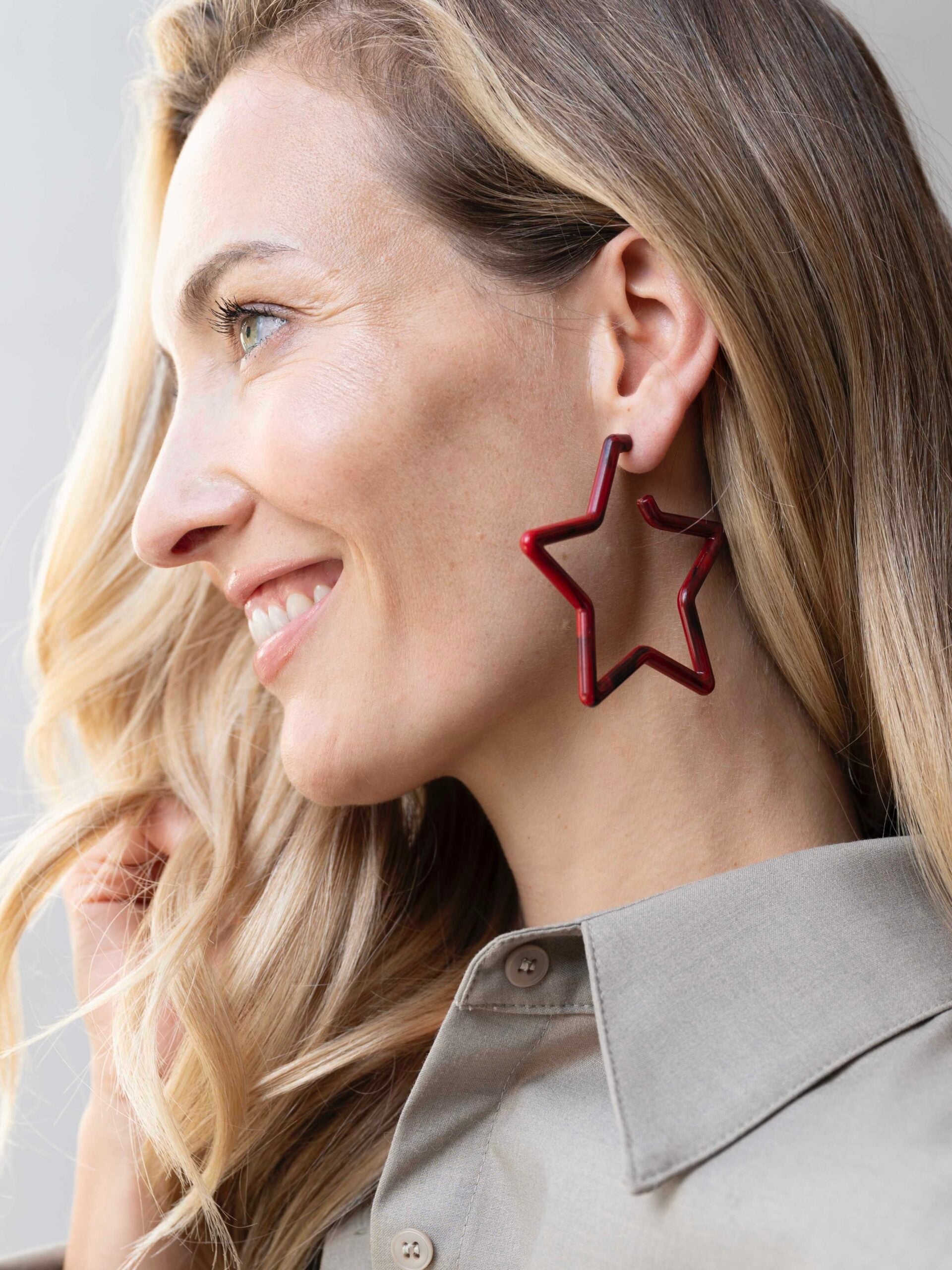 Burgundy met zwart gevlamde ster-oorstekers van gelakte hars met een opvallende uitstraling. Met een lengte van 6,5 cm zijn deze oorbellen echte eyecatchers. Goldplated op longlasting stainless steel voor een luxe en duurzame afwerking.