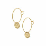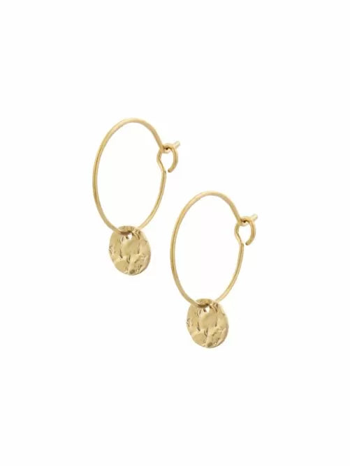 Fijne vergulde oorringen met gehamerd muntje. De totale lengte van de oorbellen is 2.9cm. Het gehamerde muntje heeft een diameter va 1 cm. Zware goudplating op een longlasting stainless steel.