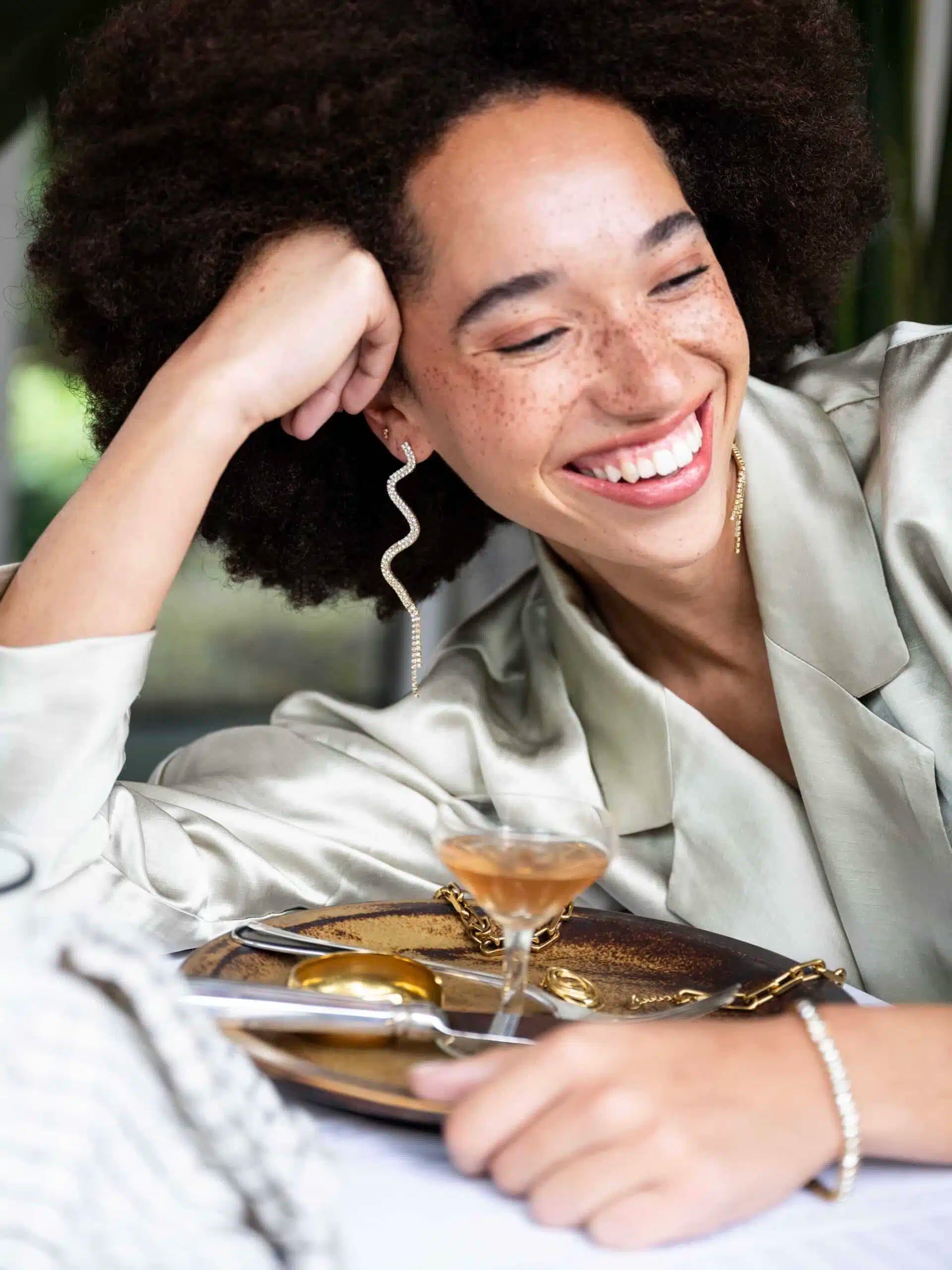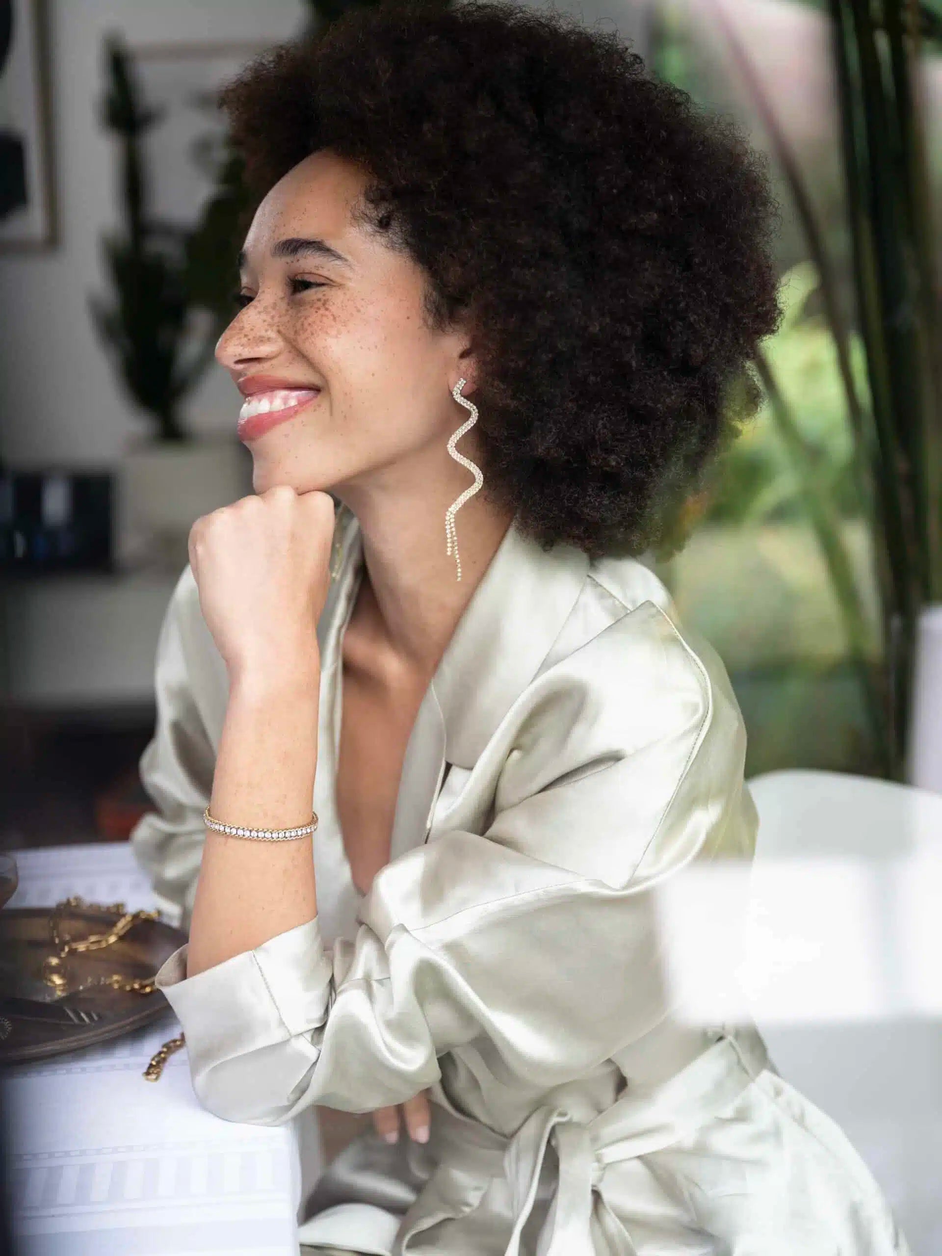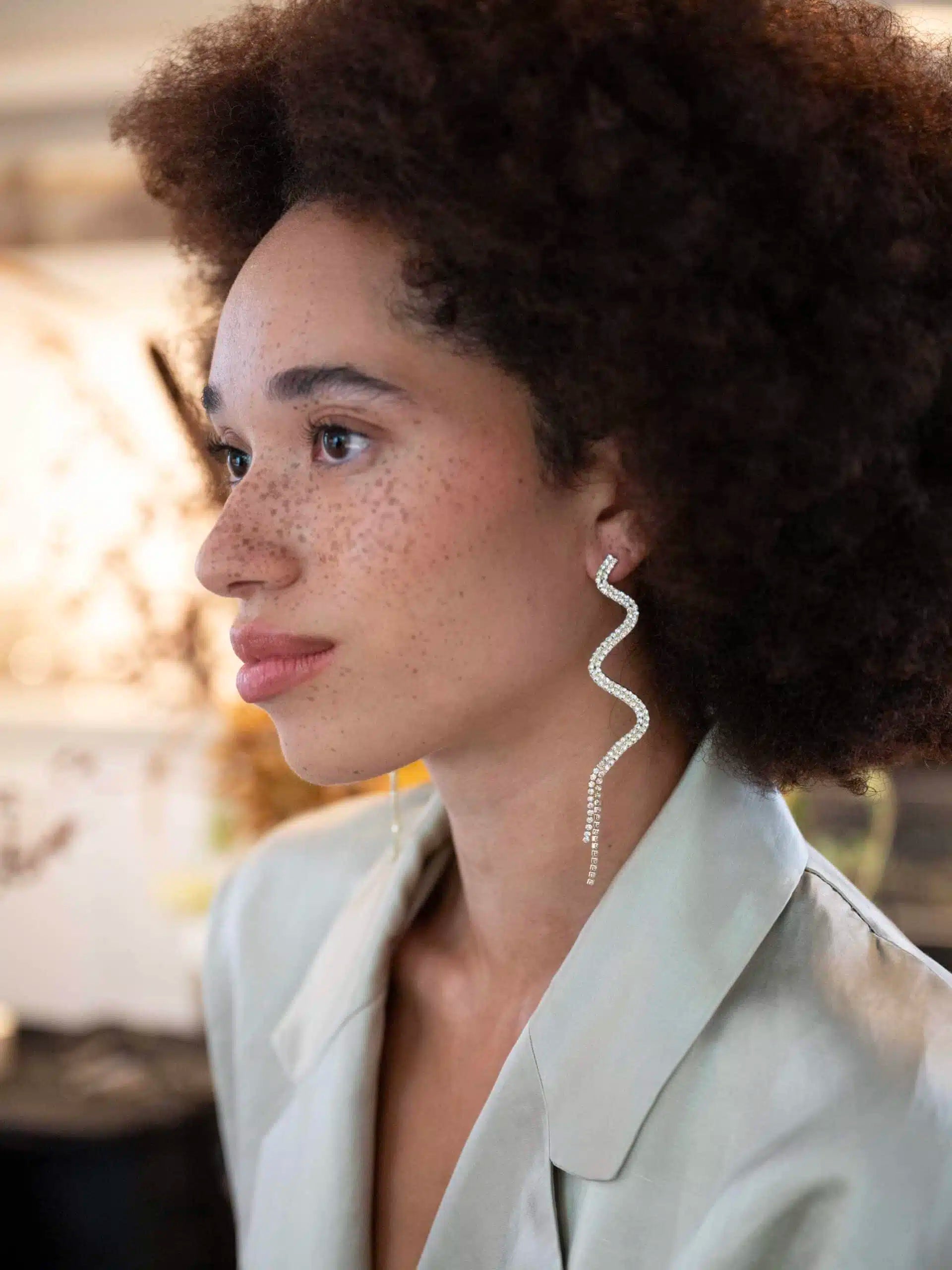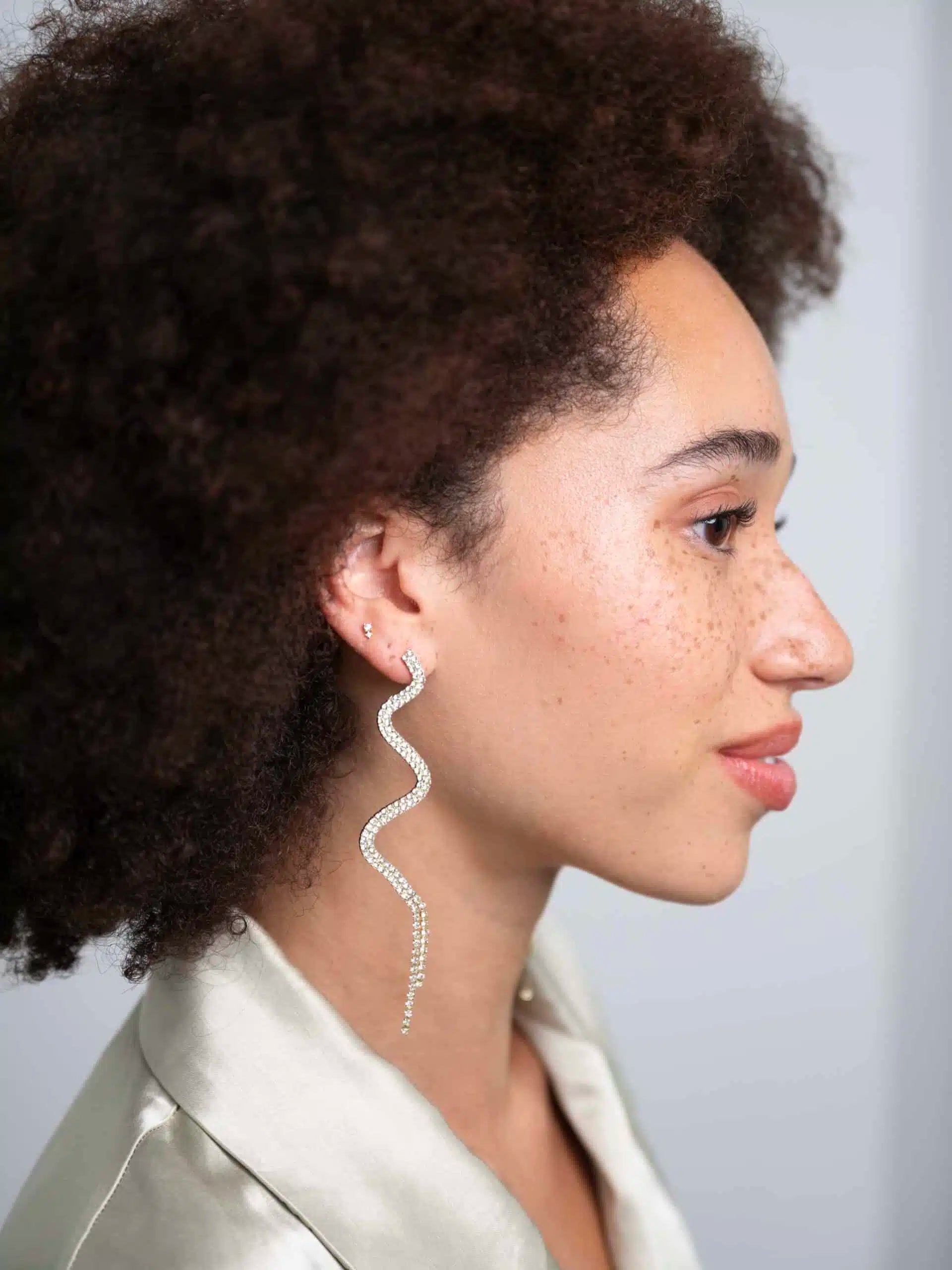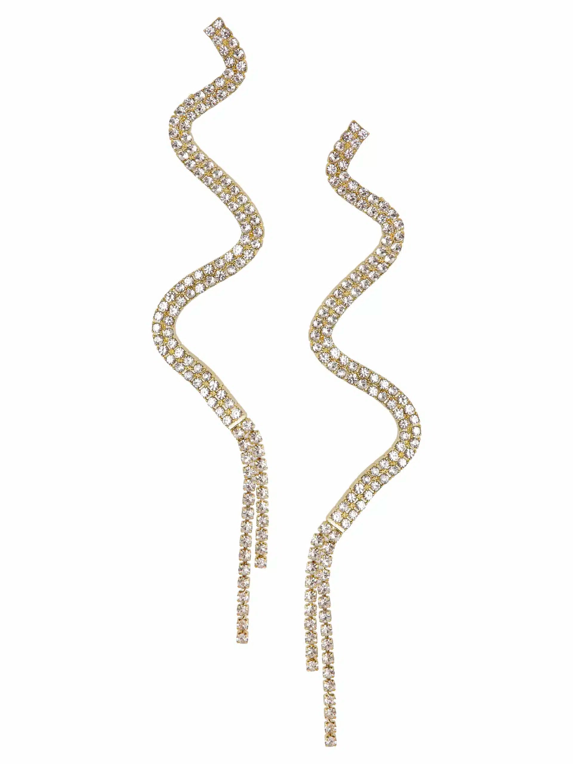 Lange, sierlijke snake oorstekers met een golvend design en fijne strass steentjes voor een elegante sparkle. Met een lengte van 11 cm creëren deze oorbellen een verfijnde statement look. Verguld op messing voor een luxe uitstraling.