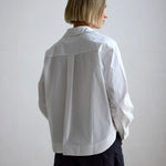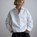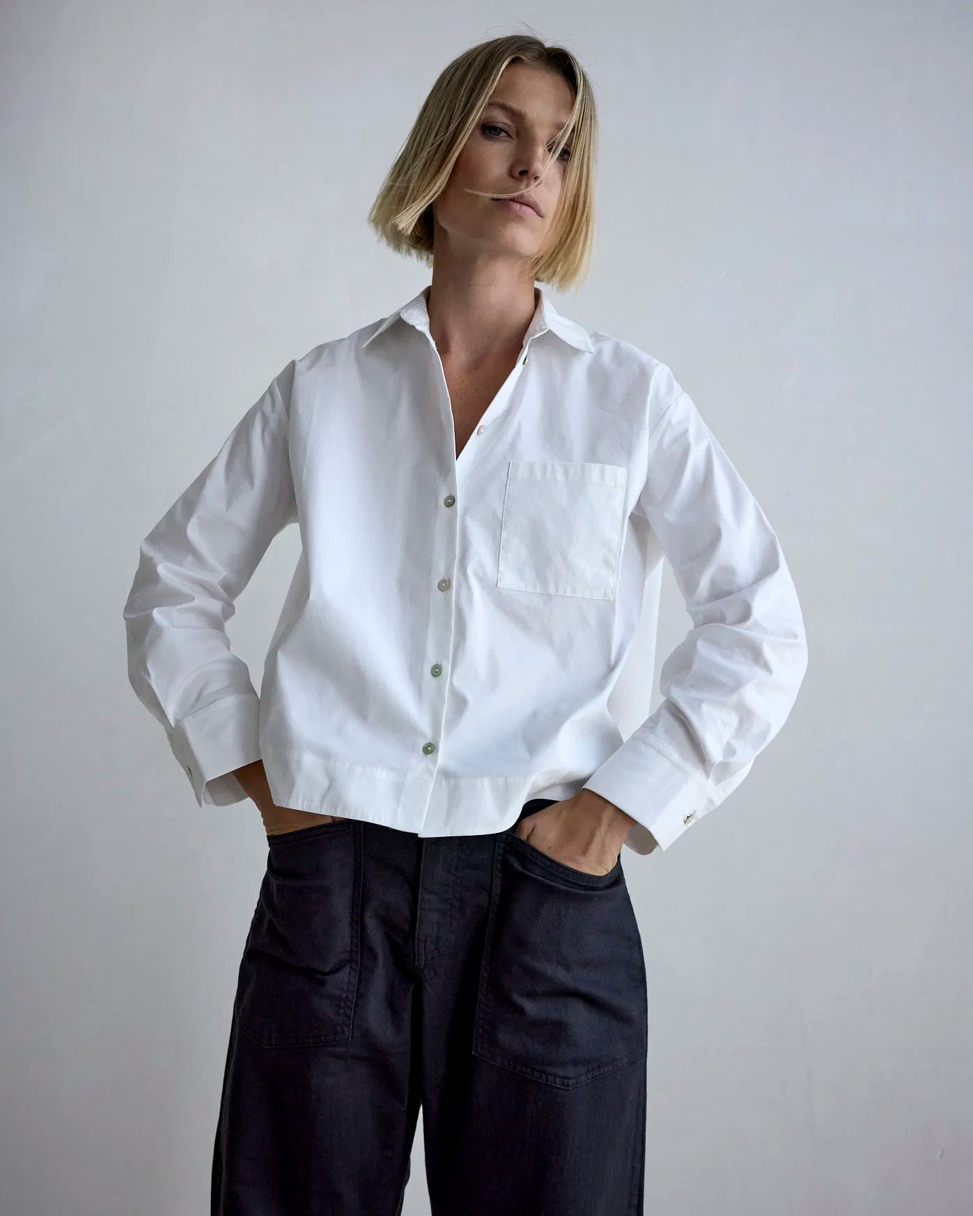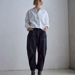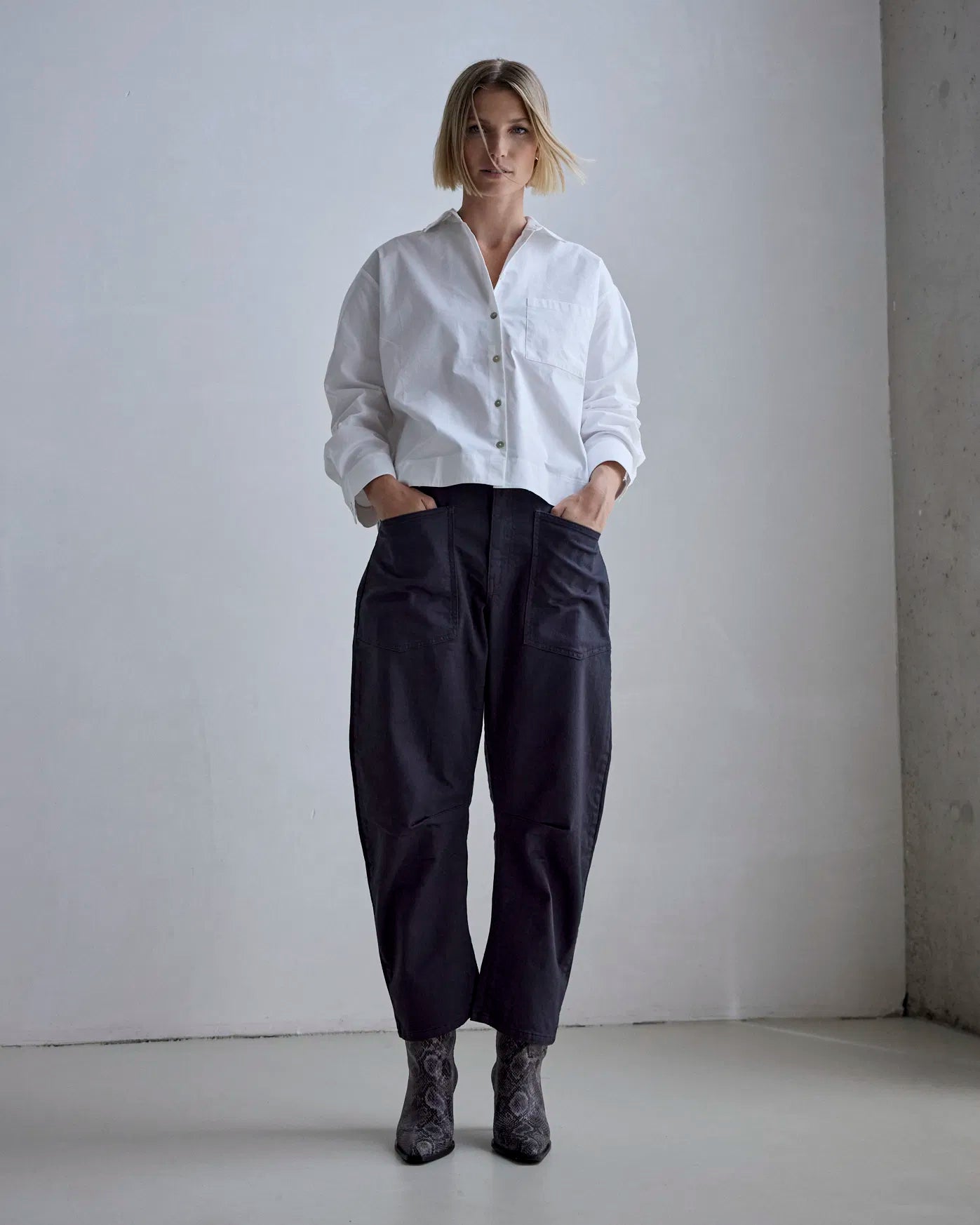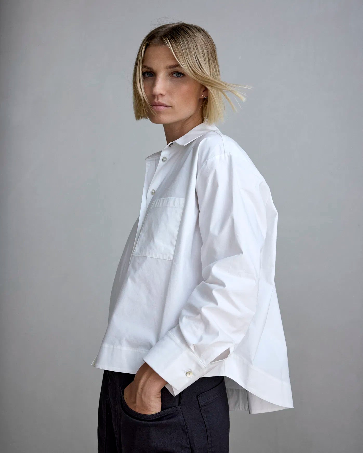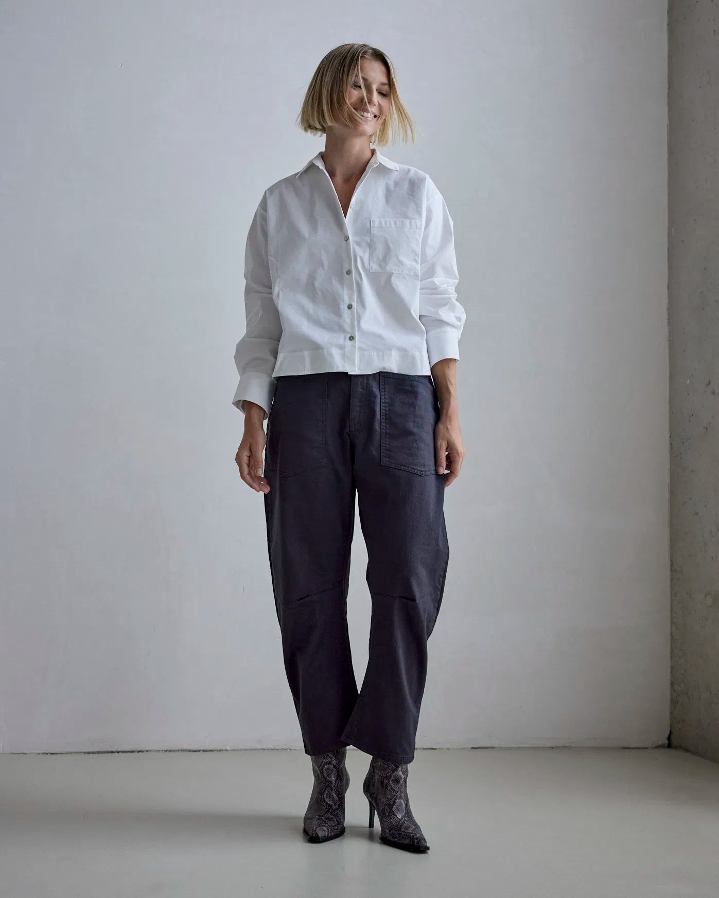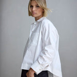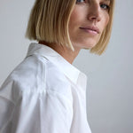 Een stevige katoenen blouse met een brede boord aan de onderkant welke wat wijder uitloopt. Met een knoopsluiting en kraag is het een ideaal item om deze zowel stoer als heel gekleed te dragen. Wij hebben de blouse gecombineerd met de katoenen broek Nadeen.