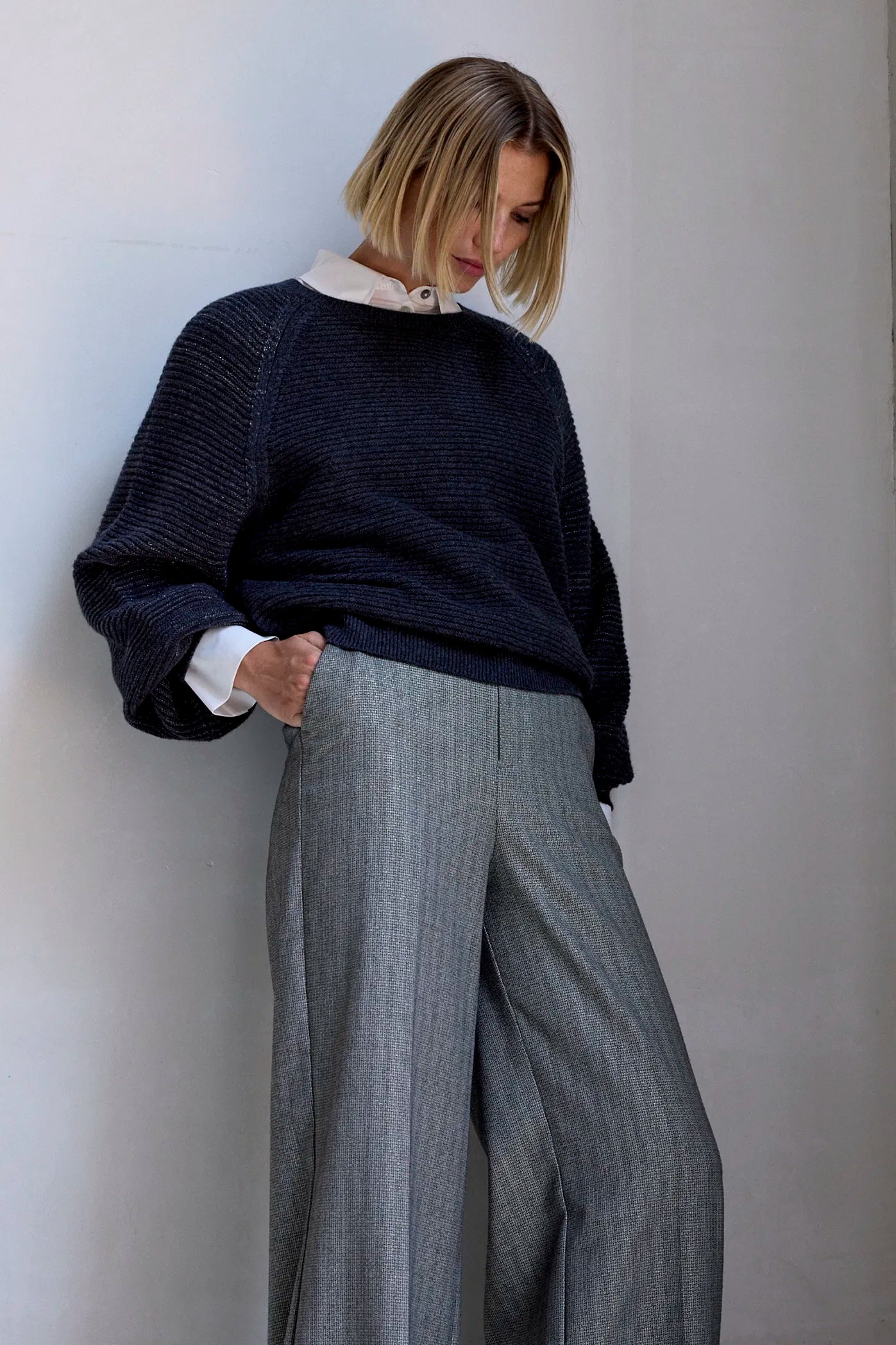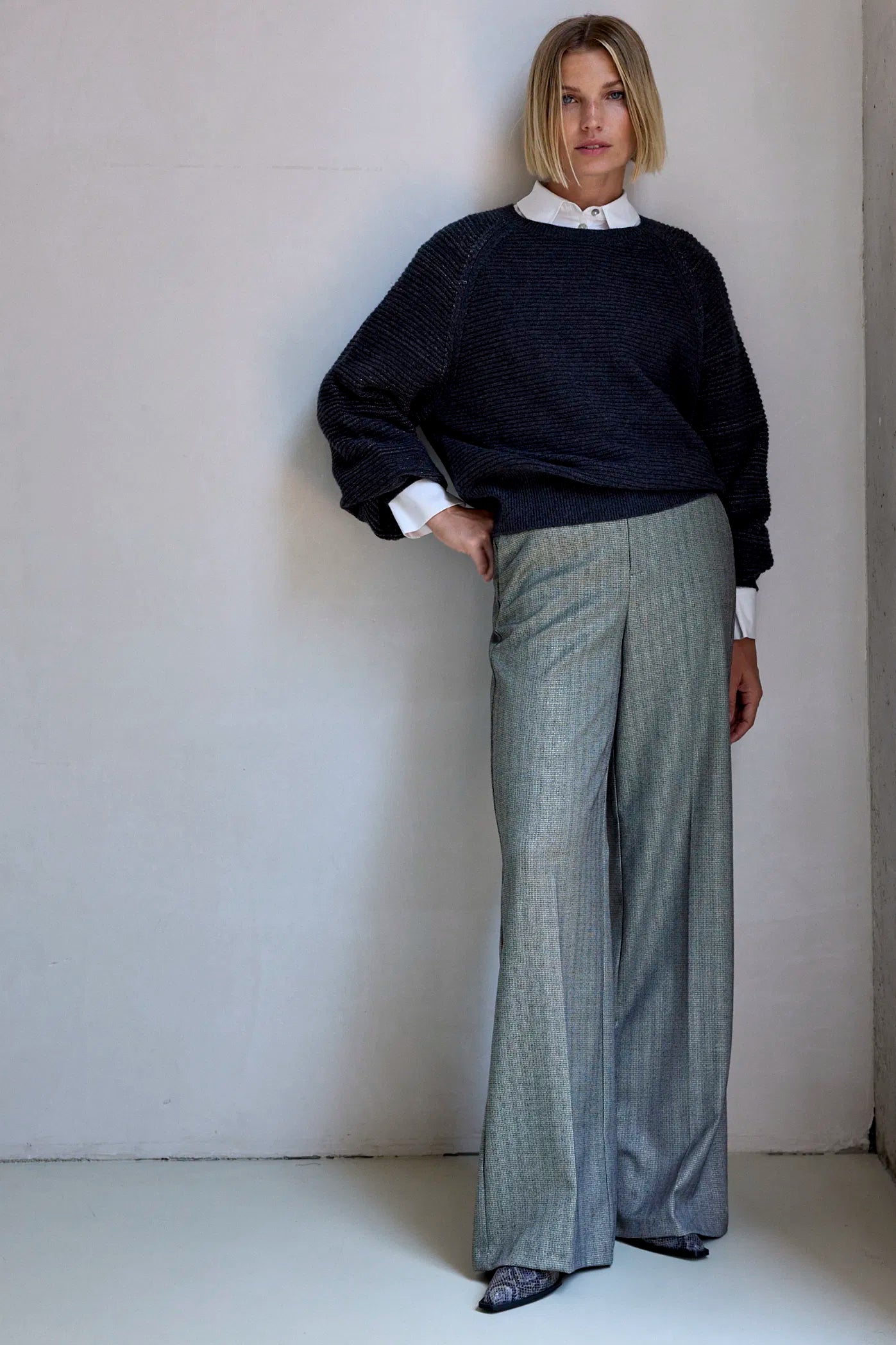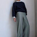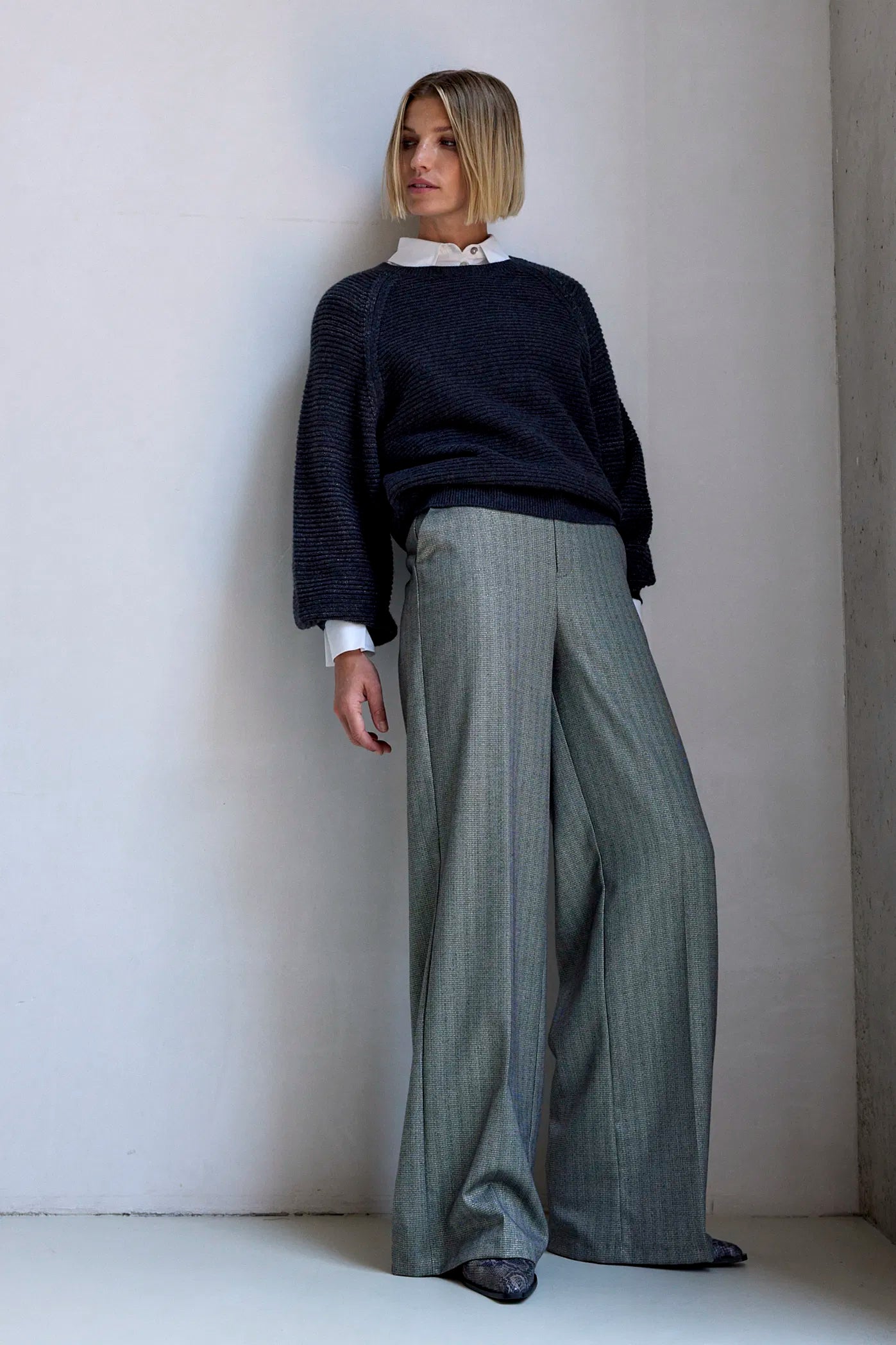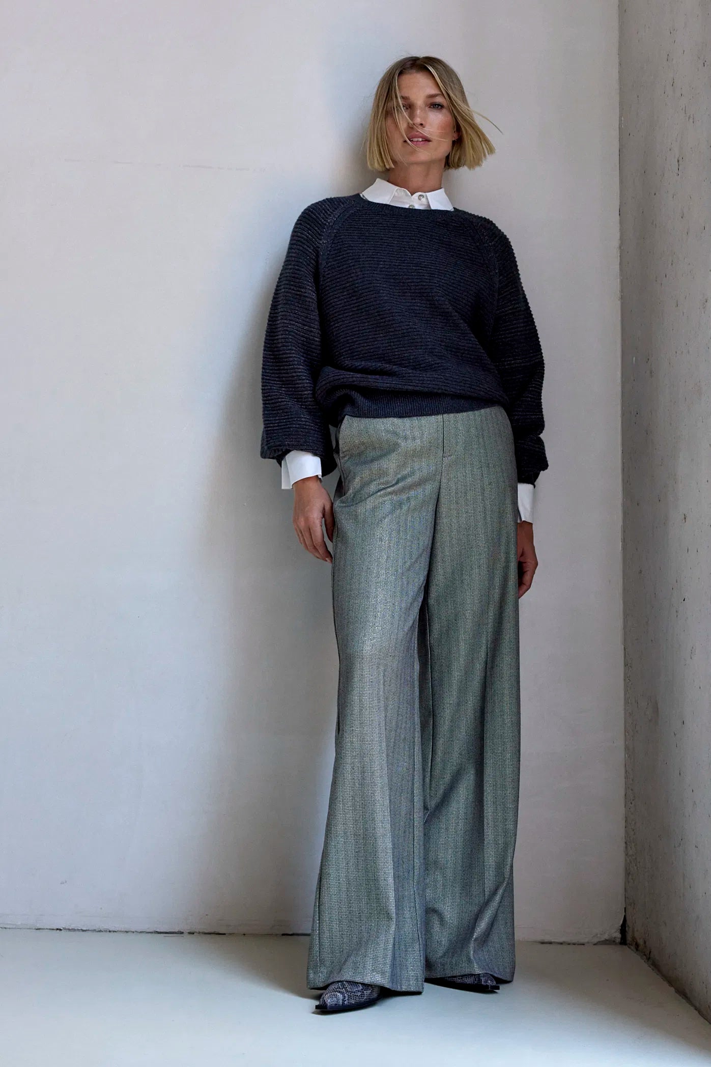 De broek Amore heeft een mooie glans door de subtiele lurex draad die is mee geweven. Met wijde pijpen en steekzakken is deze soepele broek zowel vrouwelijk als stoer te stylen.