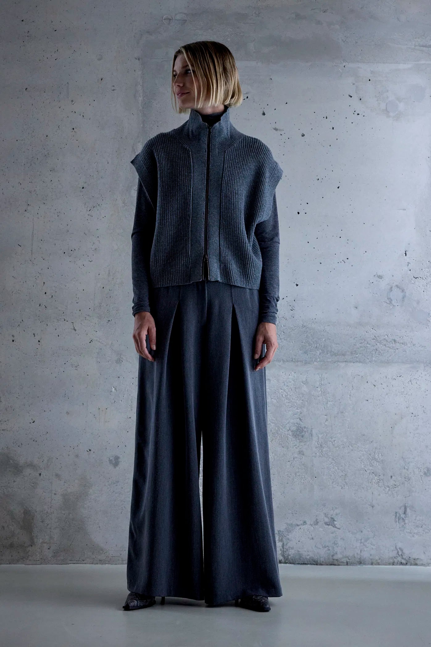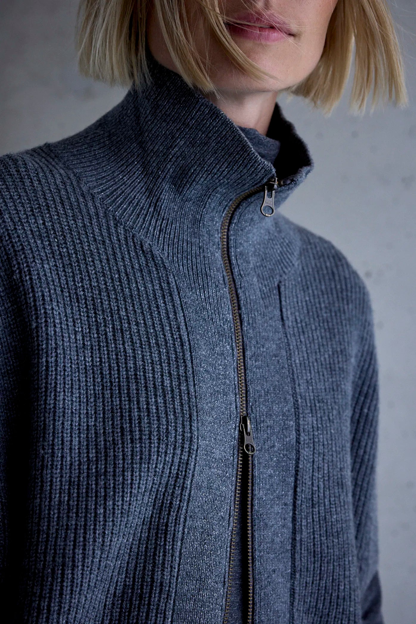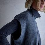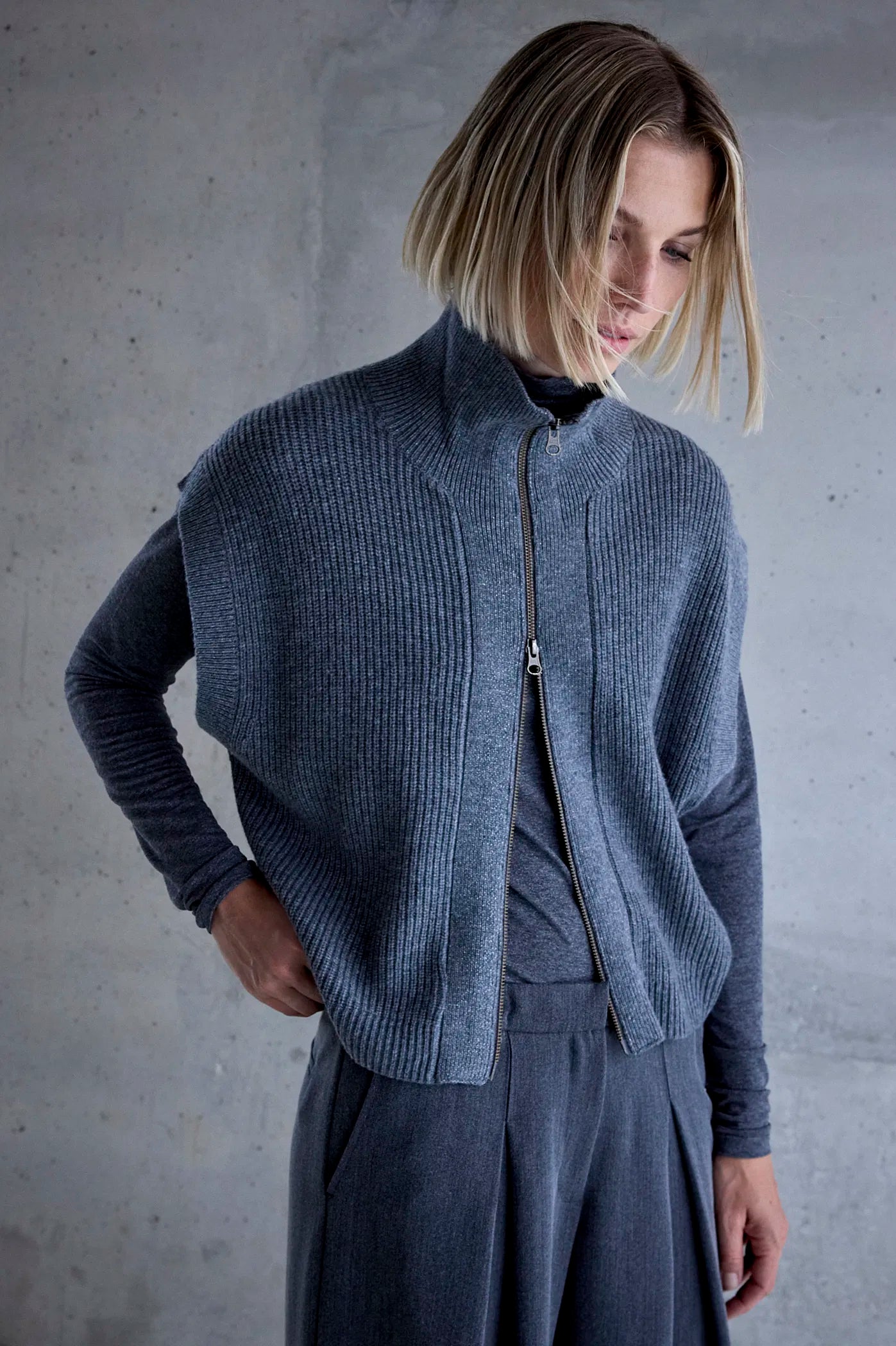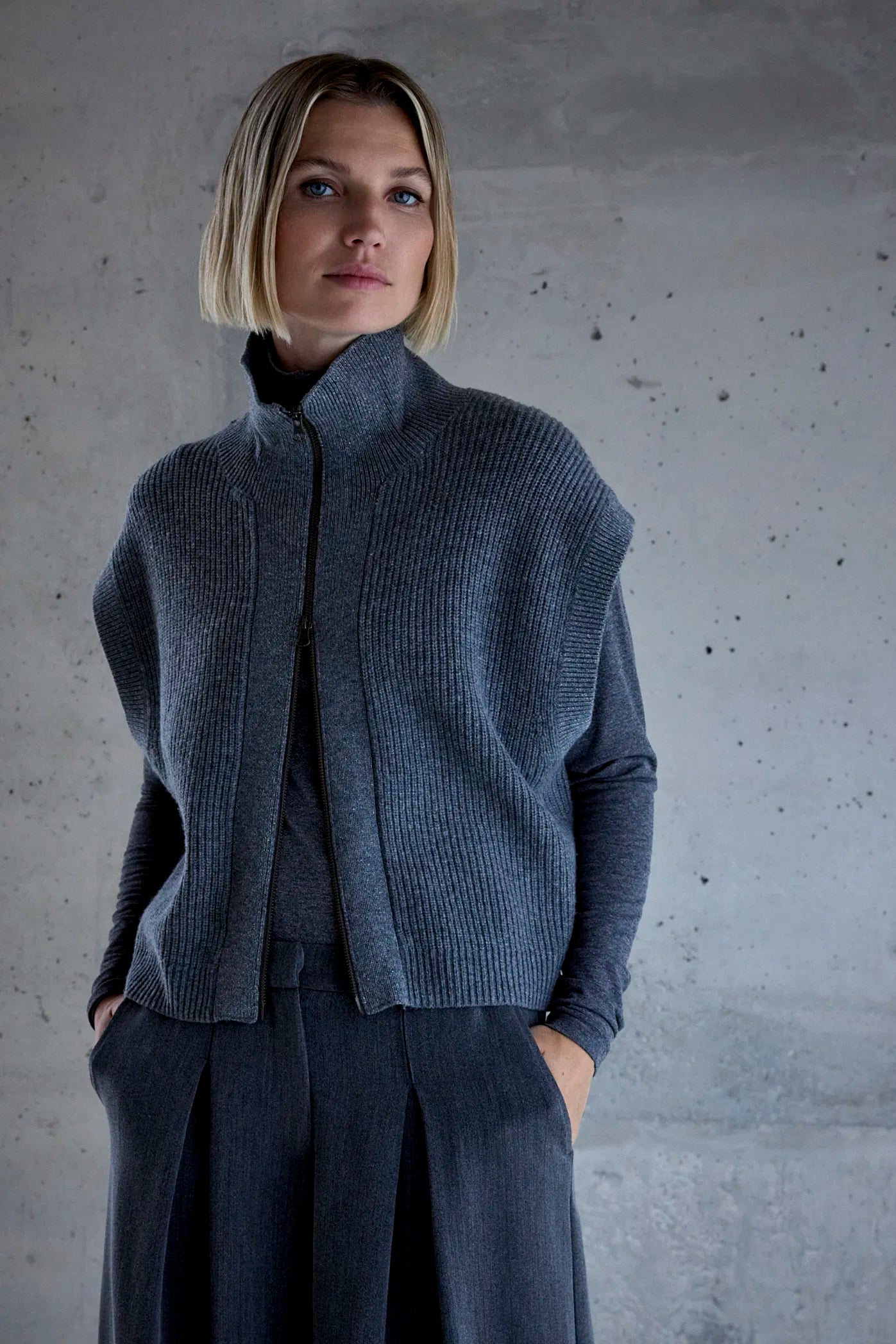Een heerlijk zacht vest gemaakt van wol met cashmere, met een subtiele lurex draad langs de kraag en rits. De 2 way zipper geeft een stoere look. Dit item is een must have dit seizoen.