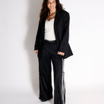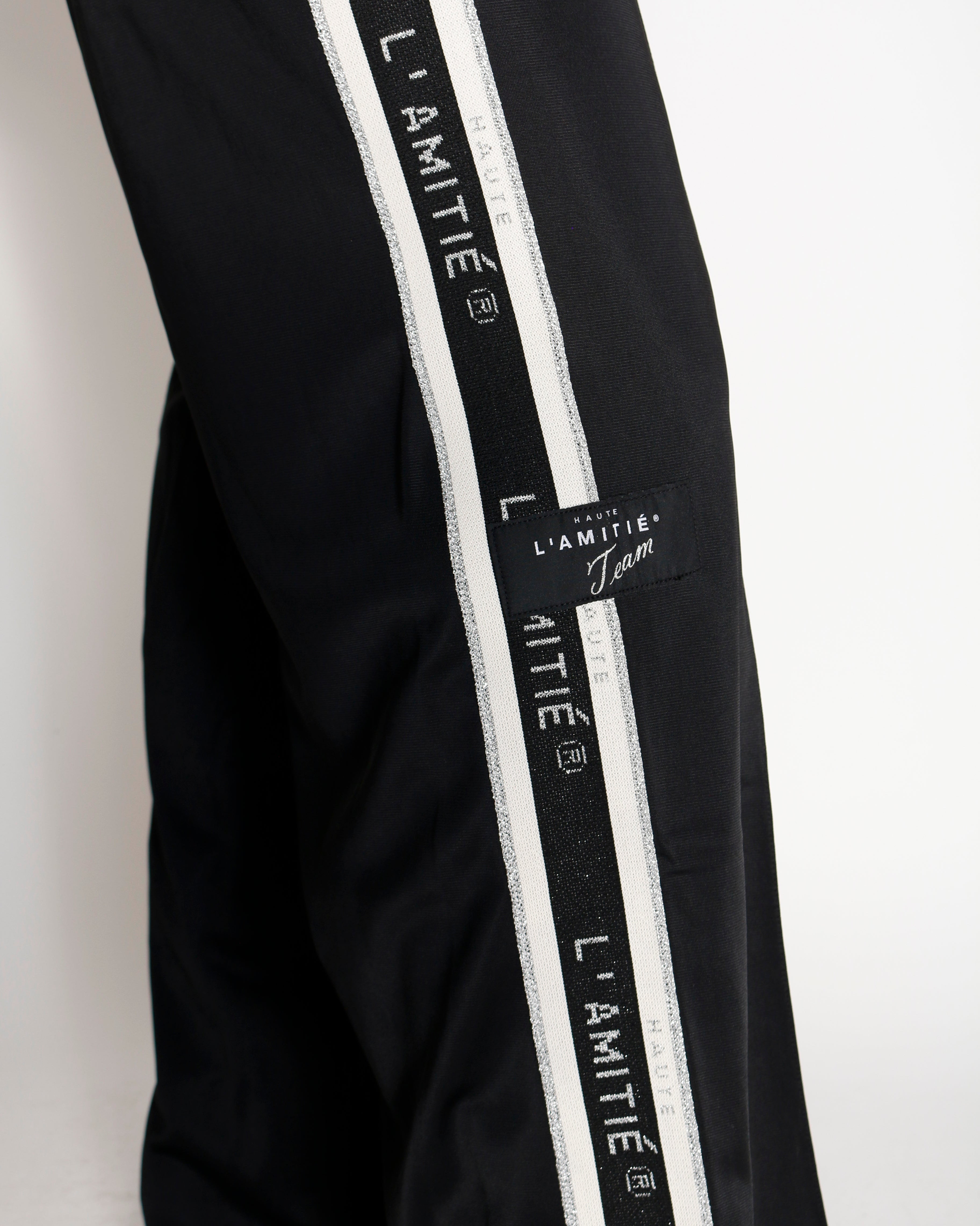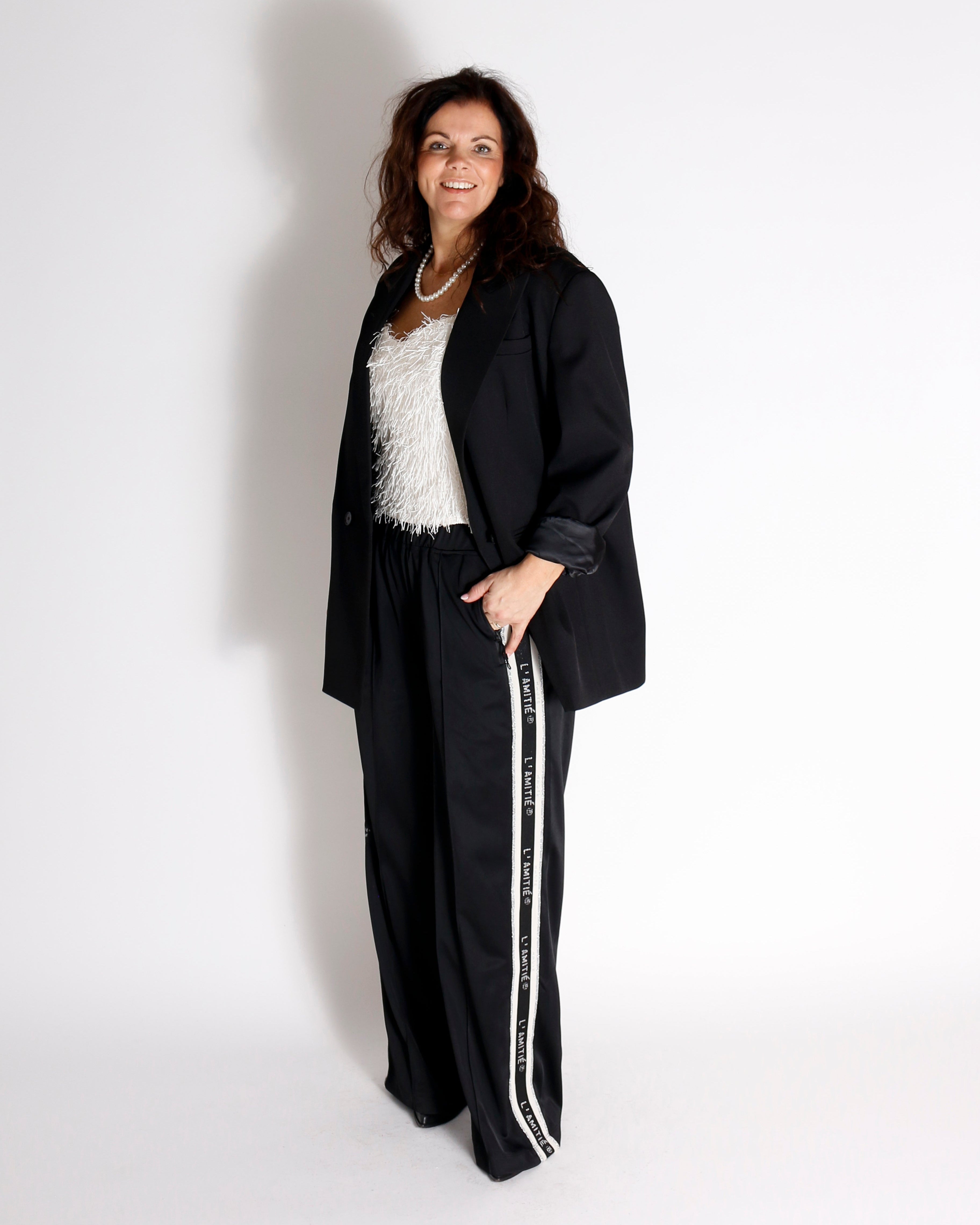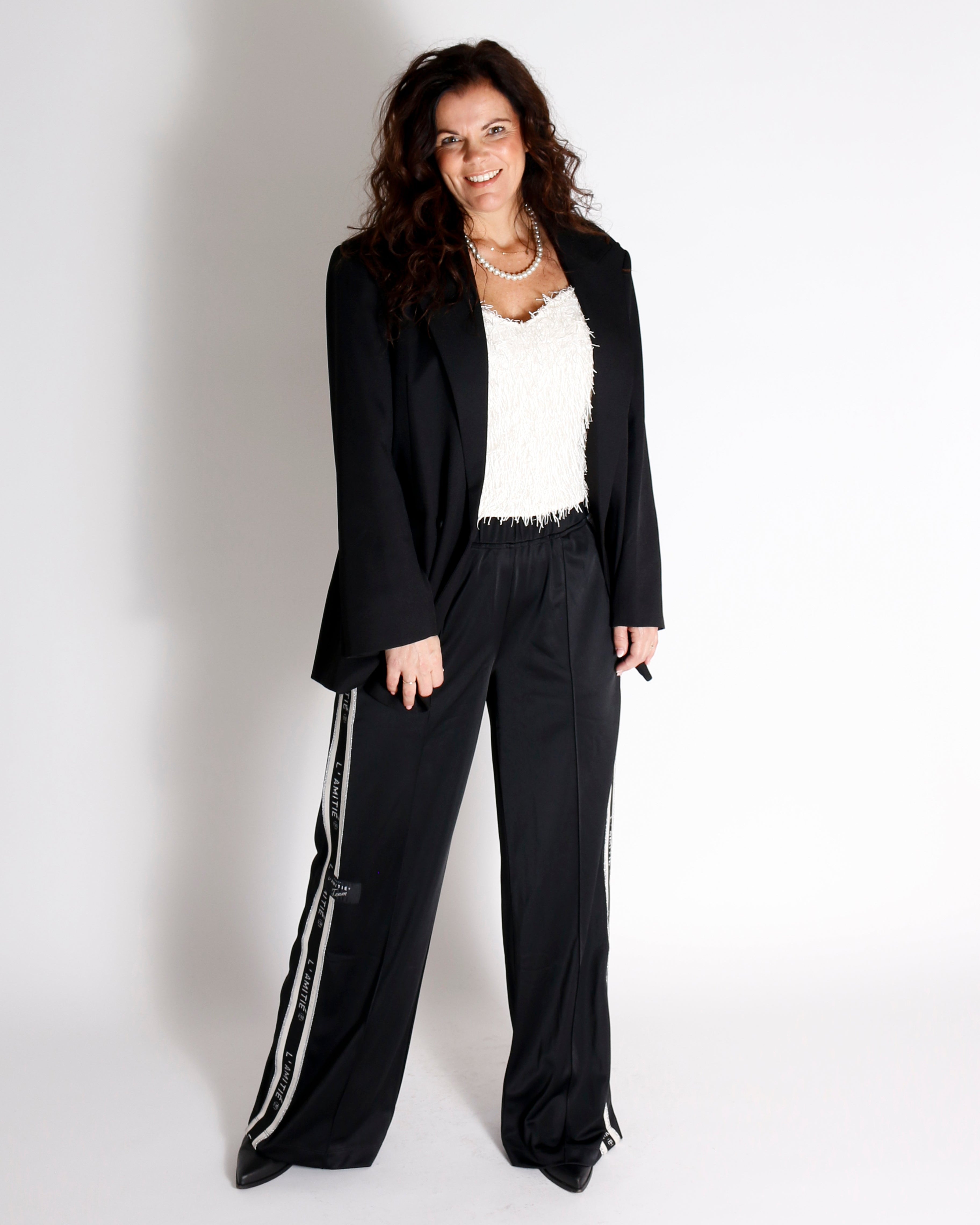 Casual en stijlvol, dat is deze baggy lurex track pants. Door de logo strepen op de zijkanten krijgt de broek een speelse look. Combineer met een blouse voor een perfecte alledaagse outfit.