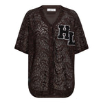 Dit shirt van Haute L’Amitié is dé perfecte mix tussen sportief en vrouwelijk. De transparante kanten stof in diepe mocca tint geeft een elegante, verfijnde uitstraling, terwijl de varsity “HL” patch zorgt voor een edgy touch.