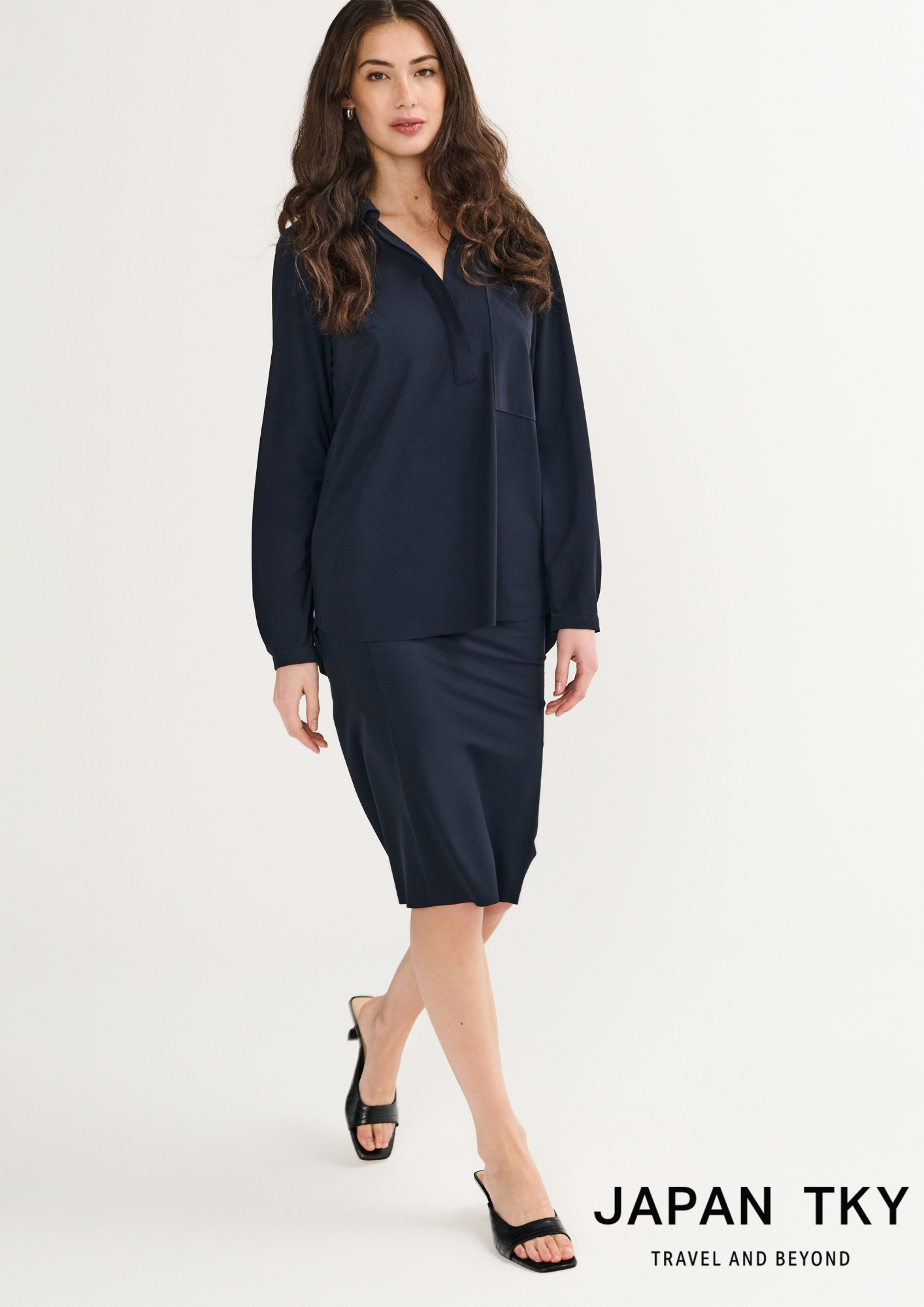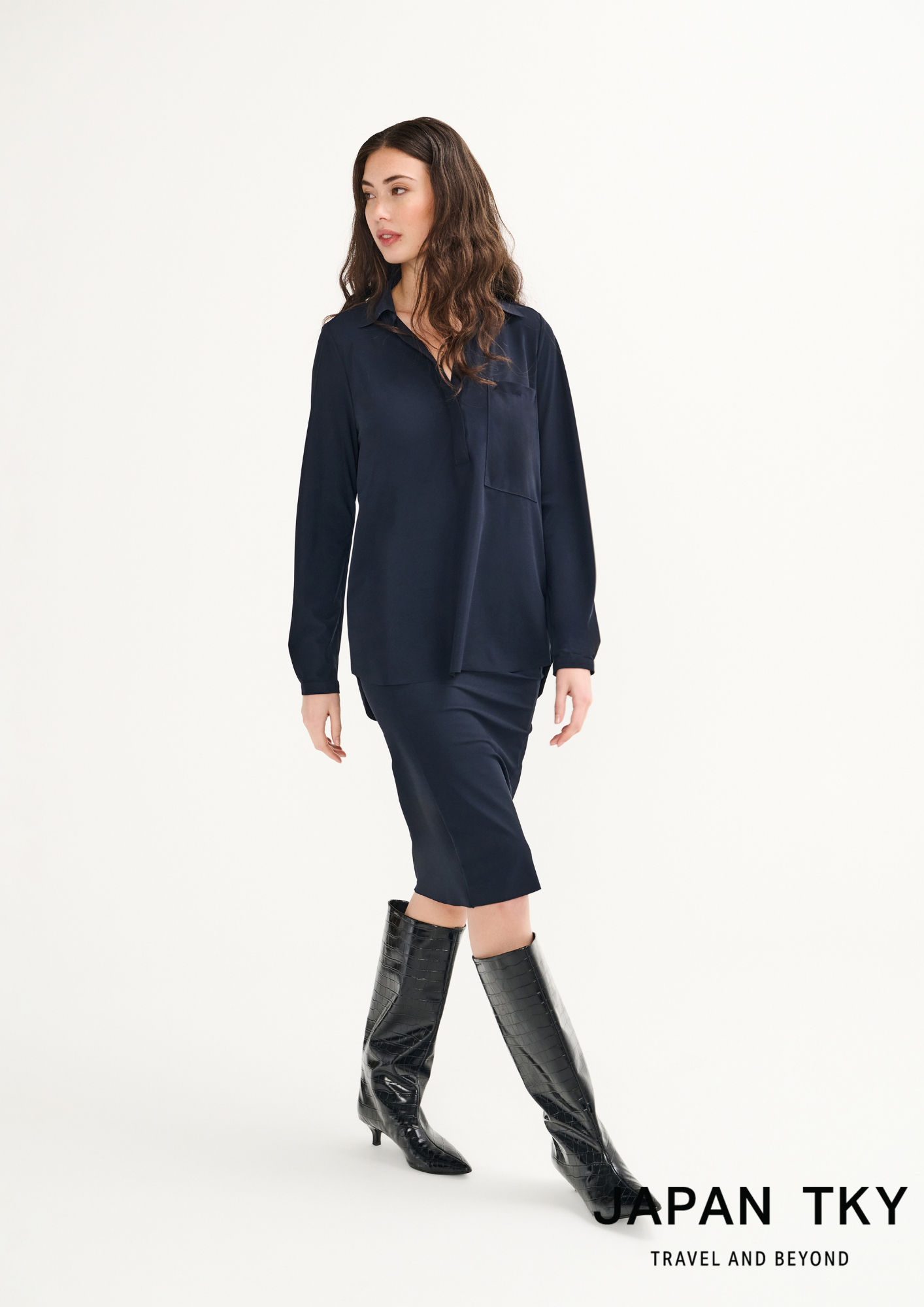 Shop de donkerblauwe blouse van Japan TKY. Een verfijnd stuk met een puntkraag, gedeeltelijke knoopsluiting en subtiel gedompelde naden voor een strakke, minimalistische stijl.