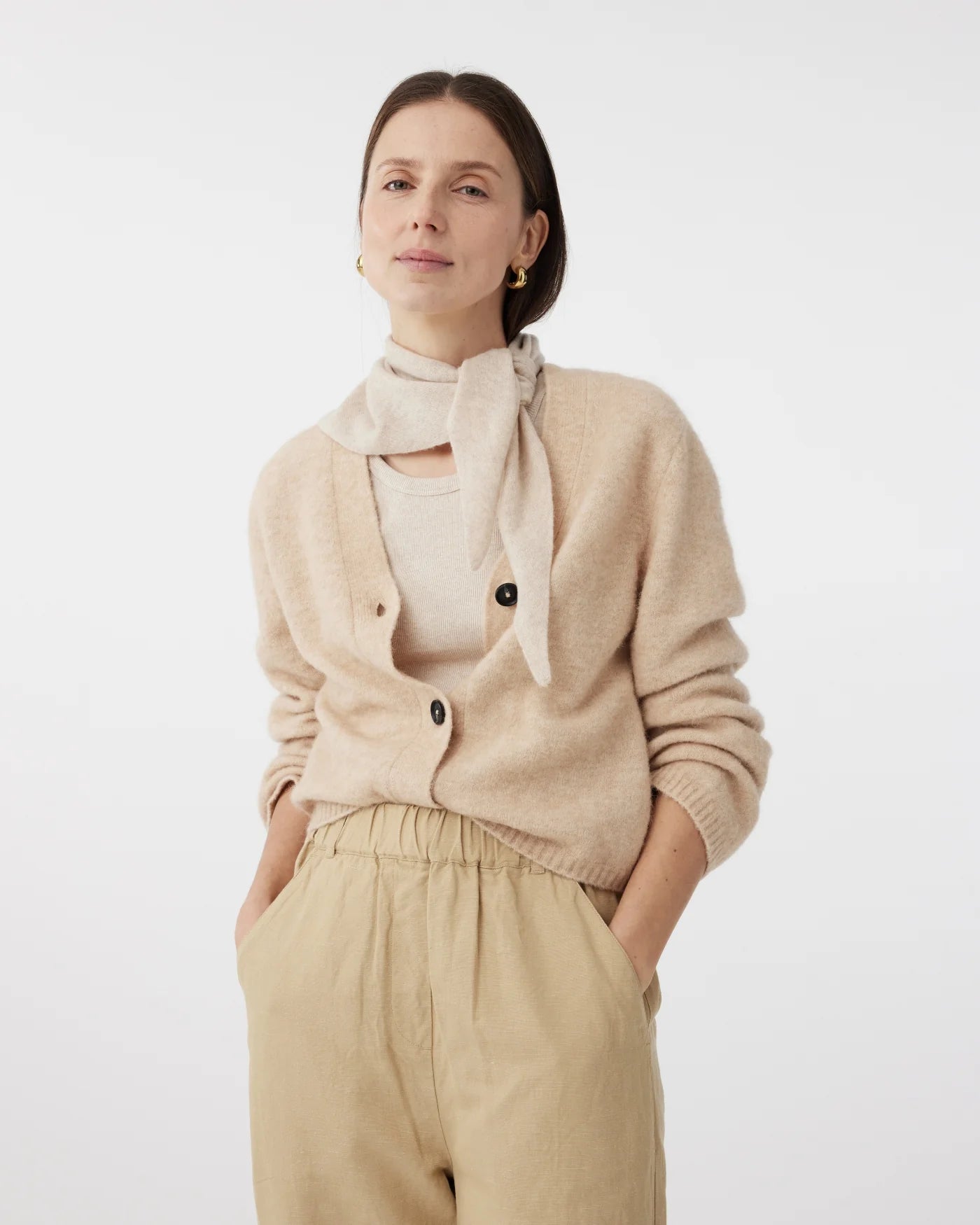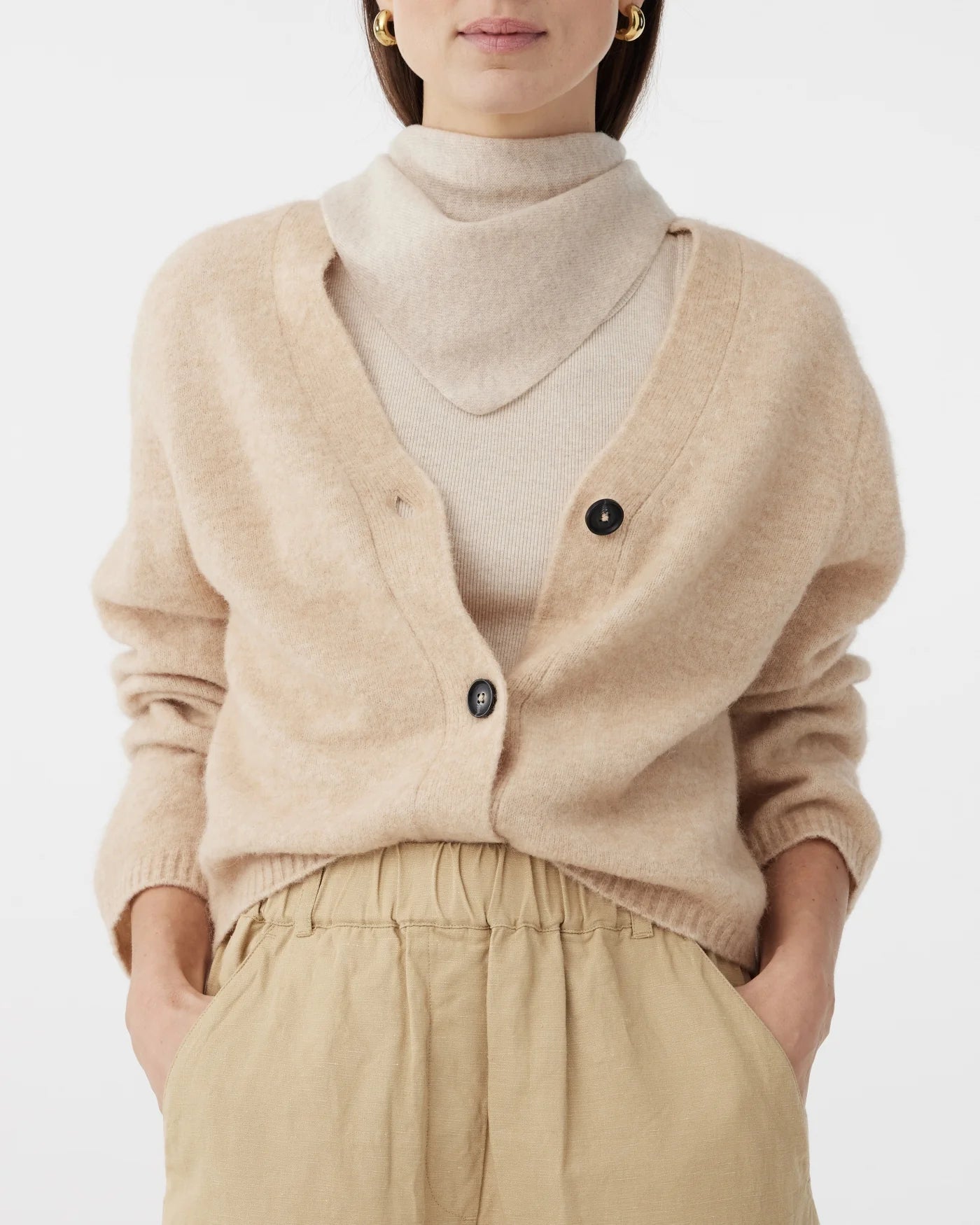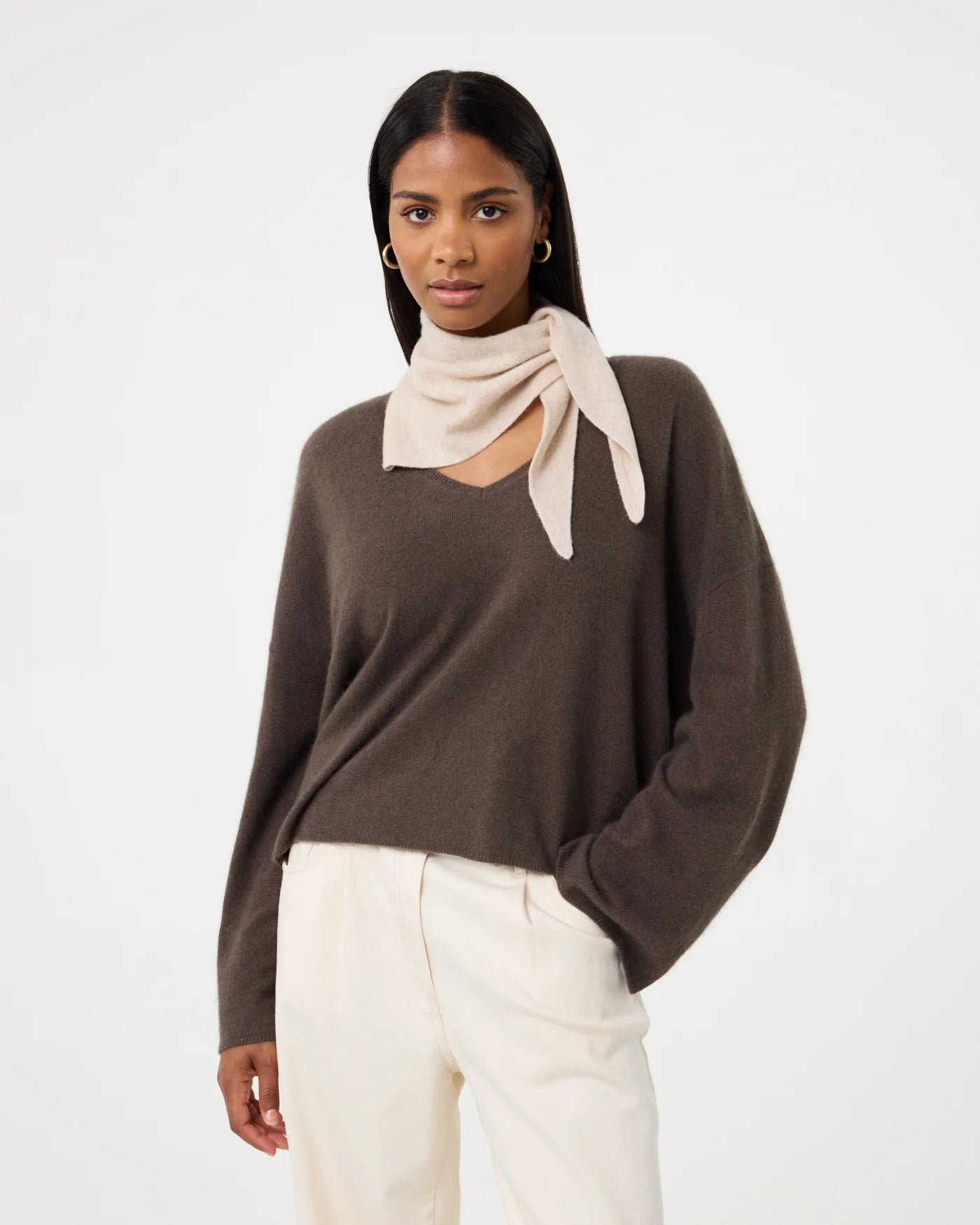Wikkel jezelf in Sissy, de driehoekige sjaal die elke outfit zowel warmte als stijl geeft. Met afmetingen van 100 cm breed en 32 cm op het diepste punt is ze ontworpen voor veelzijdigheid. Draag de sjaal met het diepste punt naar voren voor extra warmte en een verzorgde look, of knoop de sjaal losjes met de uiteinden naar voren voor een meer casual uitstraling. Stijlvol en praktisch, de perfecte finishing touch voor elke outfit.