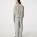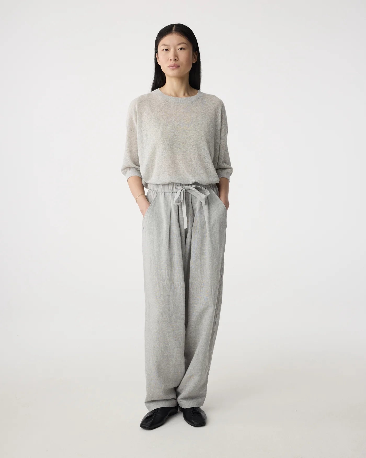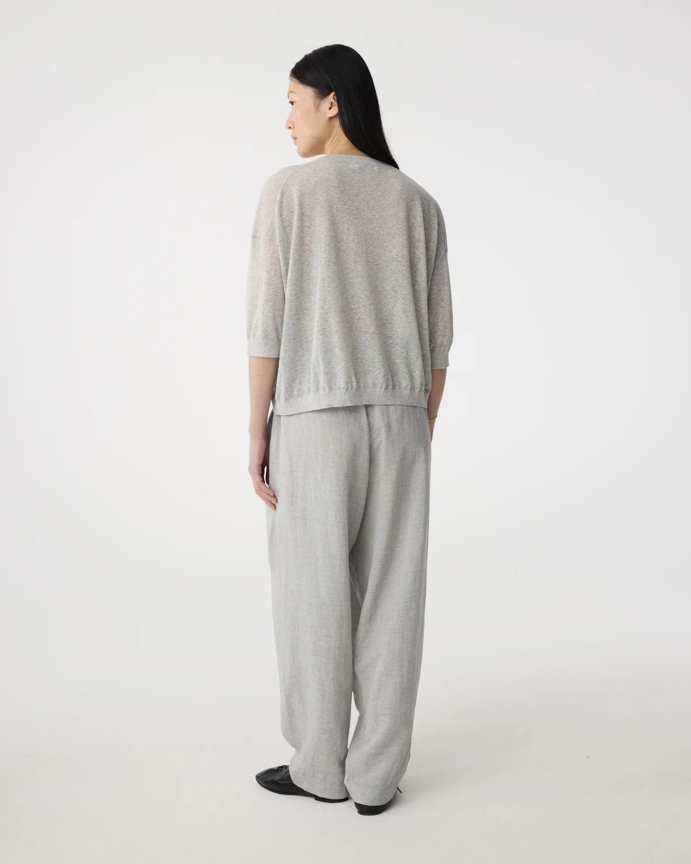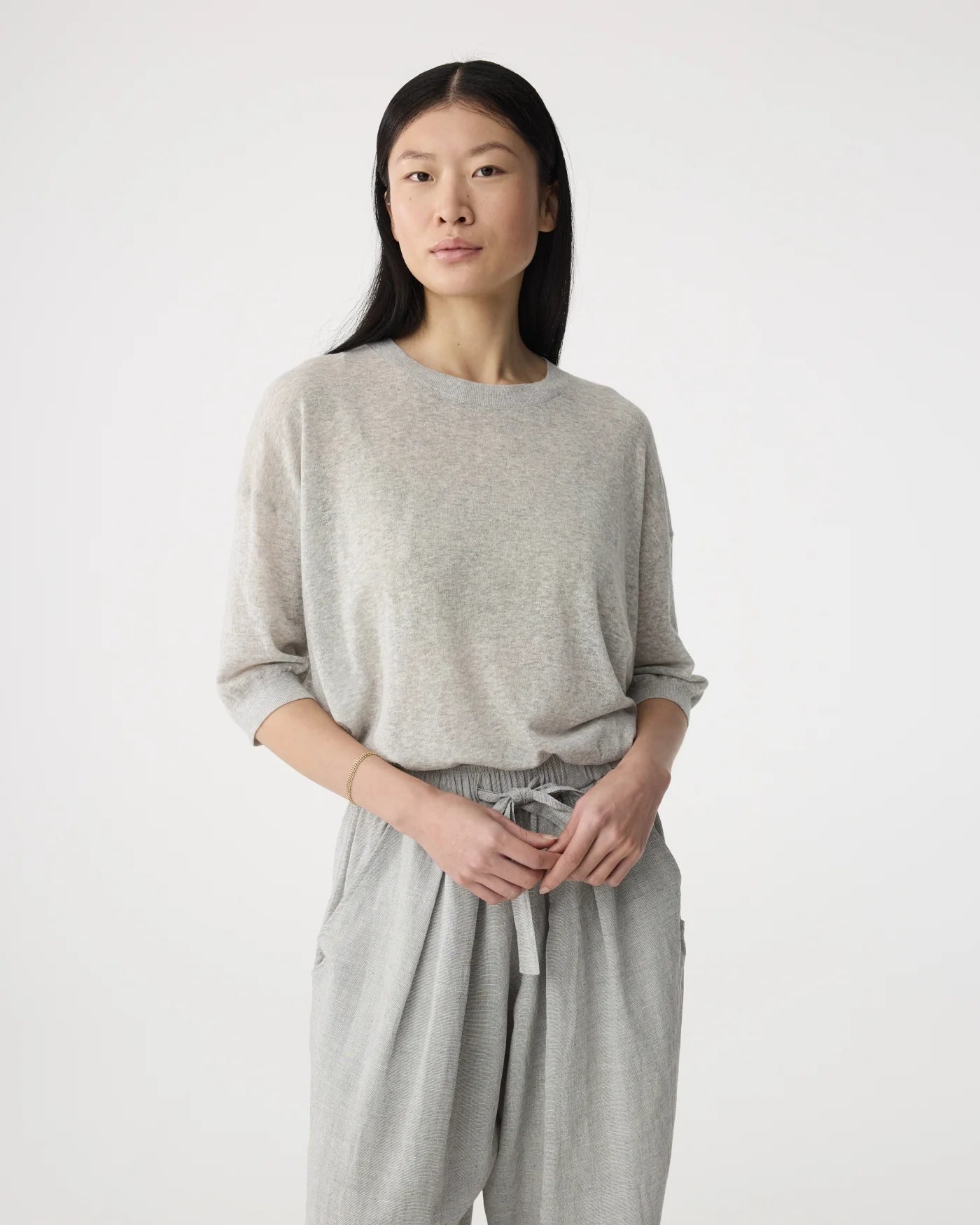 Fanes is losjes en licht, met een pasvorm die soepel met je meebeweegt. Haar mouwen met ribgebreide uiteinden vallen tot net boven de elleboog en de verlaagde schouderlijn zorgt voor een ontspannen silhouet. Dankzij de subtiele doorschijnendheid geef je eenvoudig een stijlvolle twist aan je look: met een ton-sur-ton top eronder, of juist iets contrasterends.