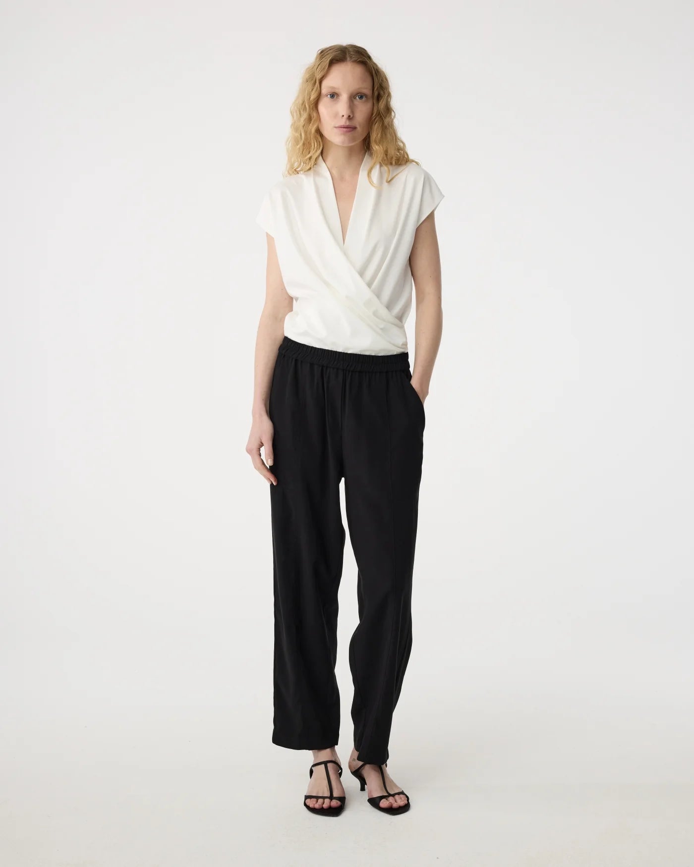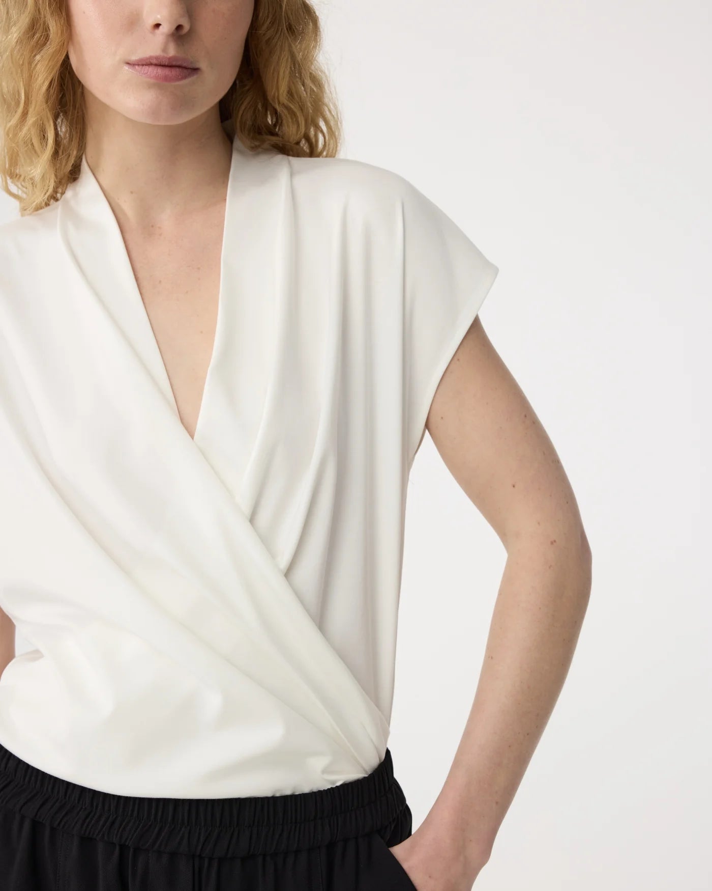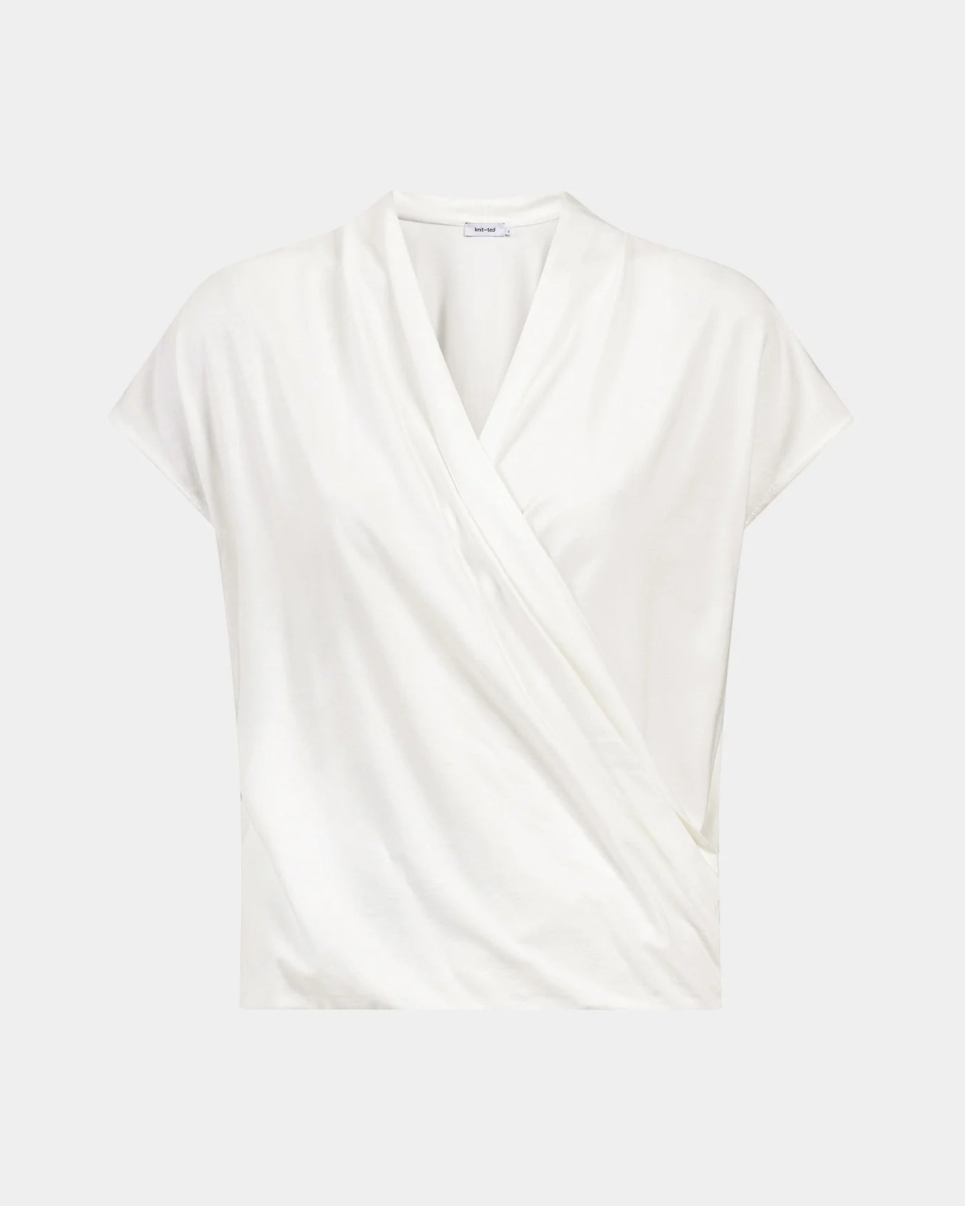 Top Jet is een veelzijdige toevoeging aan je garderobe. Haar unieke overslag creëert een soort wrap-effect, met een elegante V-hals. De korte mouwen maken haar perfect voor zowel casual als geklede gelegenheden. In top Jet zie je er op en top vrouwelijk uit.