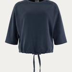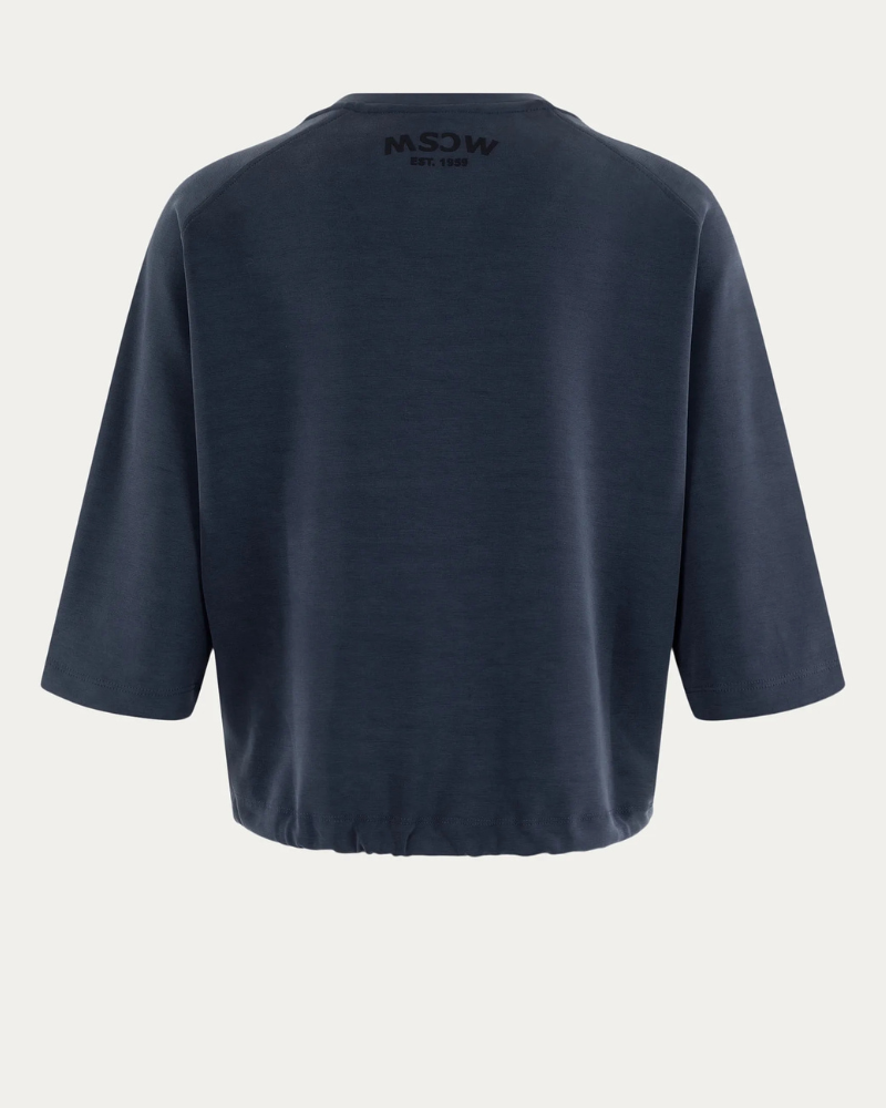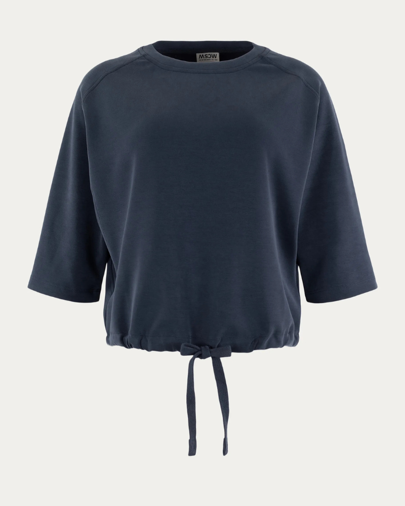 Deze Moscow sweater in donkerblauw is uitgevoerd in een soepele modalmix en heeft een boxy fit met 3/4 mouwen. Het trekkoord aan de onderzijde maakt de pasvorm verstelbaar, terwijl het subtiele logo achter bij de hals zorgt voor een verfijnde touch. Perfect voor comfortabele, zomerse looks.