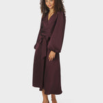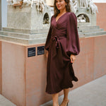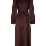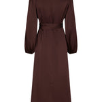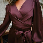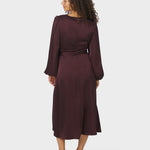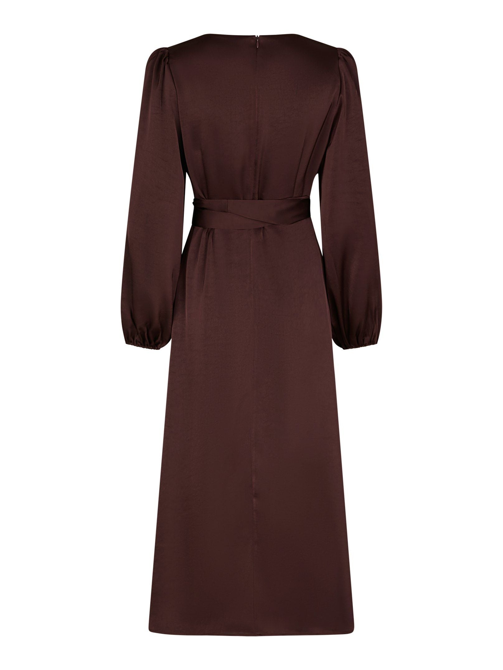 Mooie vrouwelijke jurk met een wikkelomtrekdetail. De jurk is gemaakt van een zware satijn, waardoor er een mooie glans overheen valt. Het model is 176 cm en draagt maat 36.