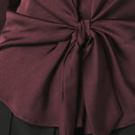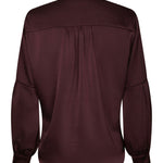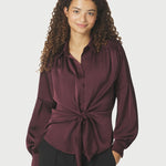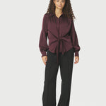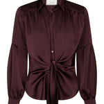Feminine blouse met plooidetails op de mouwen, evenals een knoopdetail aan de voorkant, waardoor de blouse en taille verstelbaar zijn omdat deze kan worden aangetrokken of losgemaakt. De stof is een zachte en luxe satijn.