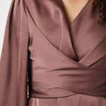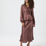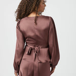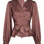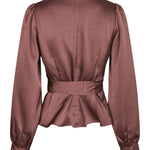 Vrouwelijke blouse in een elegante satijnen kwaliteit. De blouse heeft een strikband om de taille, die zowel voor als achter gestrikt kan worden, en een peplum zoom. De manchetten zijn elastisch.