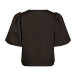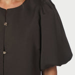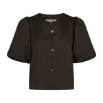 De Aisa top van Neo Noir heeft een prachtig los model met een pofmouw. De speelse knopen geven het een mooi effect. Kan ook als jasje gedragen worden. Donkerbruine kleur van het seizoen.