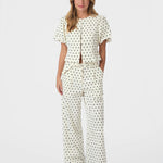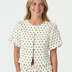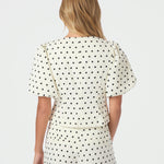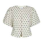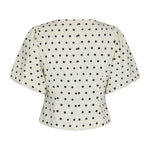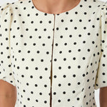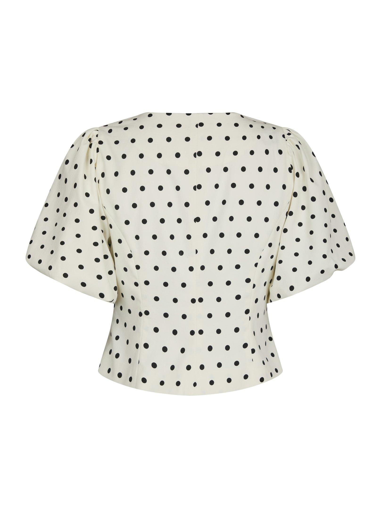 Polka dot blouse met pofmouwen. Deze blouse heeft een knoopsluiting aan de voorkant. De vorm is getailleerd rond de taille.