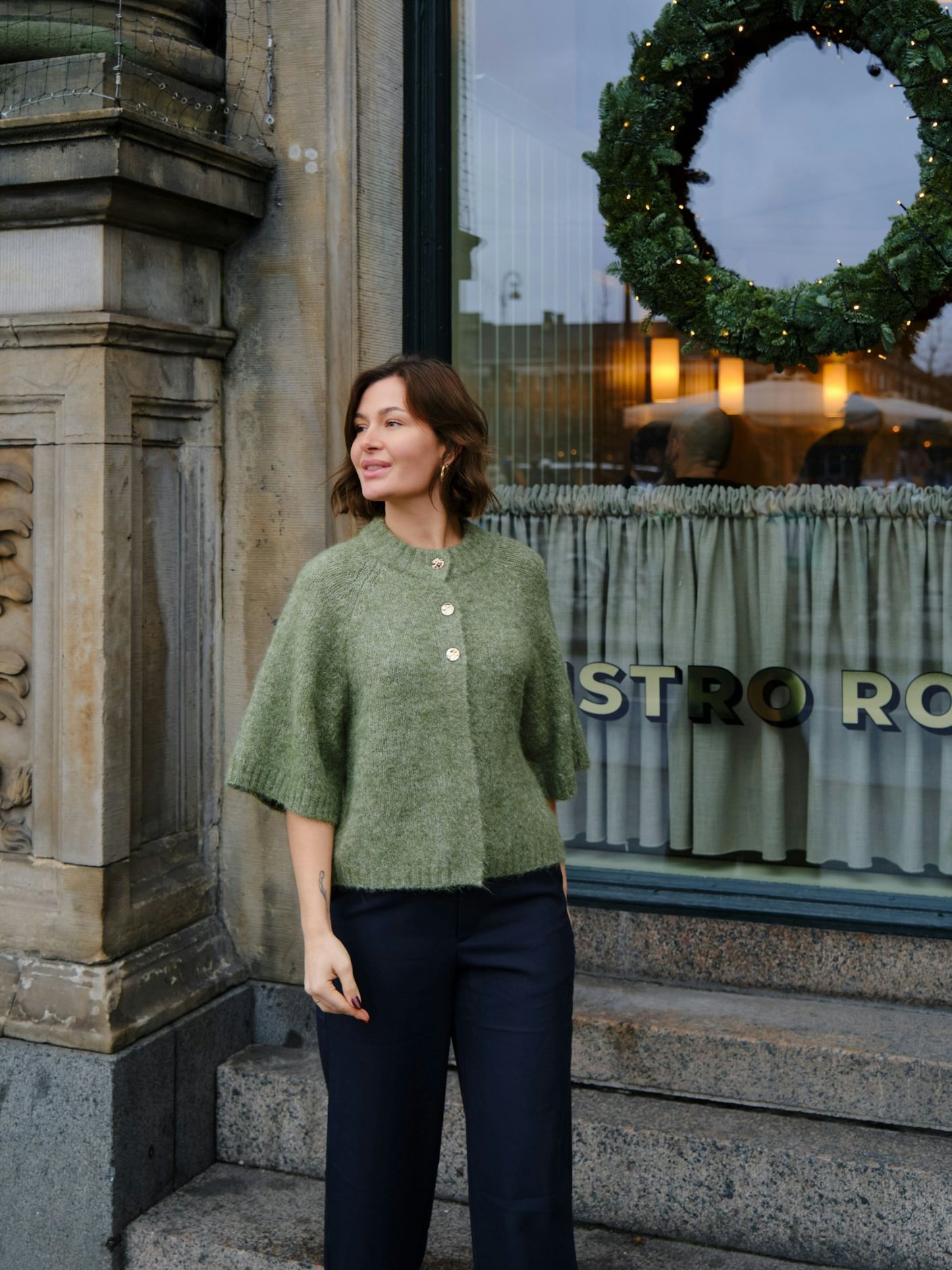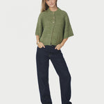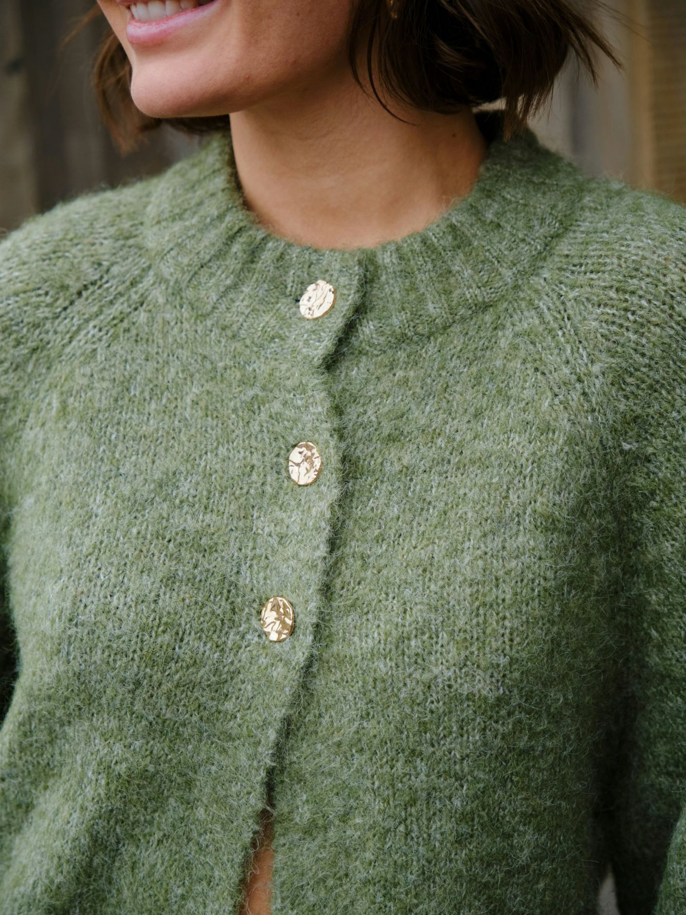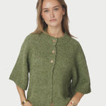 Boxy gebreide cardigan met wijde mouwen en leuke decoratieve knopen aan de voorkant. De kwaliteit is zacht en heeft een fluffy look.