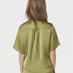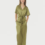 Feminiene blouse met knoopdetail aan de voorkant, waardoor de taille verstelbaar is en kan worden aangetrokken of losgemaakt. De stof is een zachte en luxe satijn. Het model is 176 cm en draagt maat 36.
