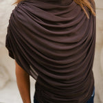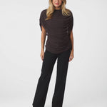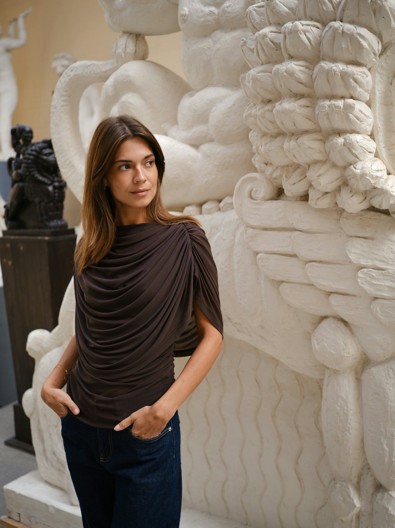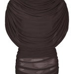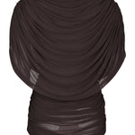 Cottuna mesh-top met smock langs de zijnaad en een drapy waterfall-effect aan de voorkant bij de hals. De top heeft een elegante, vloeiende pasvorm en is uitgevoerd in een bruine kleur met een transparante mesh-stof voor een stijlvolle look.