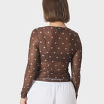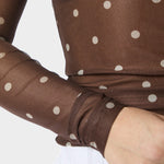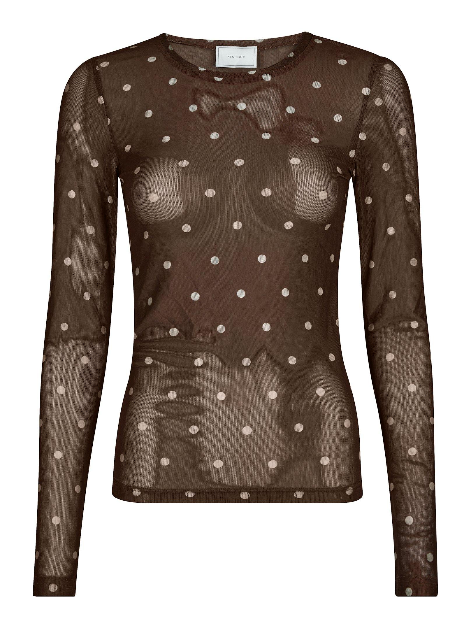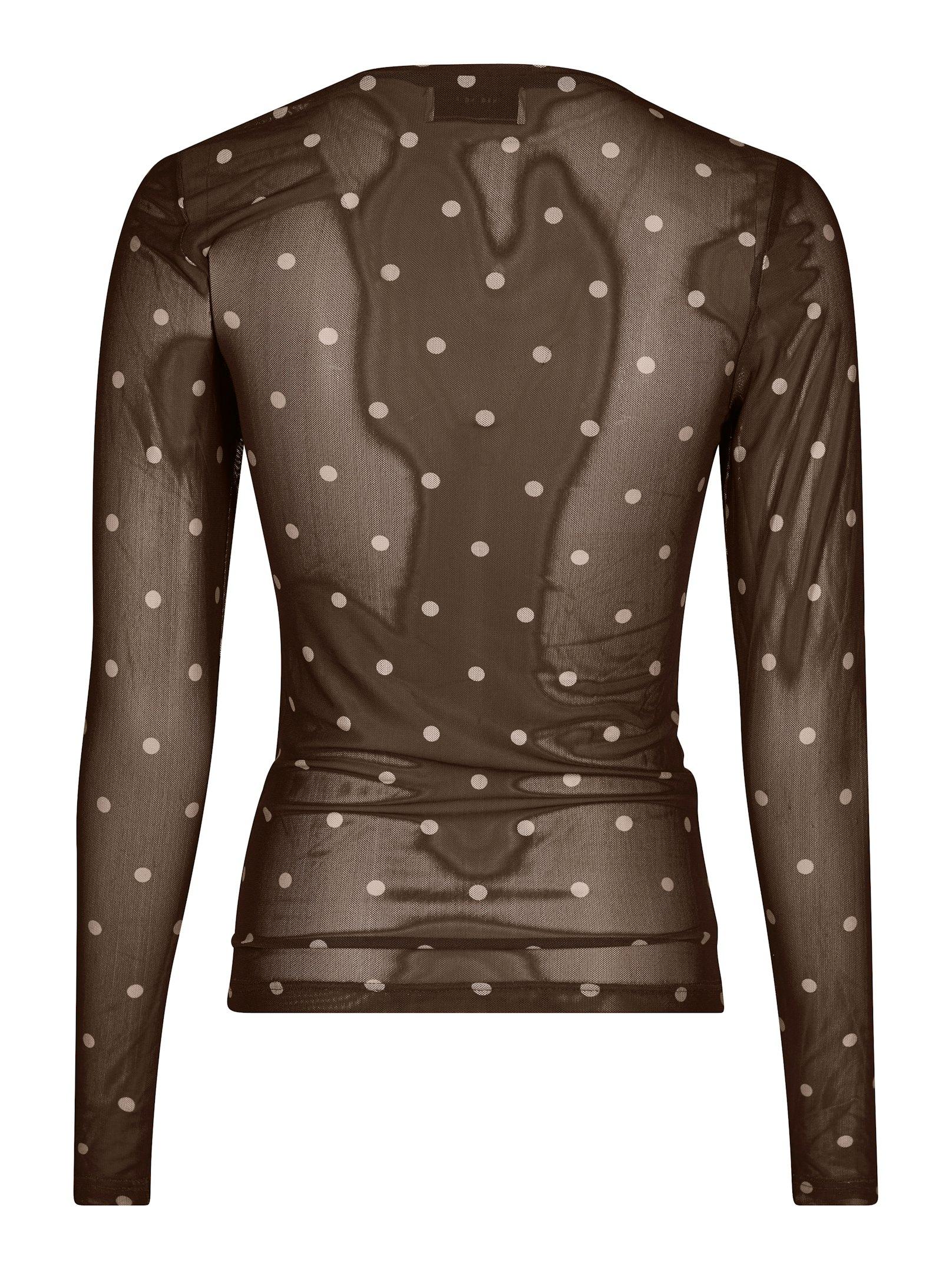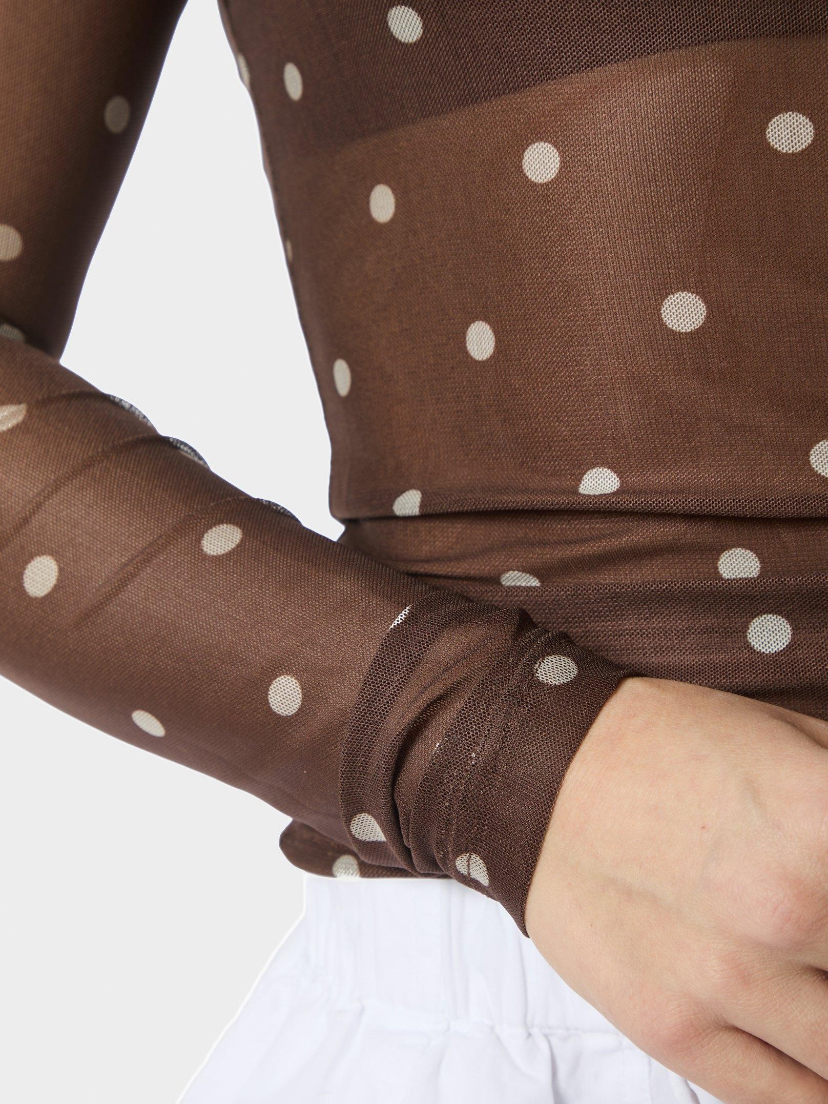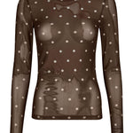 Mesh top met ronde hals en polka dots. De pasvorm is figuurvolgend en aangezien de stijl veel rek heeft, is het tegelijkertijd comfortabel.