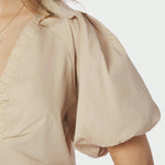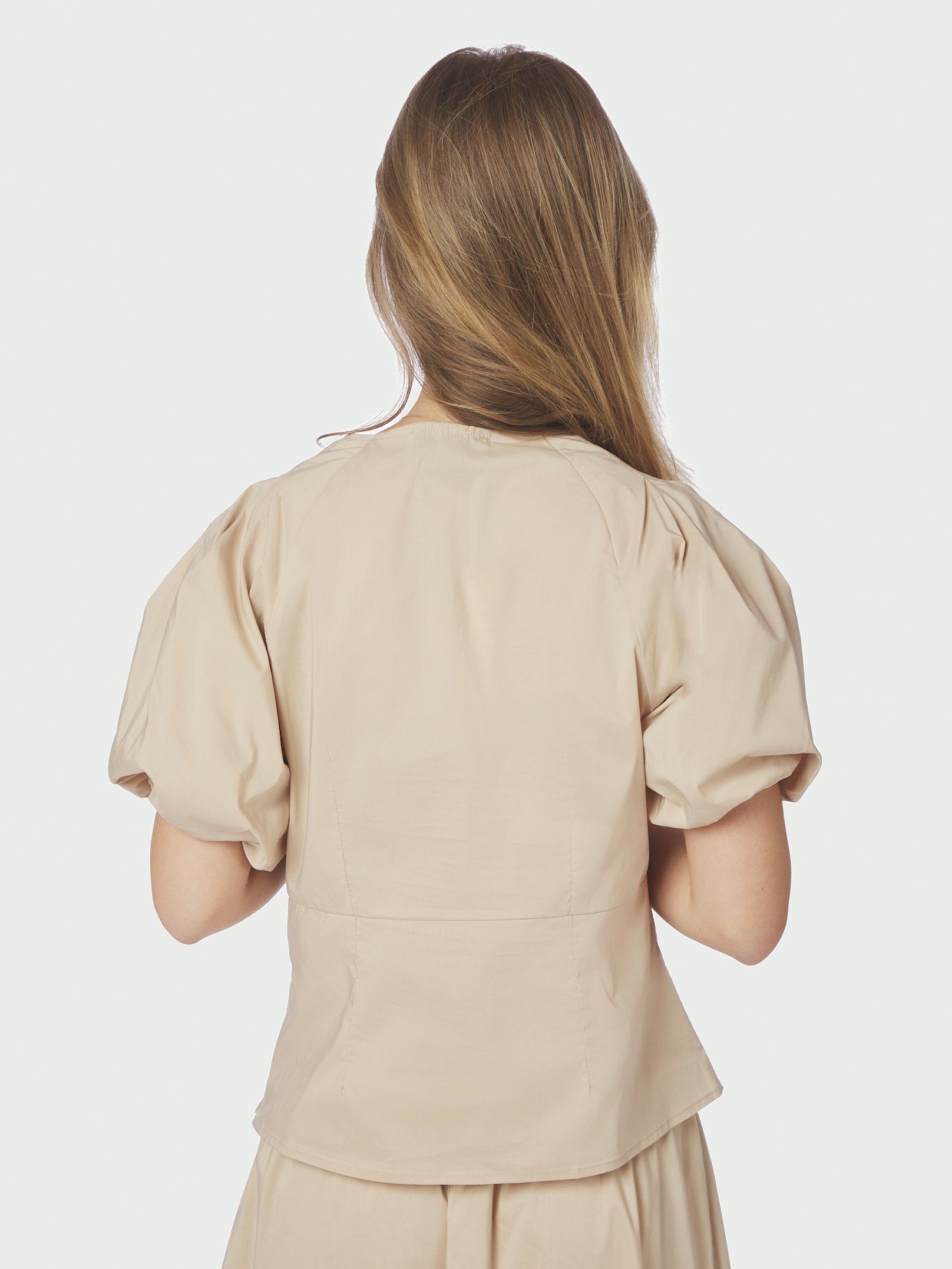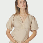 Deze beige top heeft een vrouwelijke en elegante uitstraling. Het model heeft een V-hals met subtiele plooidetails en korte pofmouwen. De top is gemaakt van een soepele, lichte stof die comfortabel draagt. Makkelijk te combineren met een broek of rok voor een verzorgde, maar ook casual look.