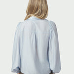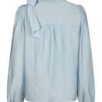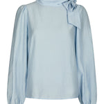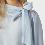 Feminiene blouse met touwtjes in de halslijn. De pasvorm is casual, met lange mouwen met elastiek in de manchetten. Het model is 176 cm en draagt maat 36.