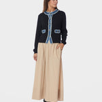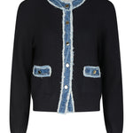 De Zelma Knit Denim Cardigan van Neo Noir is een stijlvol gebreid vest in marineblauw, afgewerkt met ruwe denimdetails langs de knopenrij, hals en zakken. Het vest heeft een klassieke sluiting met knopen en praktische voorzakken. Het model is 176 cm lang en draagt maat 36.