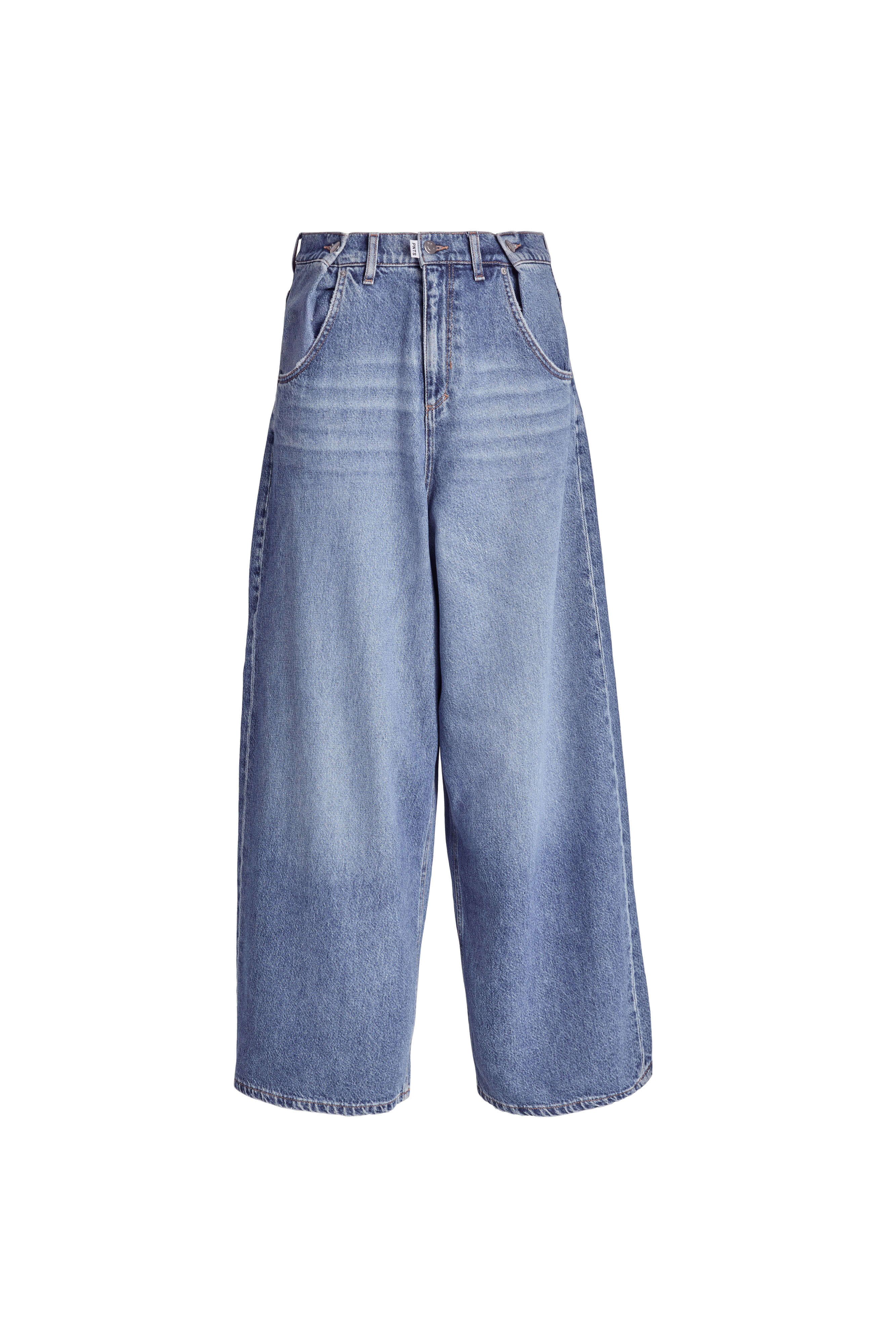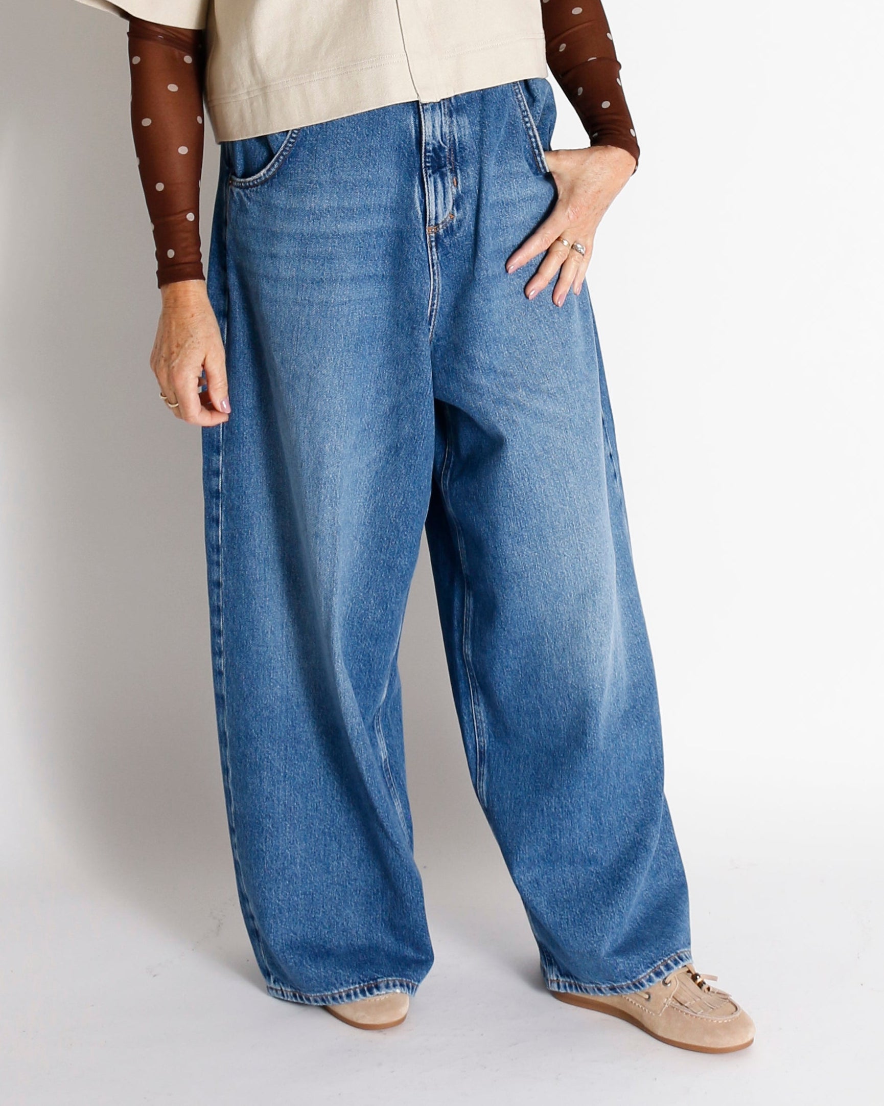 De Denim OVER THE TOP is uitgevoerd in een authentieke vintage denimkwaliteit met een medium blauwe wassing en subtiele used-effecten. De broek heeft een extreem wijde pasvorm met zeer wijde pijpen, een lage kruis en een normale taillehoogte. De geplooide, met knopen afgewerkte tailleband geeft een bijzonder detail.