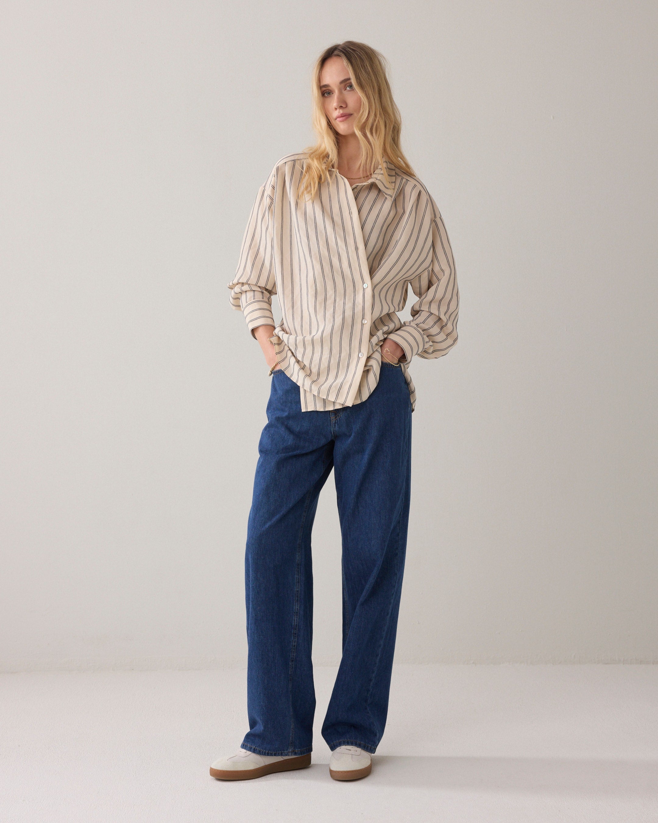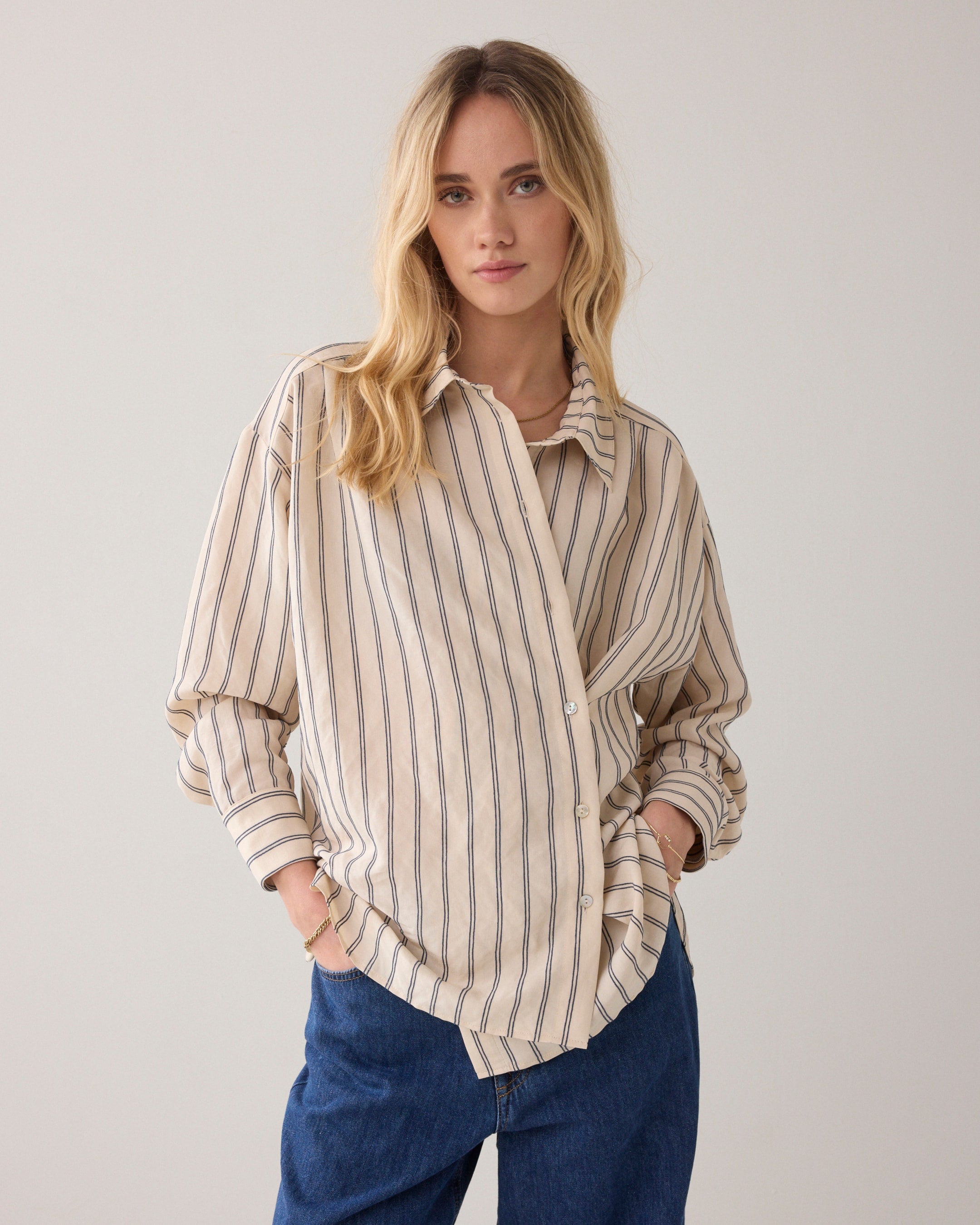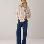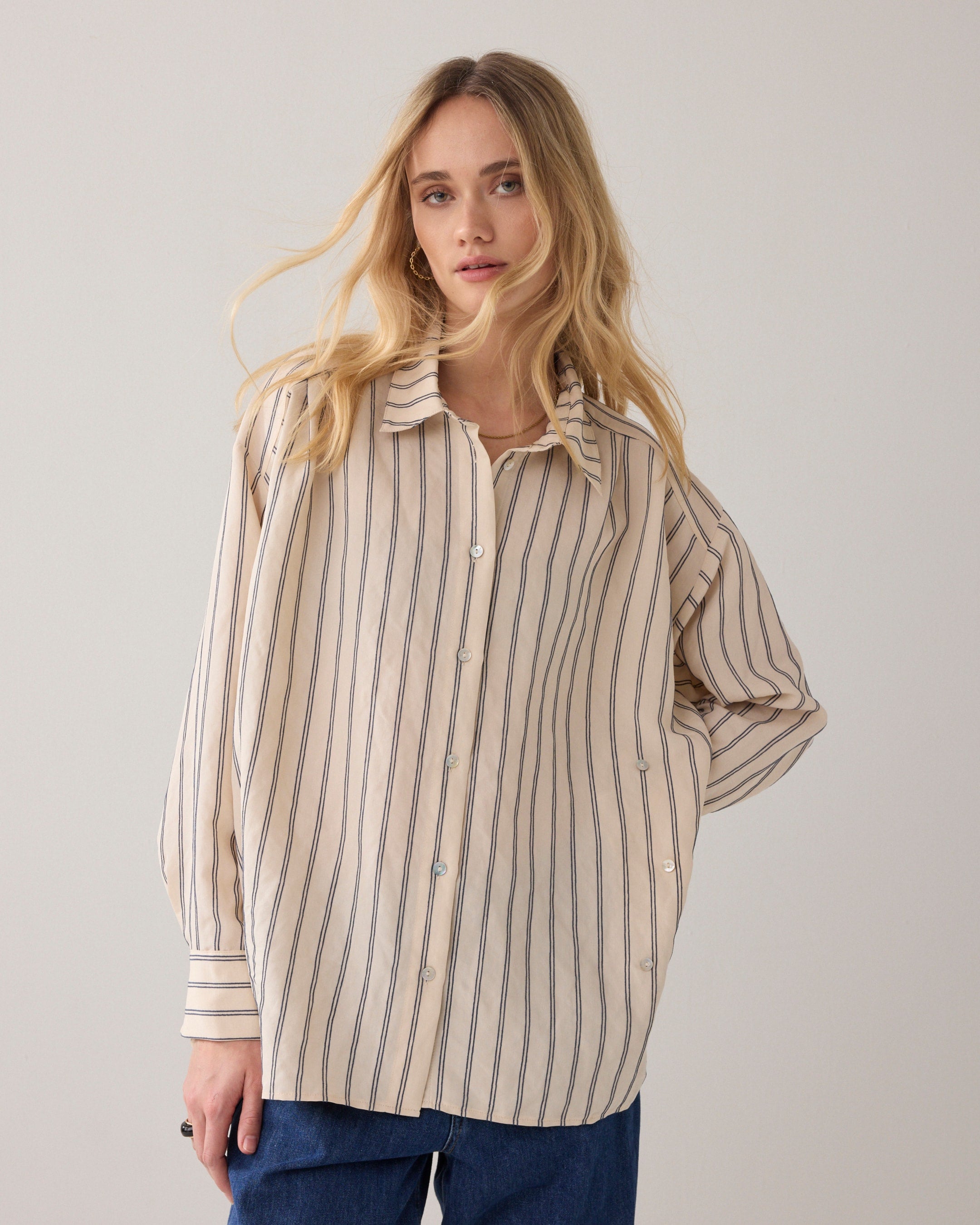 Deze blouse met verfijnde verticale strepen is een echte allrounder voor je garderobe. Het luchtige materiaal en de losse pasvorm zorgen voor een comfortabel draaggevoel, terwijl de klassieke kraag en knoopsluiting een tijdloze uitstraling geven. De subtiele strepen verlengen het silhouet en maken de blouse zowel casual als gekleed draagbaar.