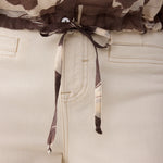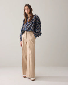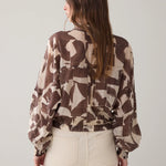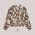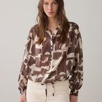 Blouse van licht transparante stof met een graphic print. Het model heeft een boxy fit, waarbij het koordje in de zoom en elastiek aan de achterkant een subtiel blousoneffect geeft. De blouse is voorzien van parelmoer knoopjes, verlaagde schouders met rimpeling bij de pas en gesmokte mouwboorden.
