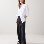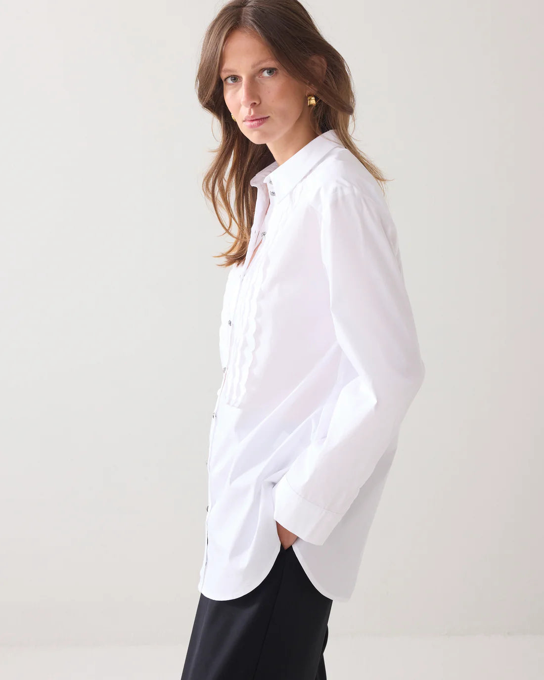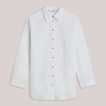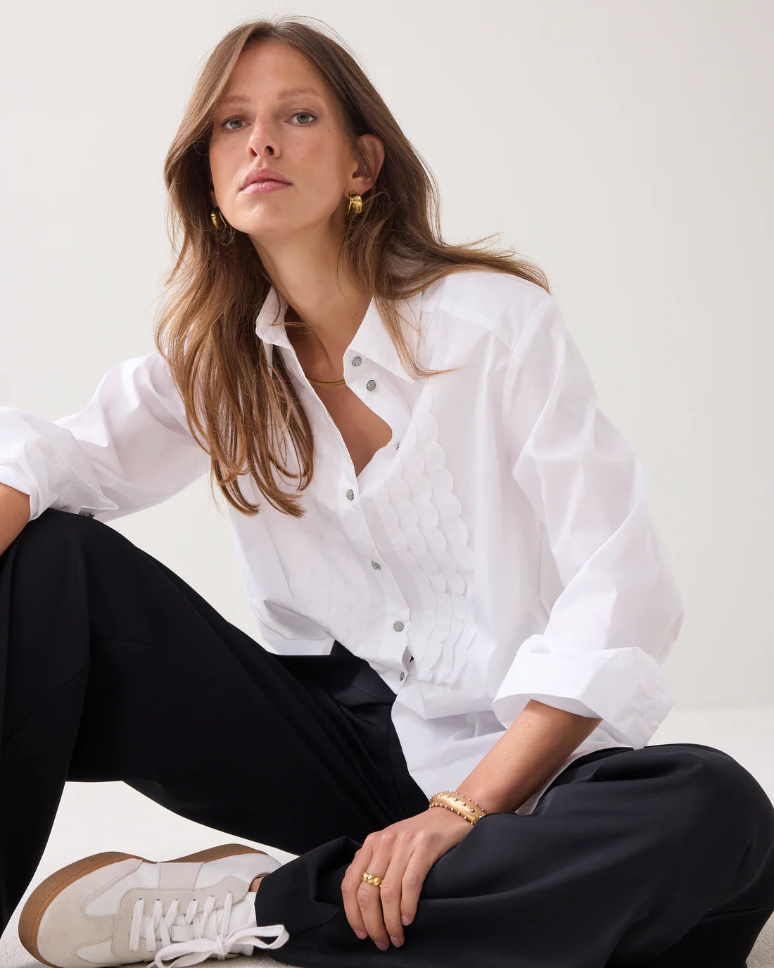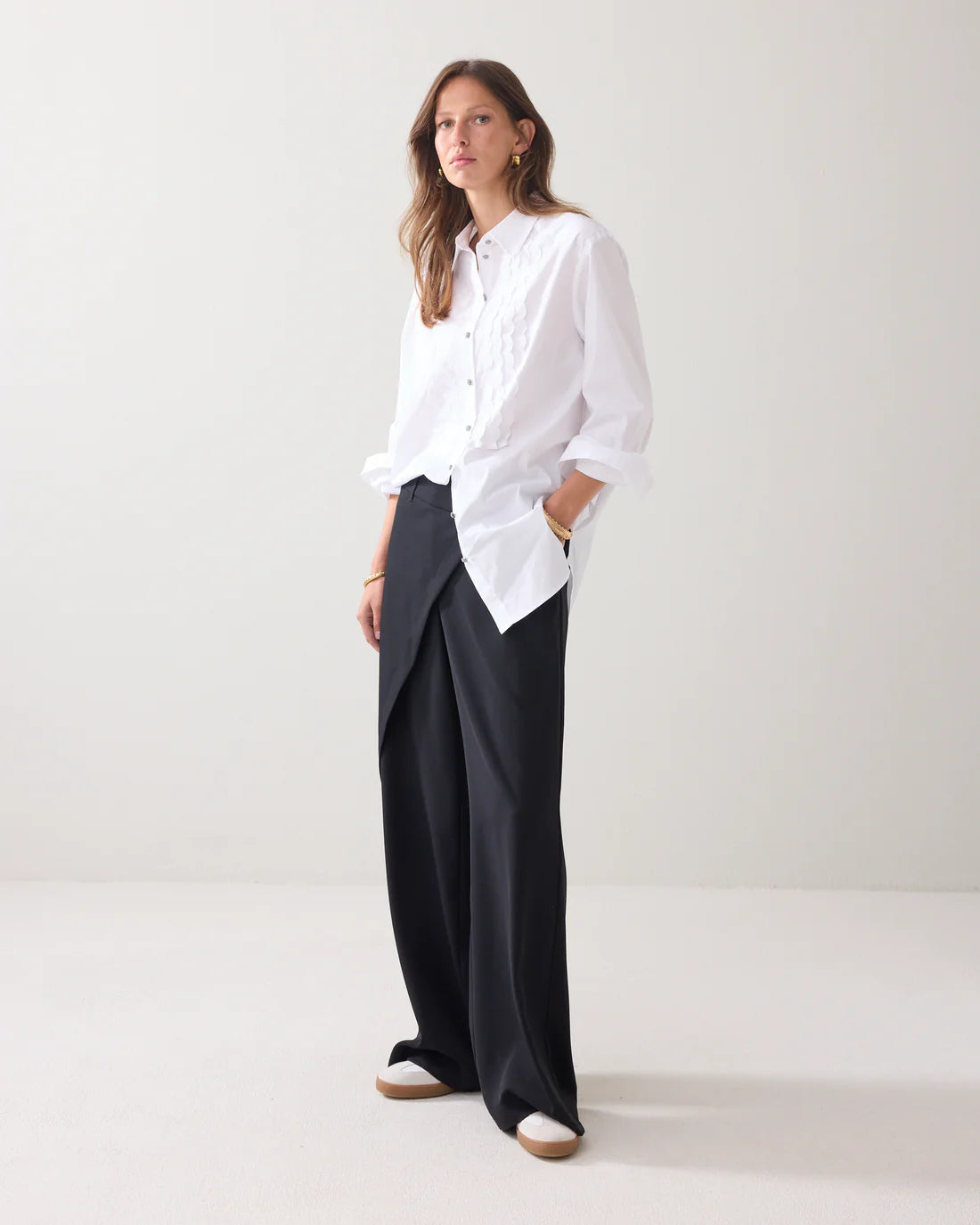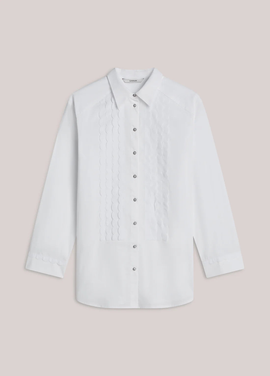 Overhemdblouse van stevige poplin met smokingdetails. Afgewerkt met lasercut stroken en diamantknoopjes. Ook op de manchetten zijn lasercuts en een knoopje toegevoegd.