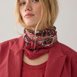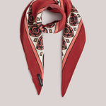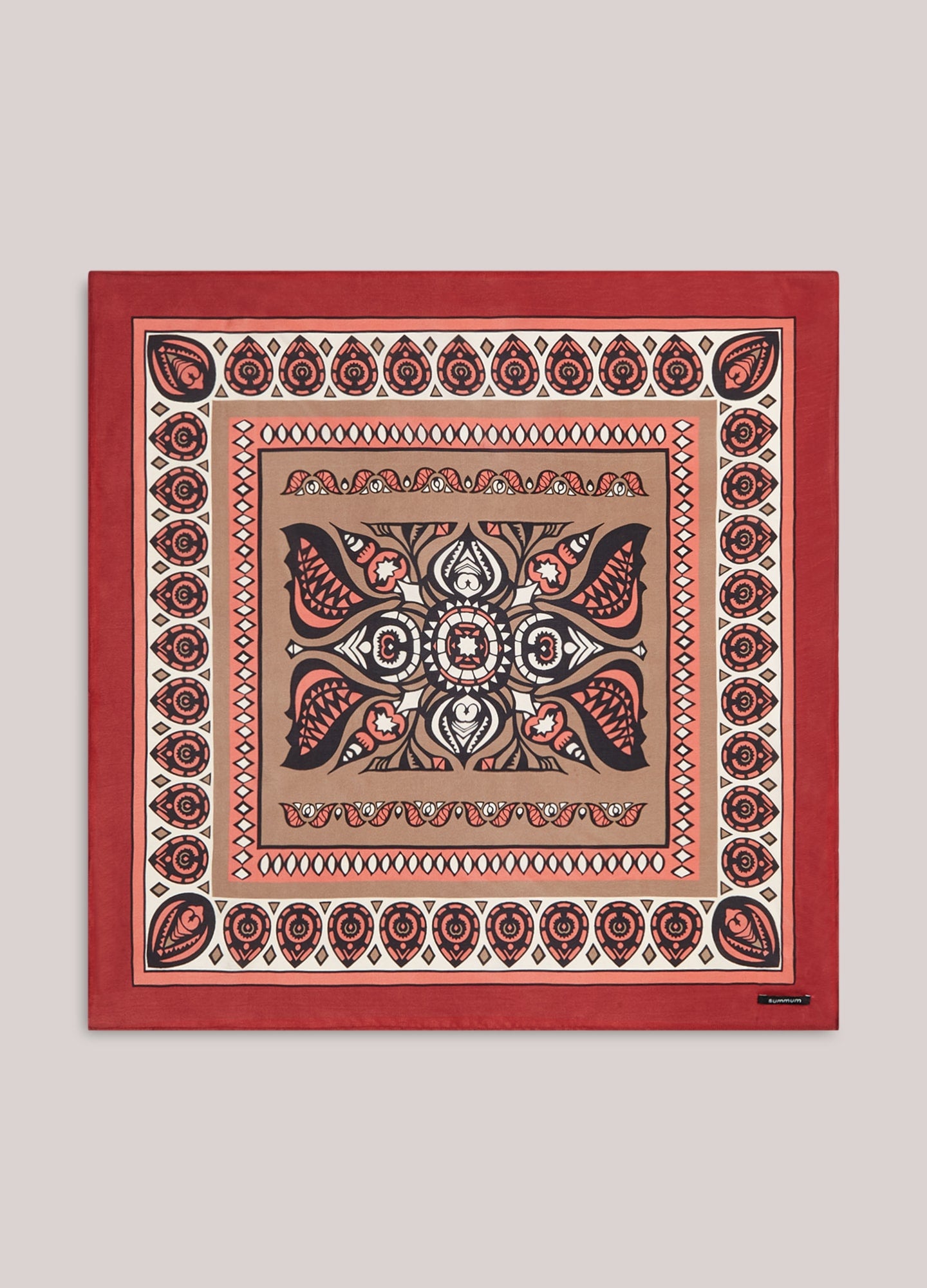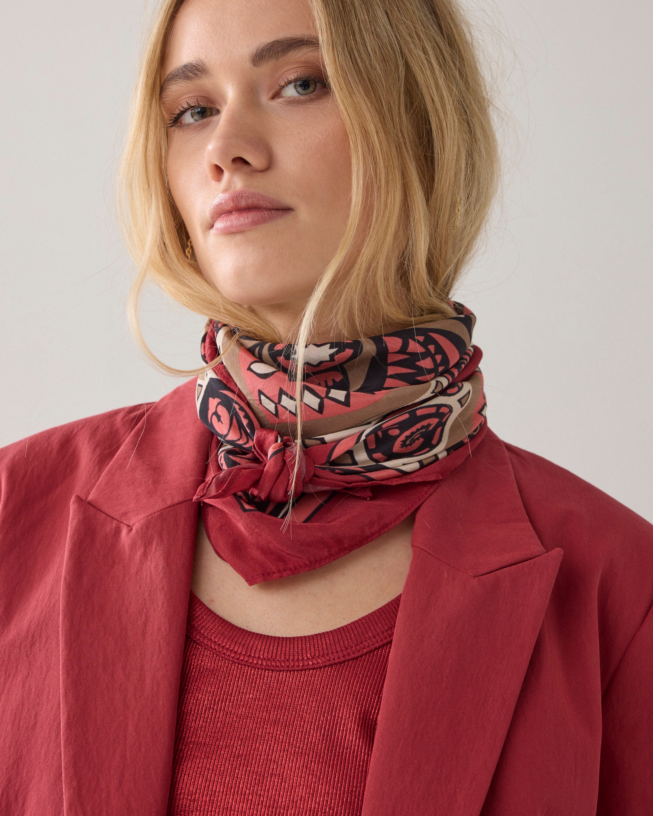 Geef je outfit een stijlvolle finishing touch met deze sjaal van Summum. De warme roodtint in combinatie met de grafische print in crème en zwart zorgt voor een krachtige, elegante uitstraling. De soepele, lichtgewicht stof valt mooi en is op verschillende manieren te dragen: los om de hals, nonchalant geknoopt of als accessoire aan je tas.
