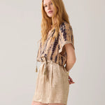 Deze luchtige short heeft wijde pijpen en een allover metallic coating. De short heeft een hoge taille met strikceintuur. De short valt soepel en heeft een dunne stof.