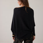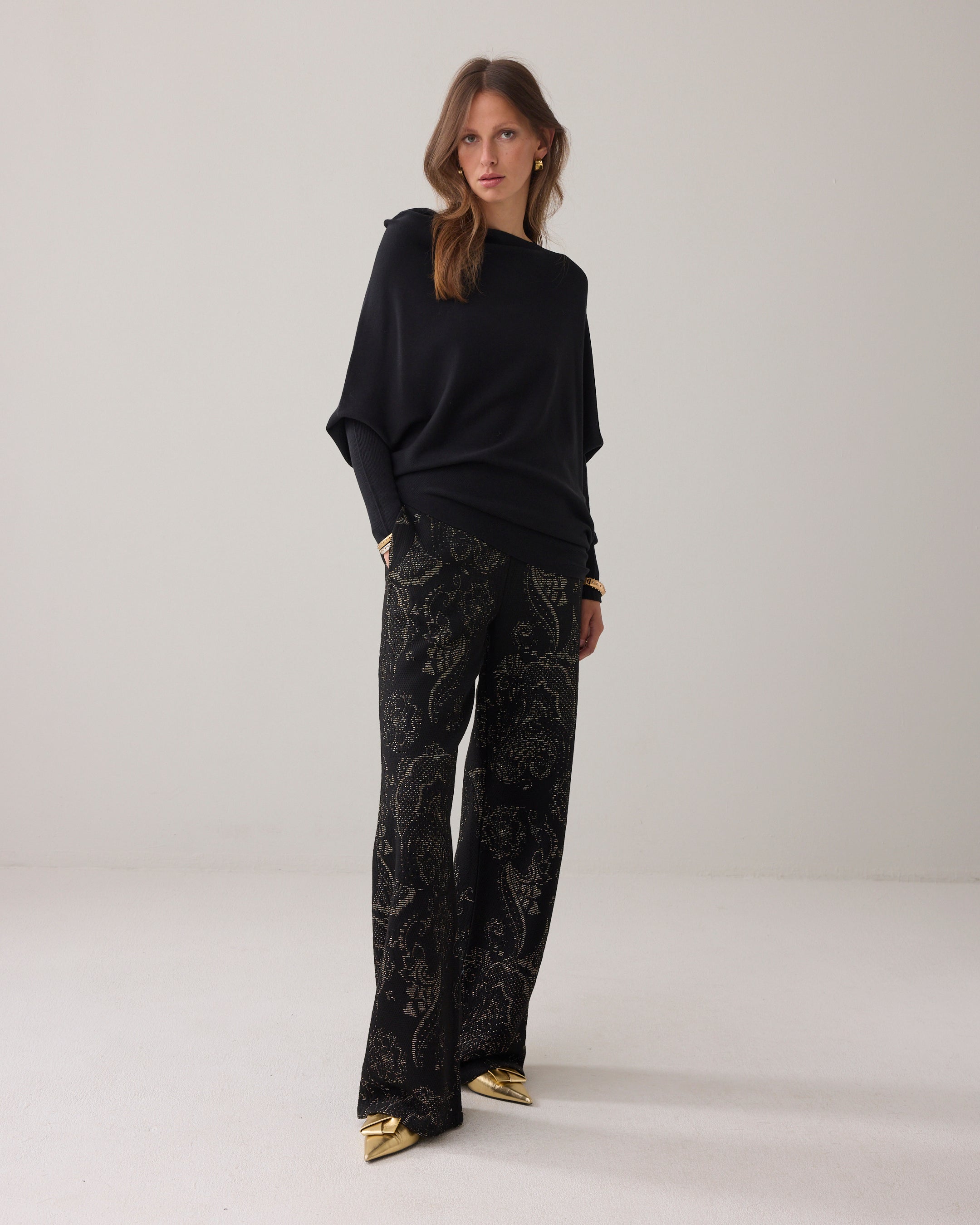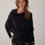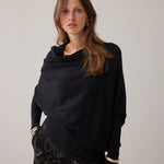 Sophisticated, zachte trui met een asymmetrisch ontwerp en een hele brede boothals. Het model heeft aangesloten, strakke mouwen en is rondgebreid zonder naden voor een gladde afwerking. Gemaakt van een soepele viscoseblend met subtiele ingebreide ribdetails.
