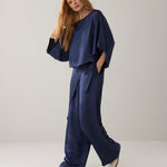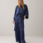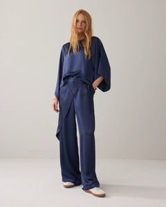 Top van een soepelvallende, zwaardere silky touch kwaliteit. De top heeft een boothals, rechte kimonomouwen en een boxy lengte met kleine splitjes aan de zijkant.