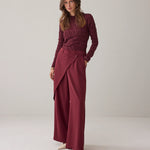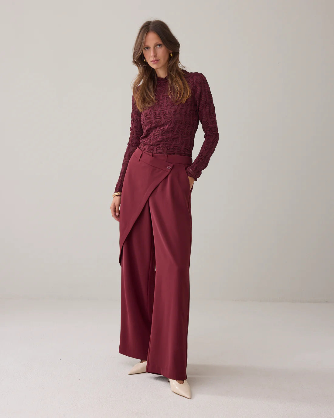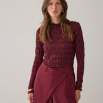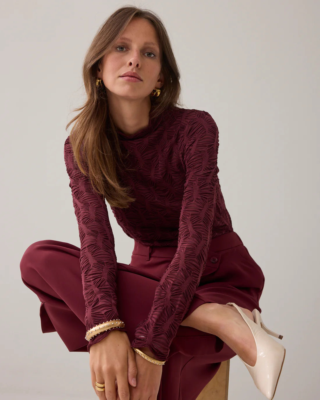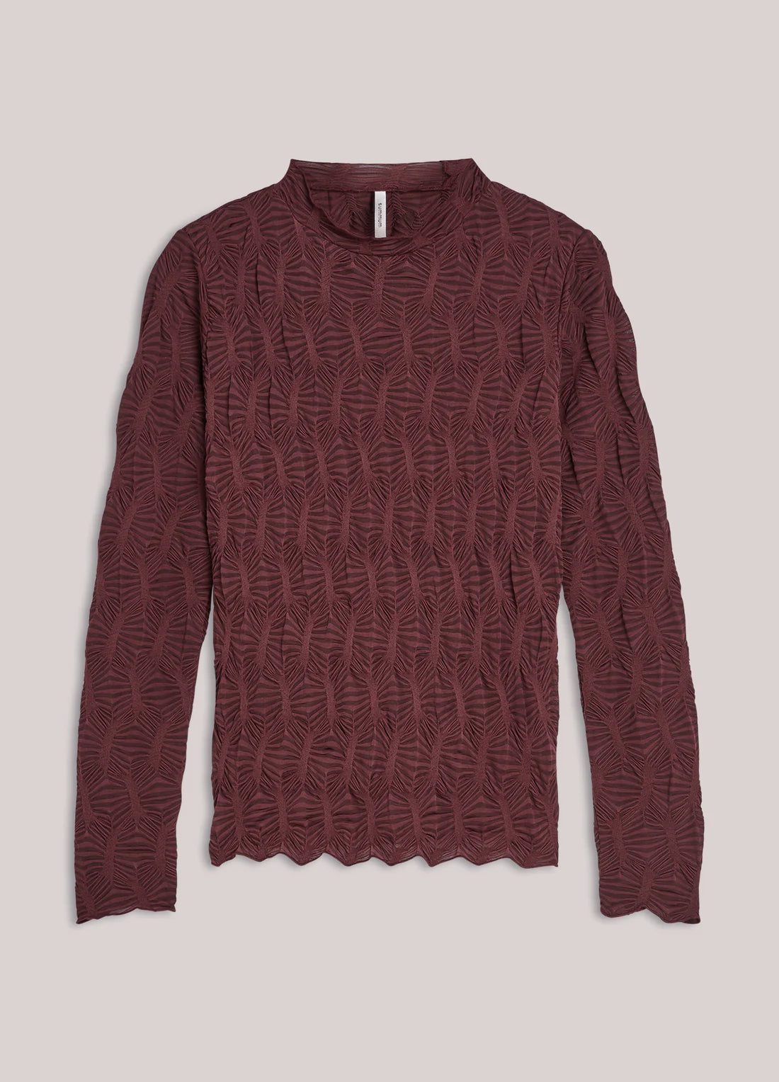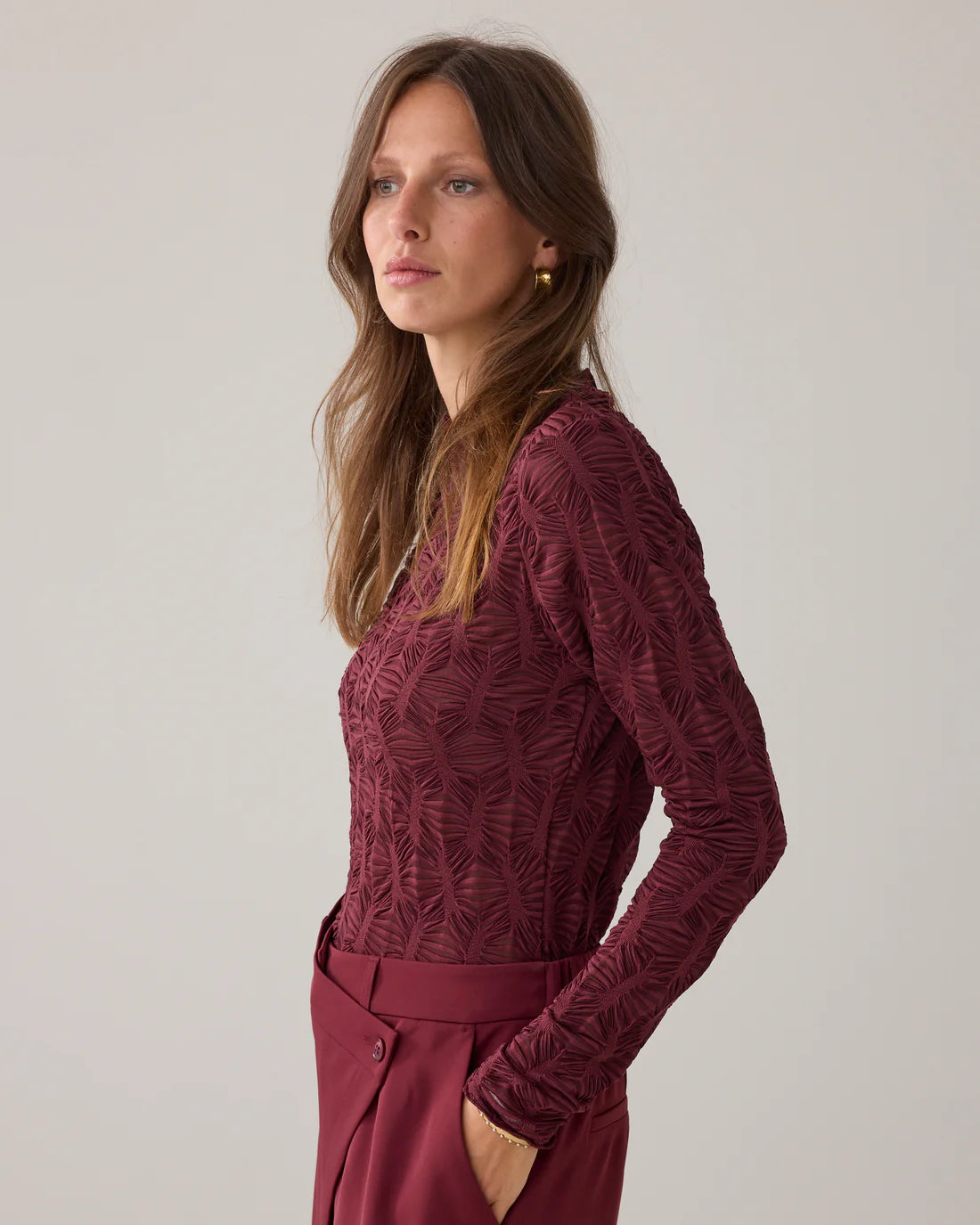 Top van een rekbare, transparante jersey uitgevoerd in een ruitjespatroon. De top heeft lange mouwen, een ronde hals en een aangesloten pasvorm. Alle zomen zijn afgewerkt met fijne babylock-stiksels. De top is mooi te combineren met een blazer, gilet of op een stijlvolle jeans.